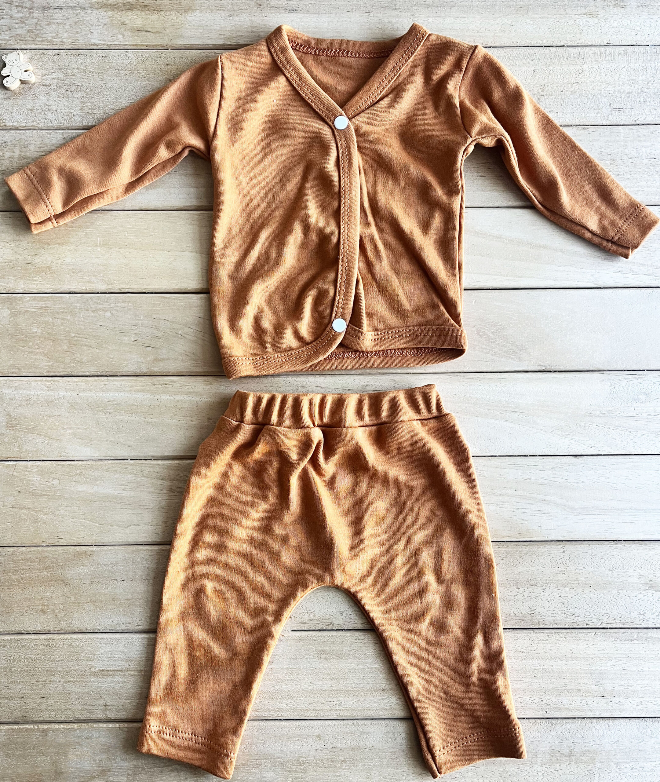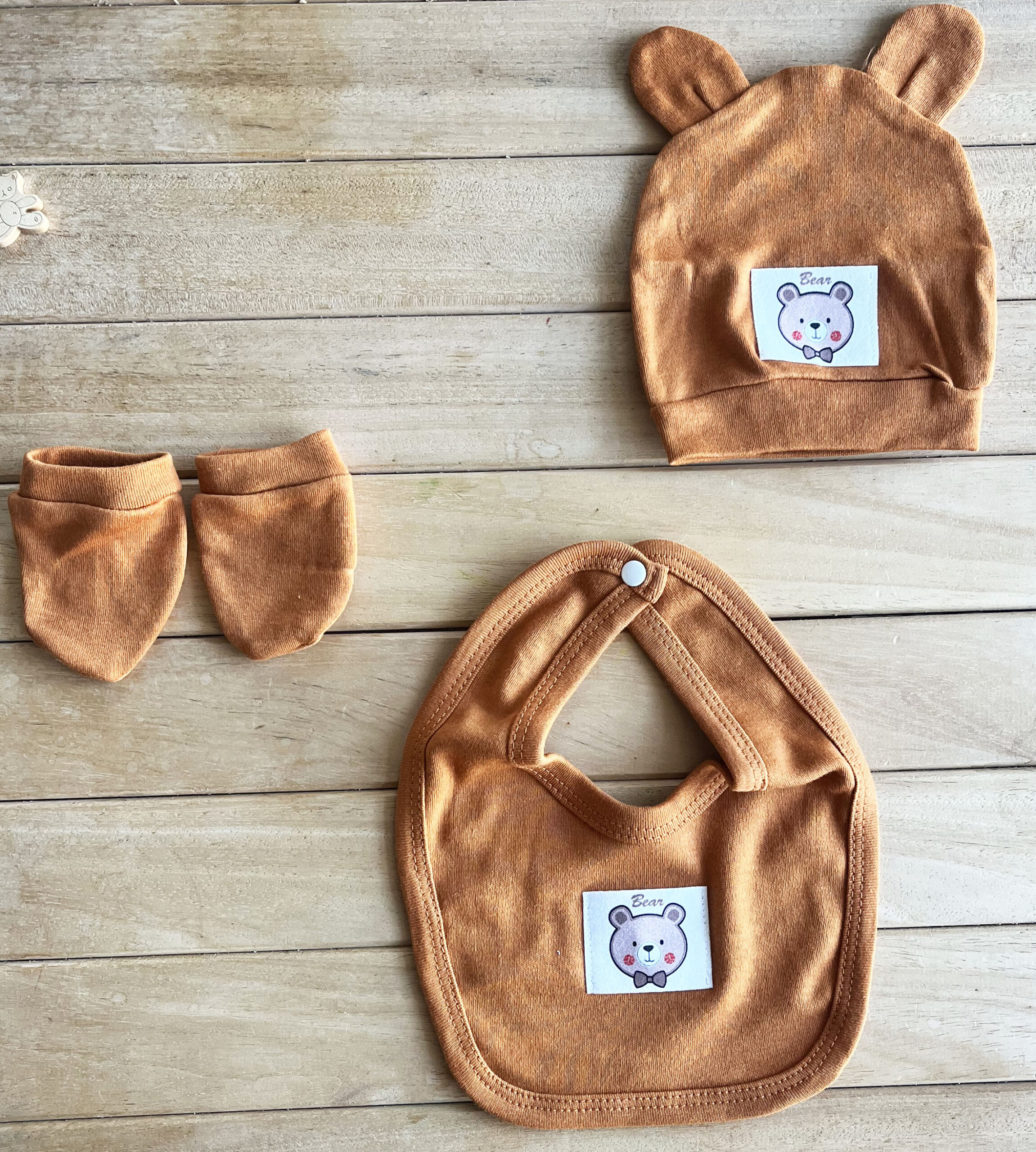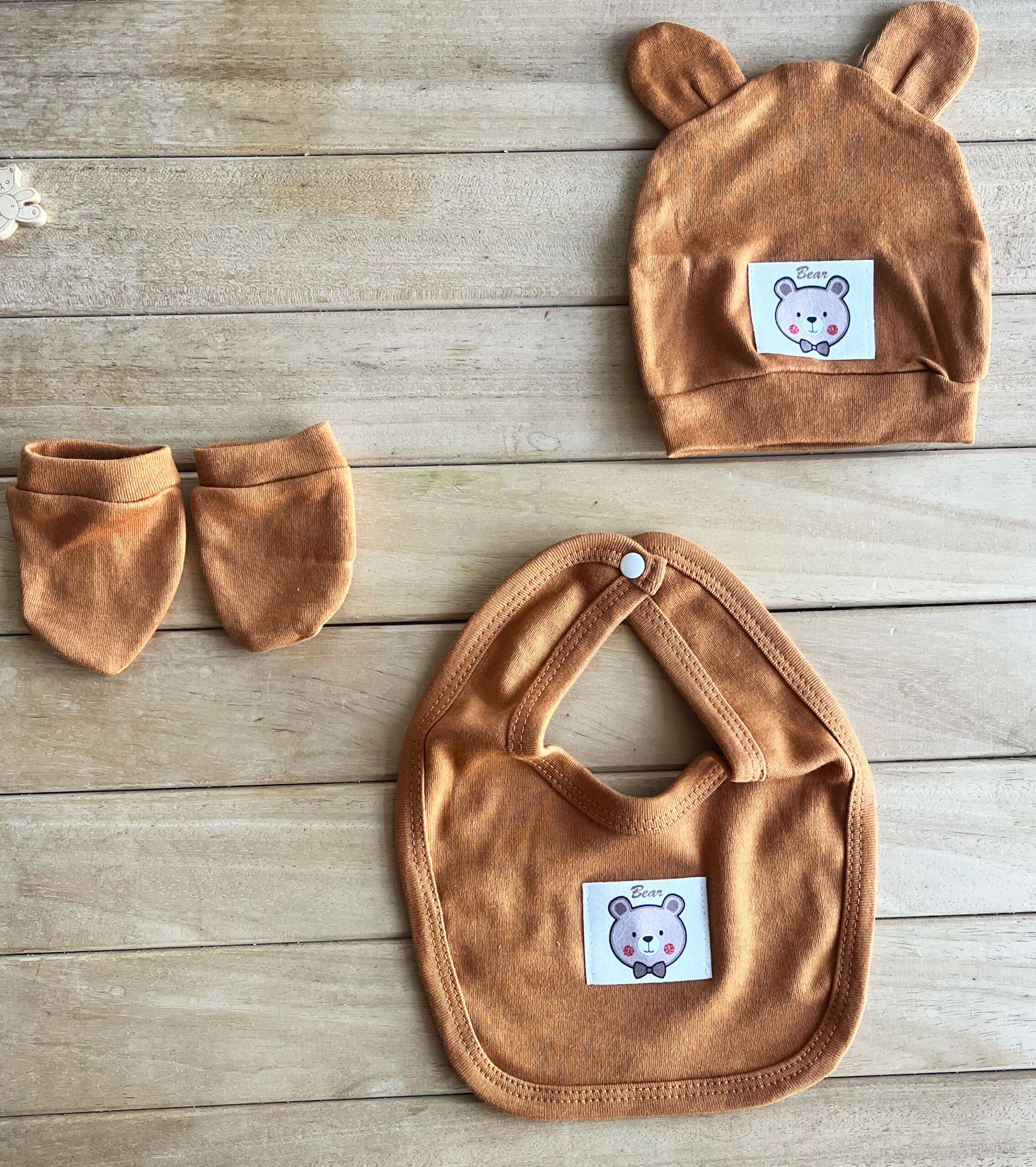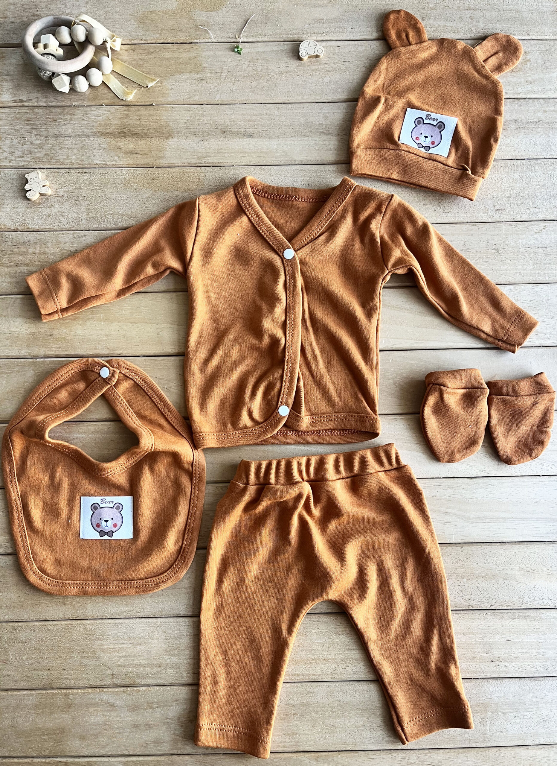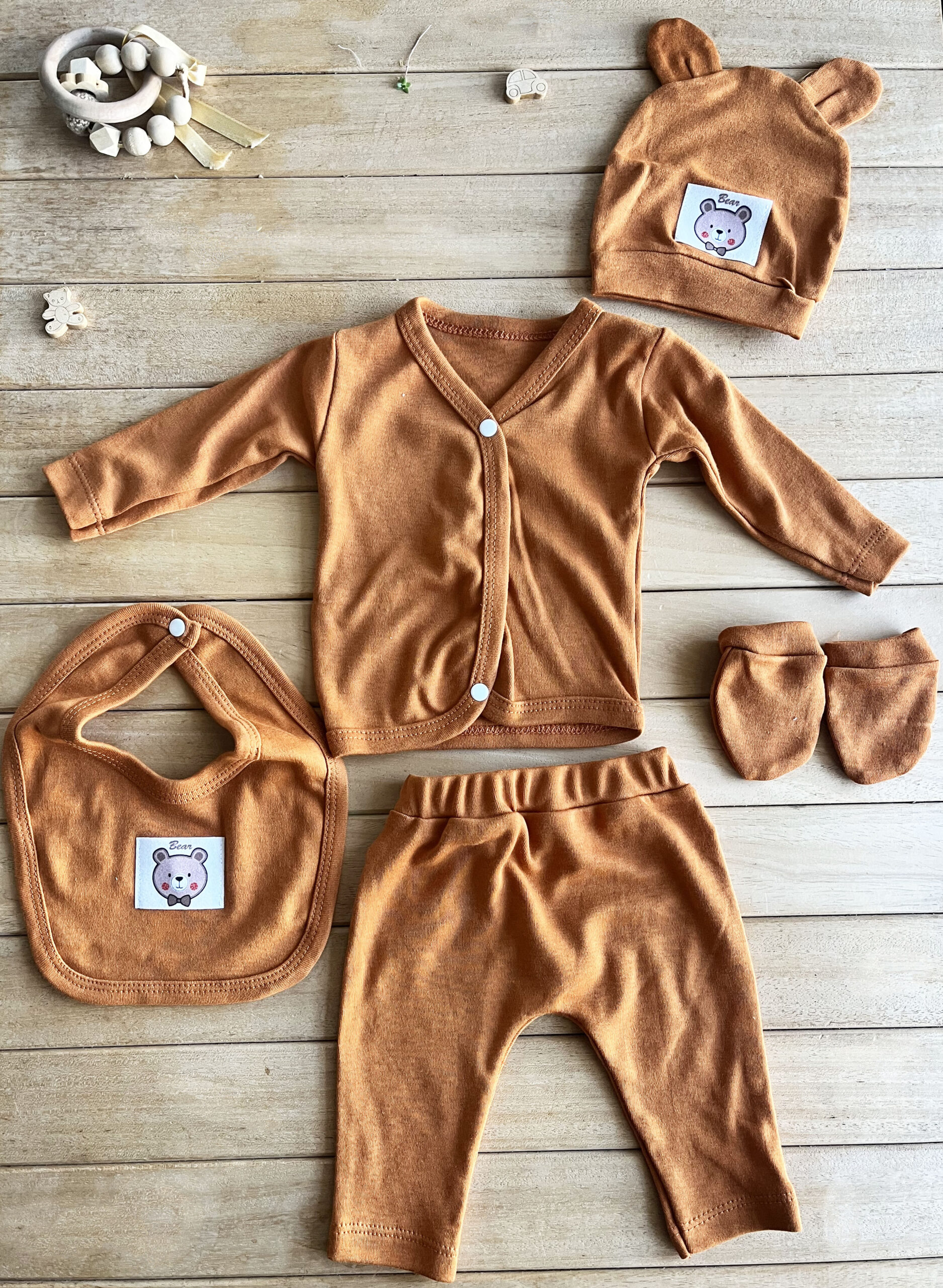 Ayıcık Desenli %100 Pamuk 5’li Yenidoğan Hastane Çıkışı Seti – Tarçın Rengi