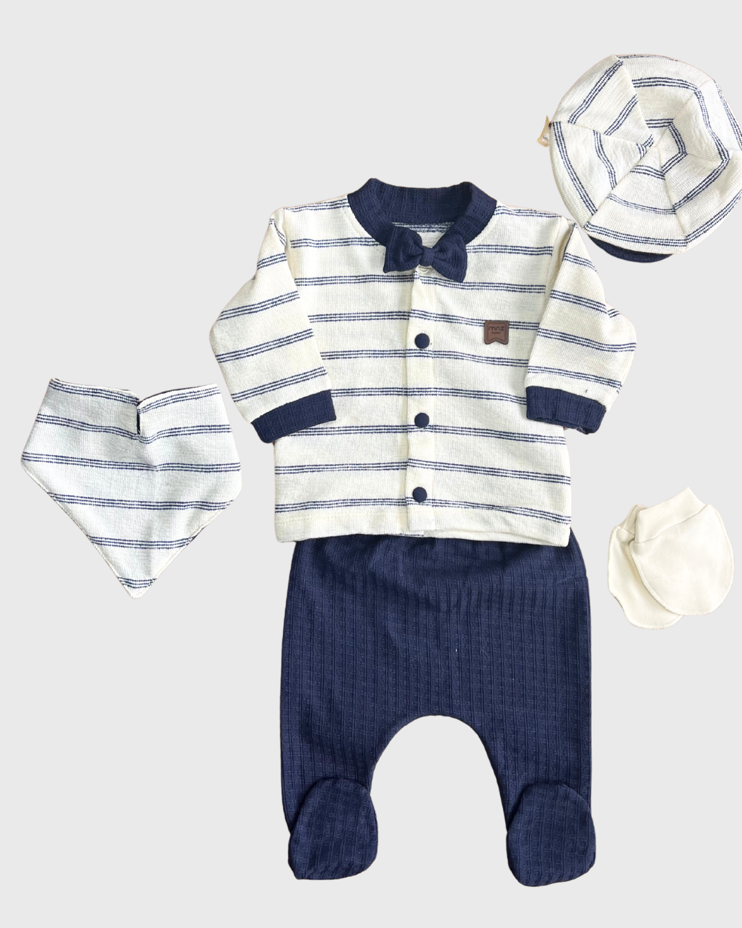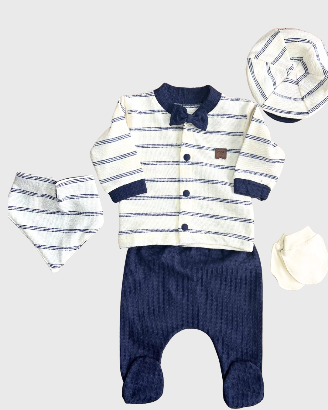 🎩 Miniycool 7092 MNZ Çizgili Smokin Erkek Bebek 5’li Hastane Çıkışı Set – Şık & Konforlu Yeni doğan erkek bebekler için özenle tasarlanmış bu çizgili smokin tarzı 5’li hastane çıkışı seti, bebeğinizin ilk günlerinde hem zarafeti hem de konforu bir arada sunar.; %100 pamuklu ve nazik kumaş dokusu sayesinde hassas cildi korur ve rahat kullanım sağlar.;
