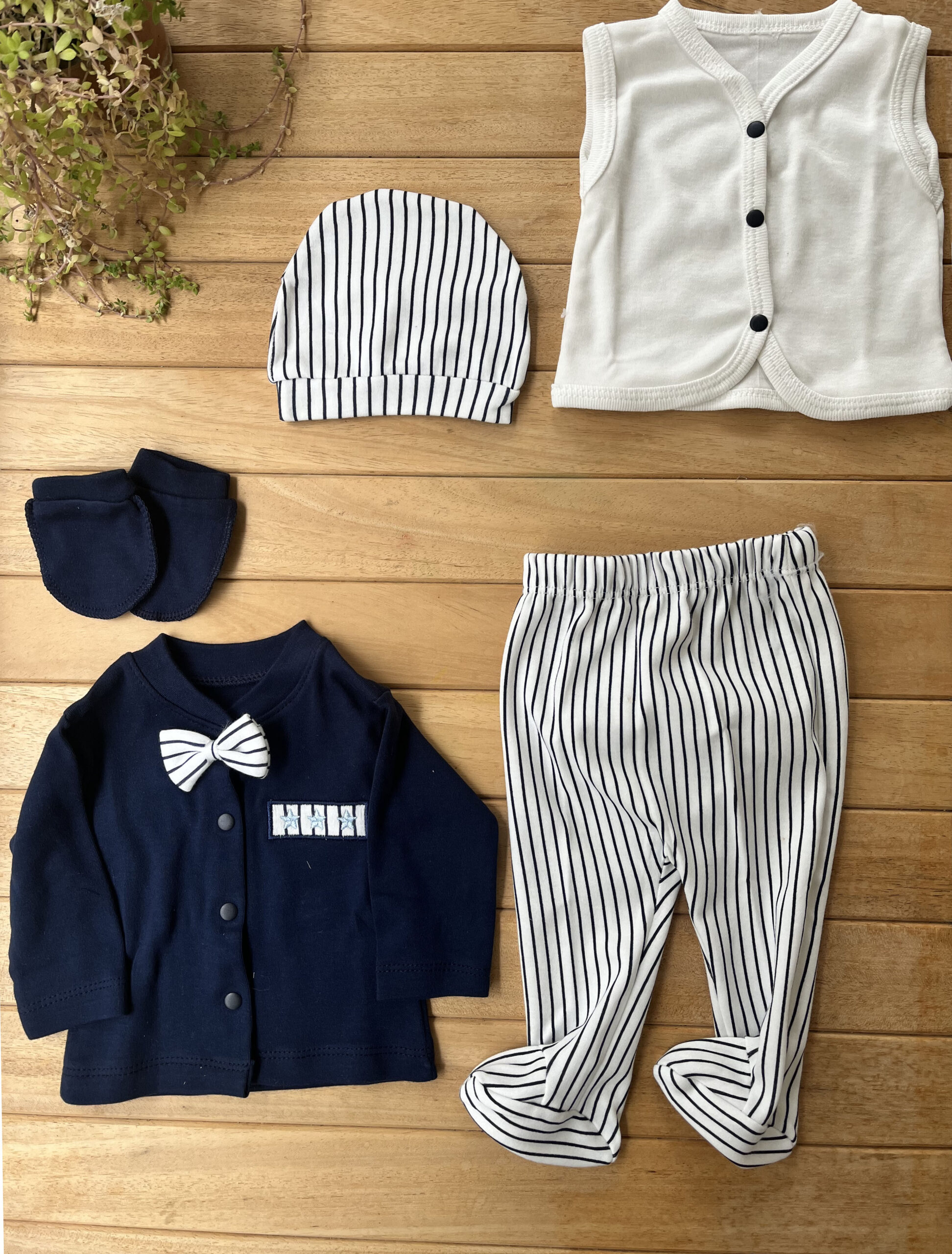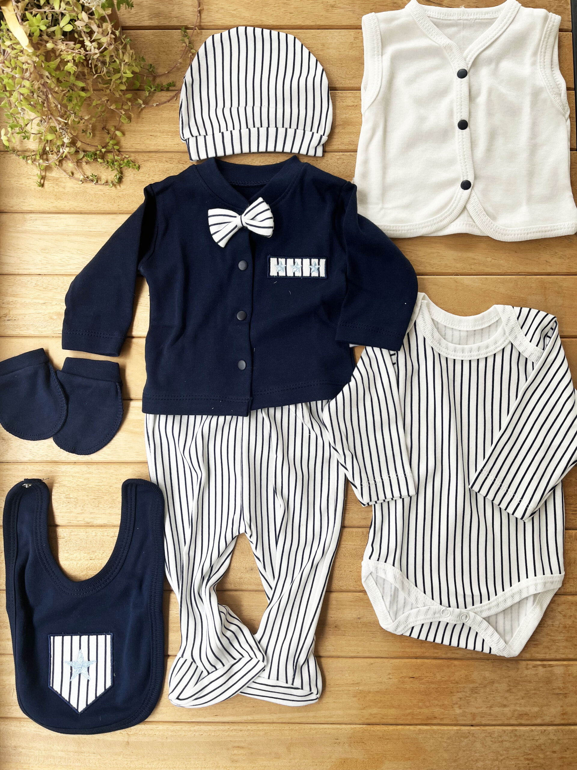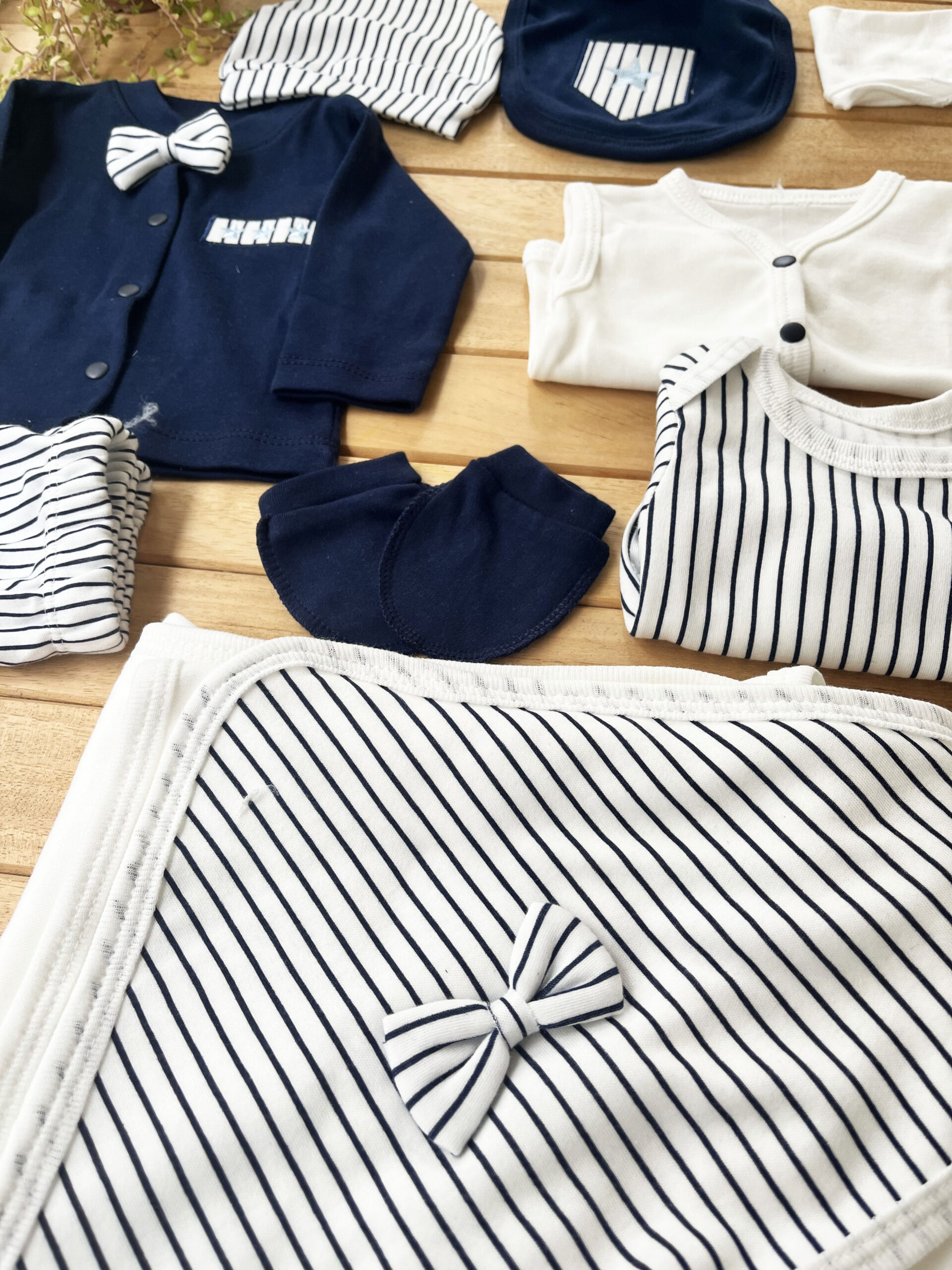 %100 Pamuk Yenidoğan Erkek Bebek Hastane Çıkış Seti 10 Parça – Çizgili Desenli İndigo