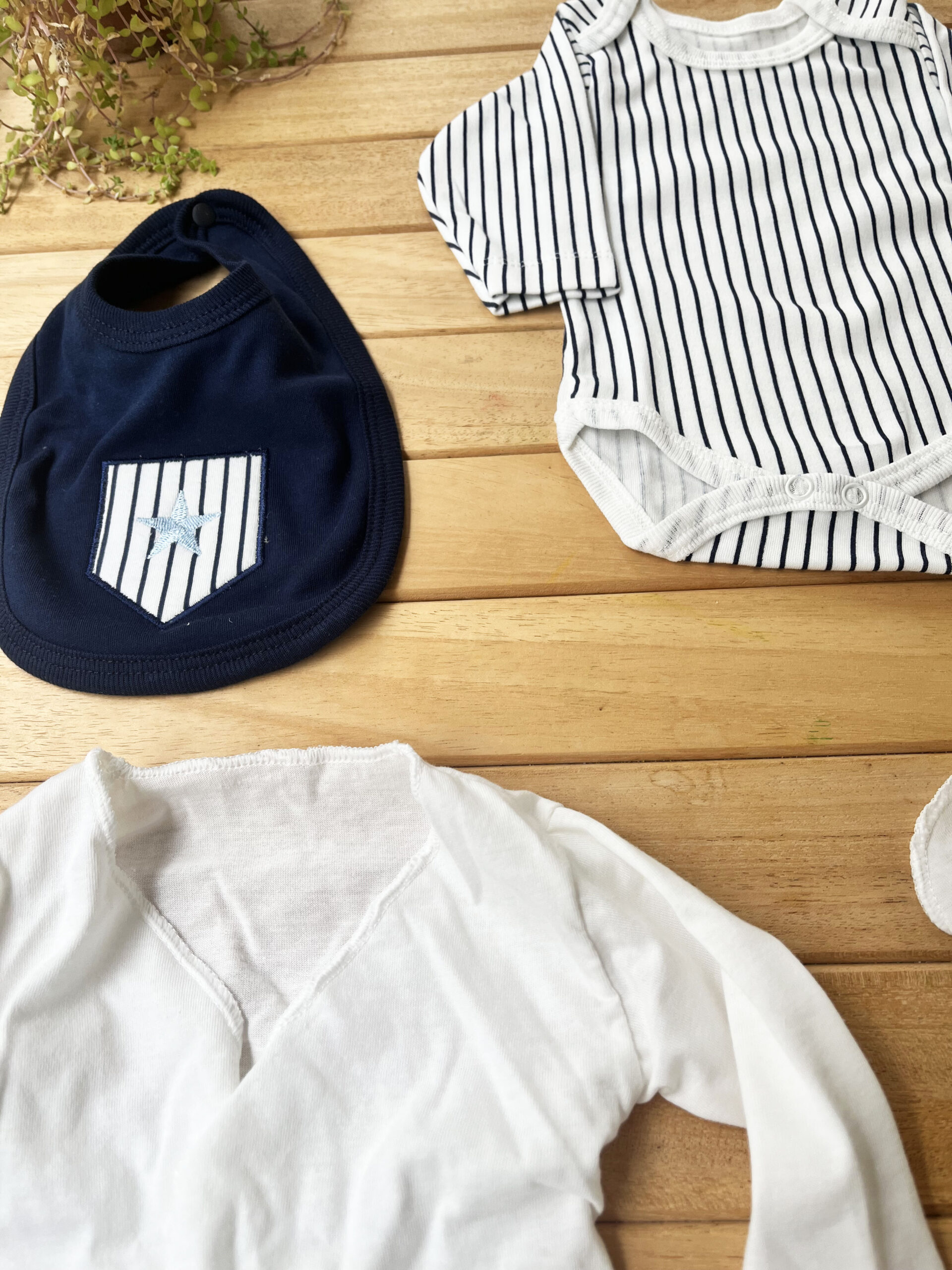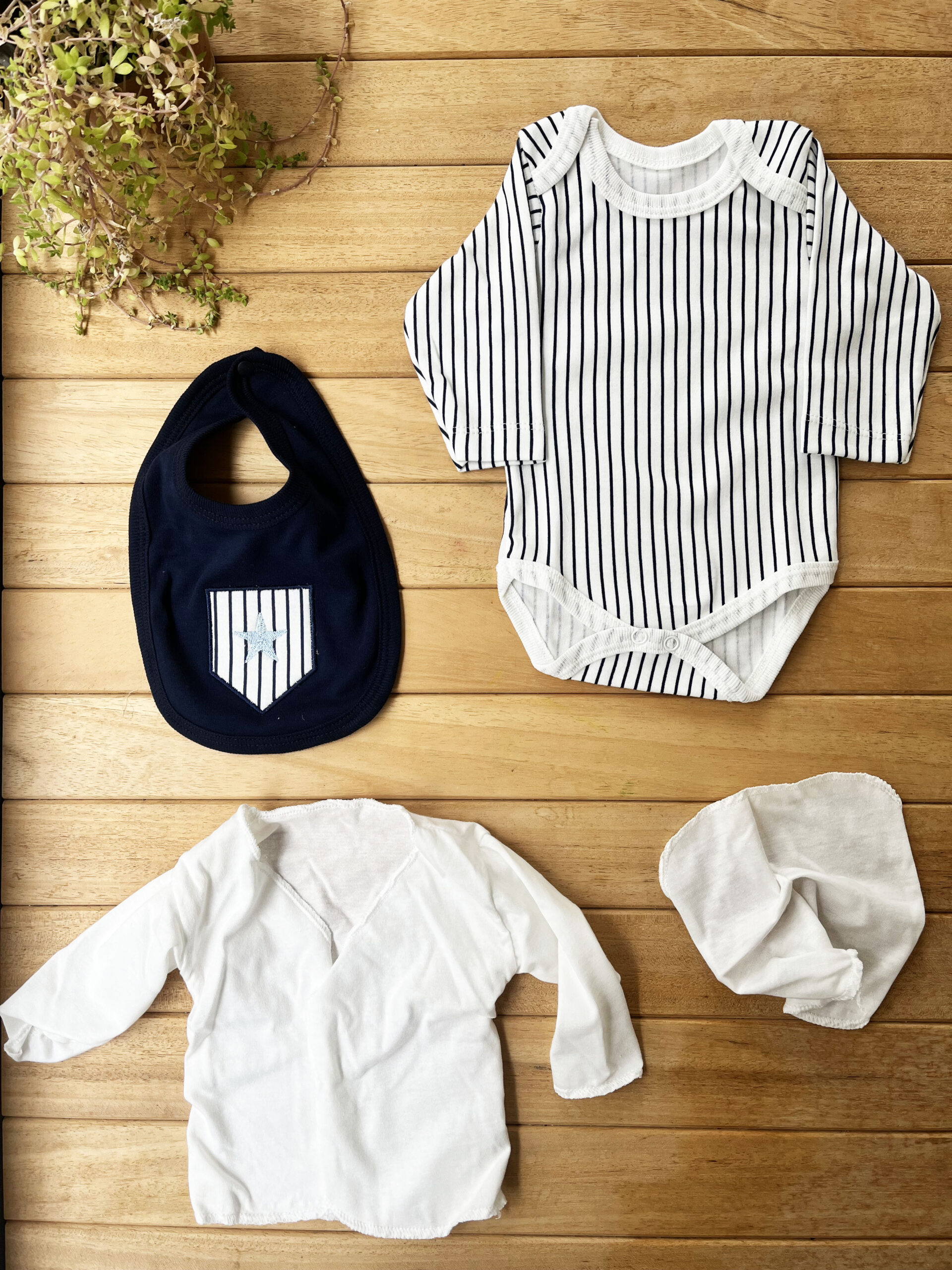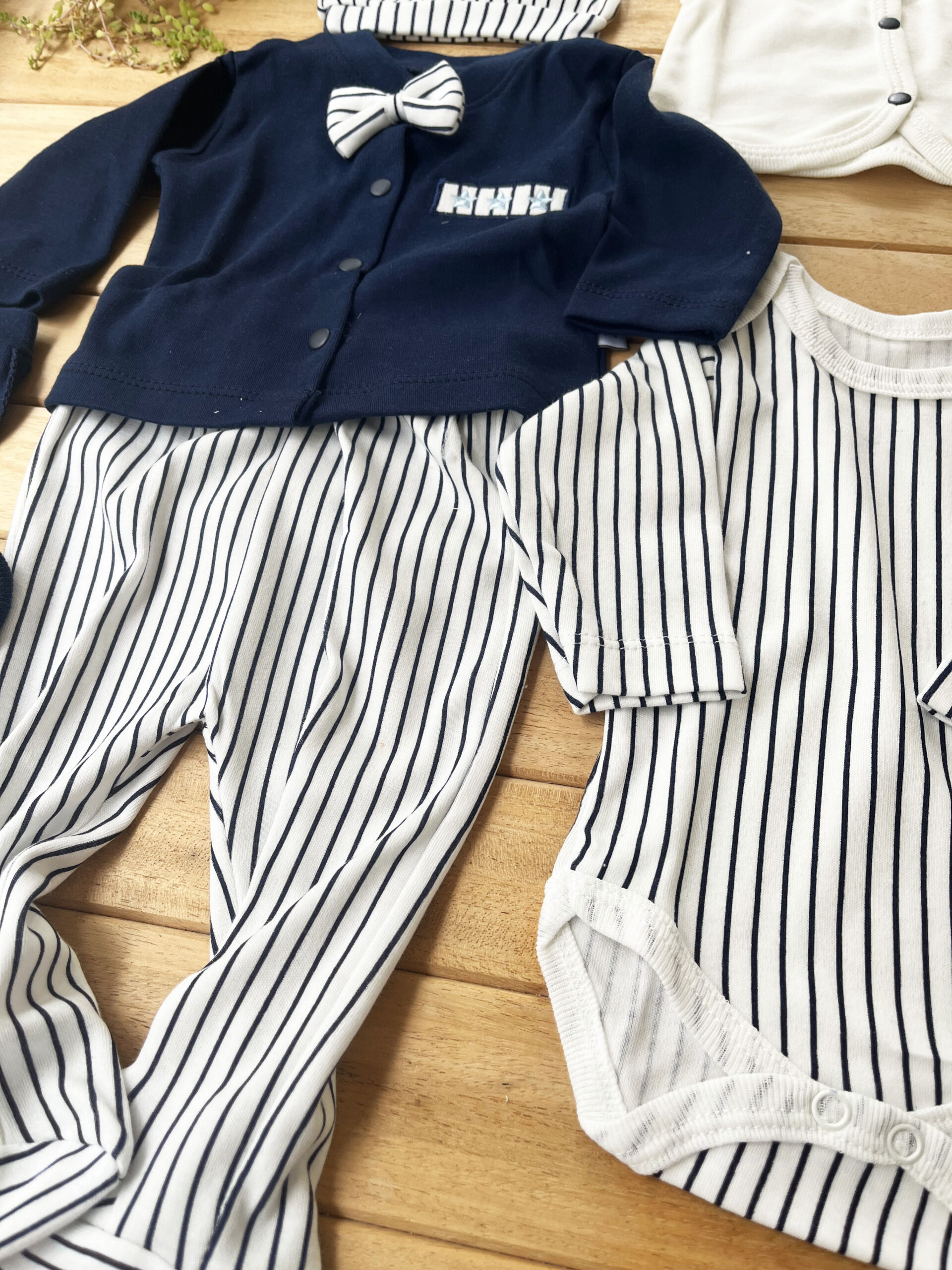 %100 Pamuk Yenidoğan Erkek Bebek Hastane Çıkış Seti 10 Parça – Çizgili Desenli İndigo