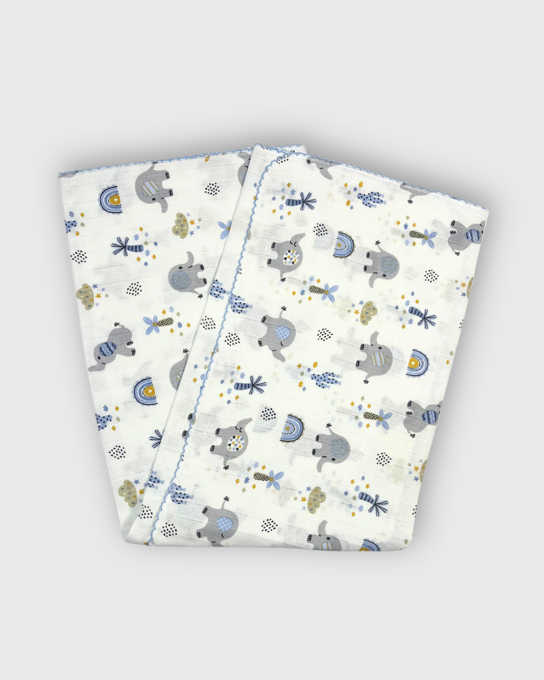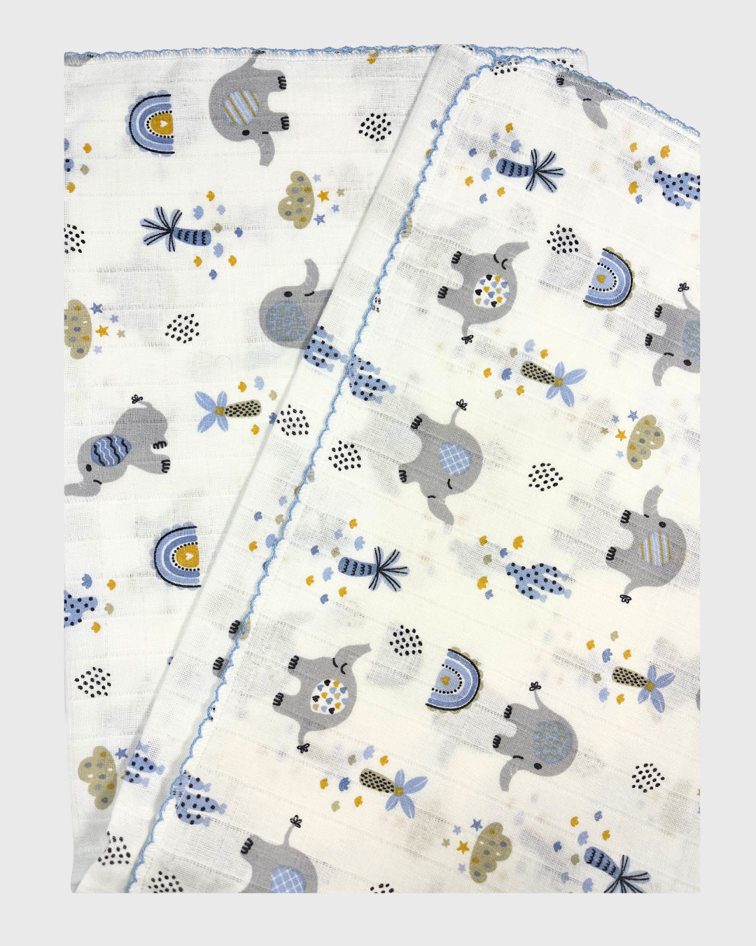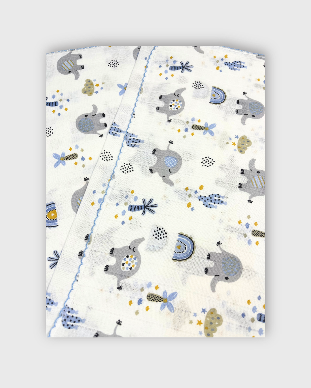 100% Pamuk Muslin Bebek Battaniye – 80×90 cm, Otantik Fil Desenli & Kenarı Oyalı