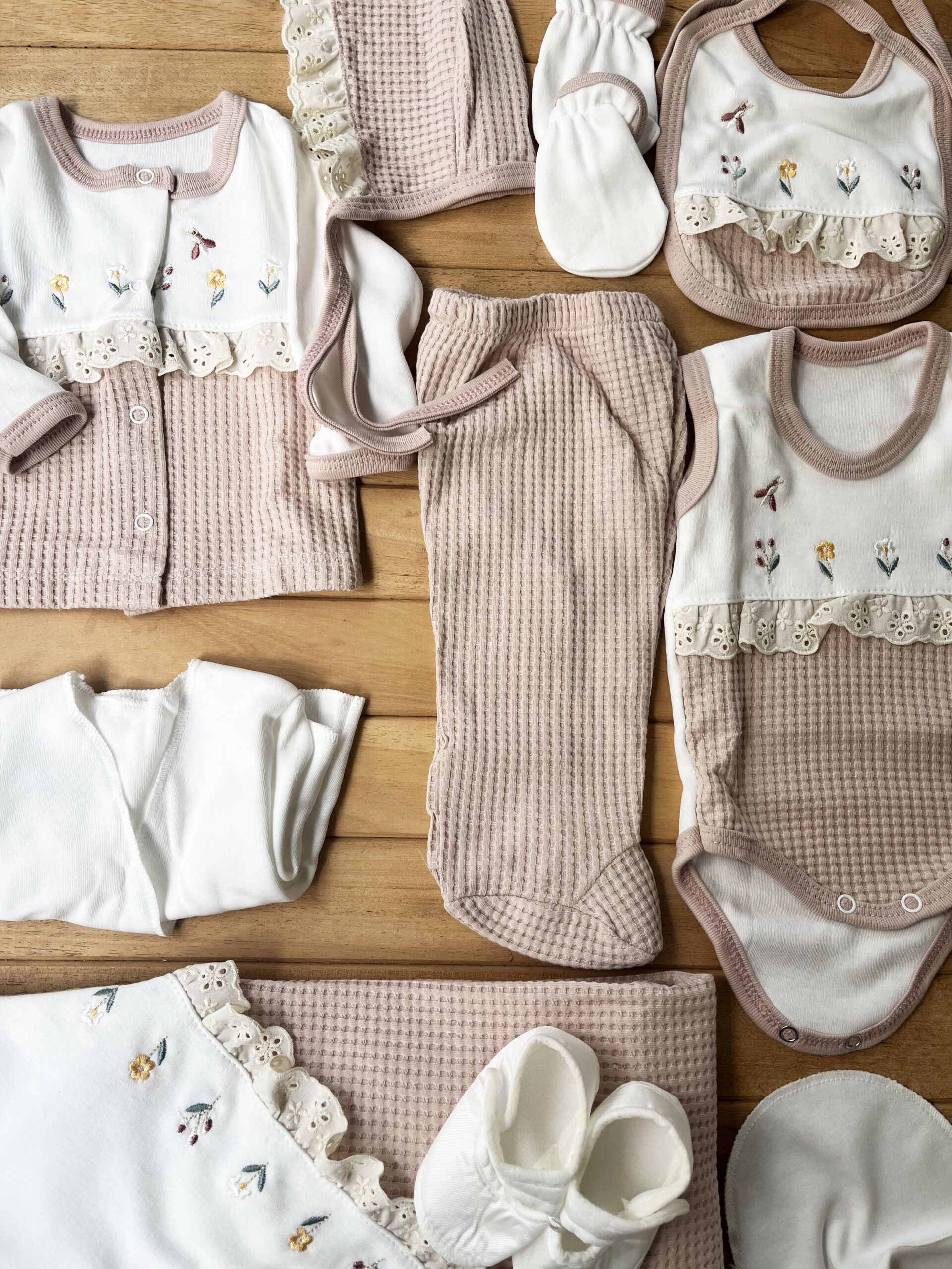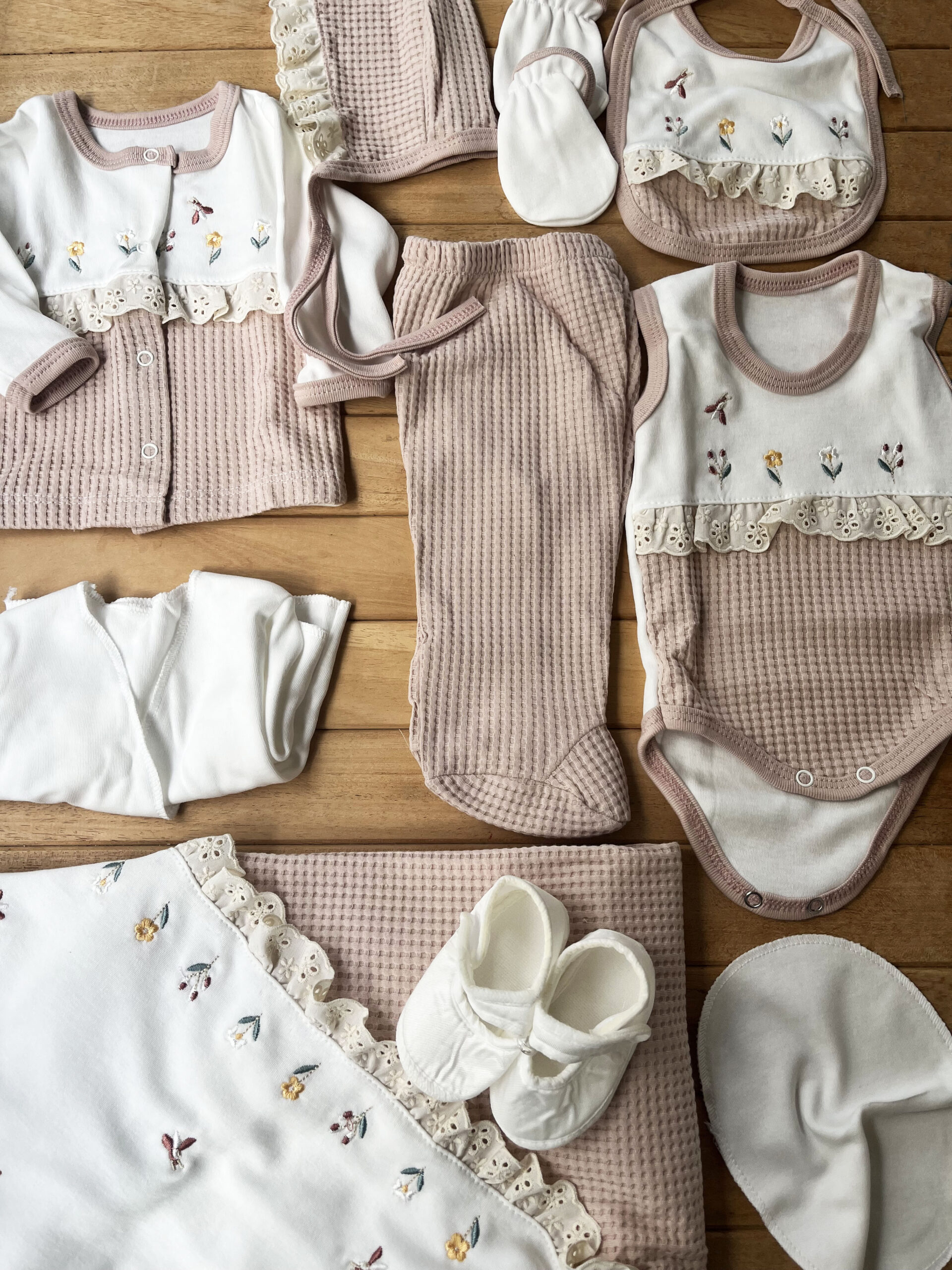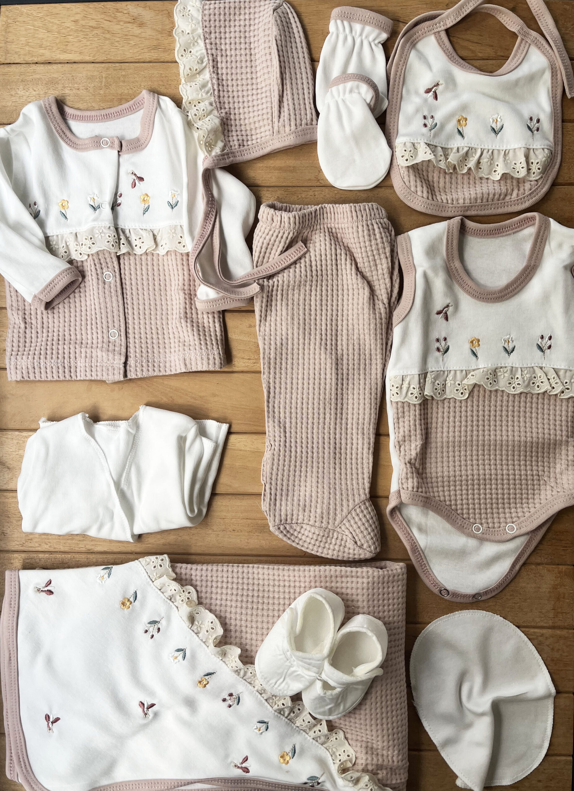 Gül Kurusu 10’lu Kız Bebek Hastane Çıkış Seti – Fistolu Çiçek Desenli & Waffle Kumaş Detaylı Minik prensesinizin ilk günlerine zarafet ve konfor katmak için tasarlanan gül kurusu 10’lu kız bebek hastane çıkış seti, çiçek desenleri ve ince işçilikli fisto detaylarıyla göz kamaştırıyor.