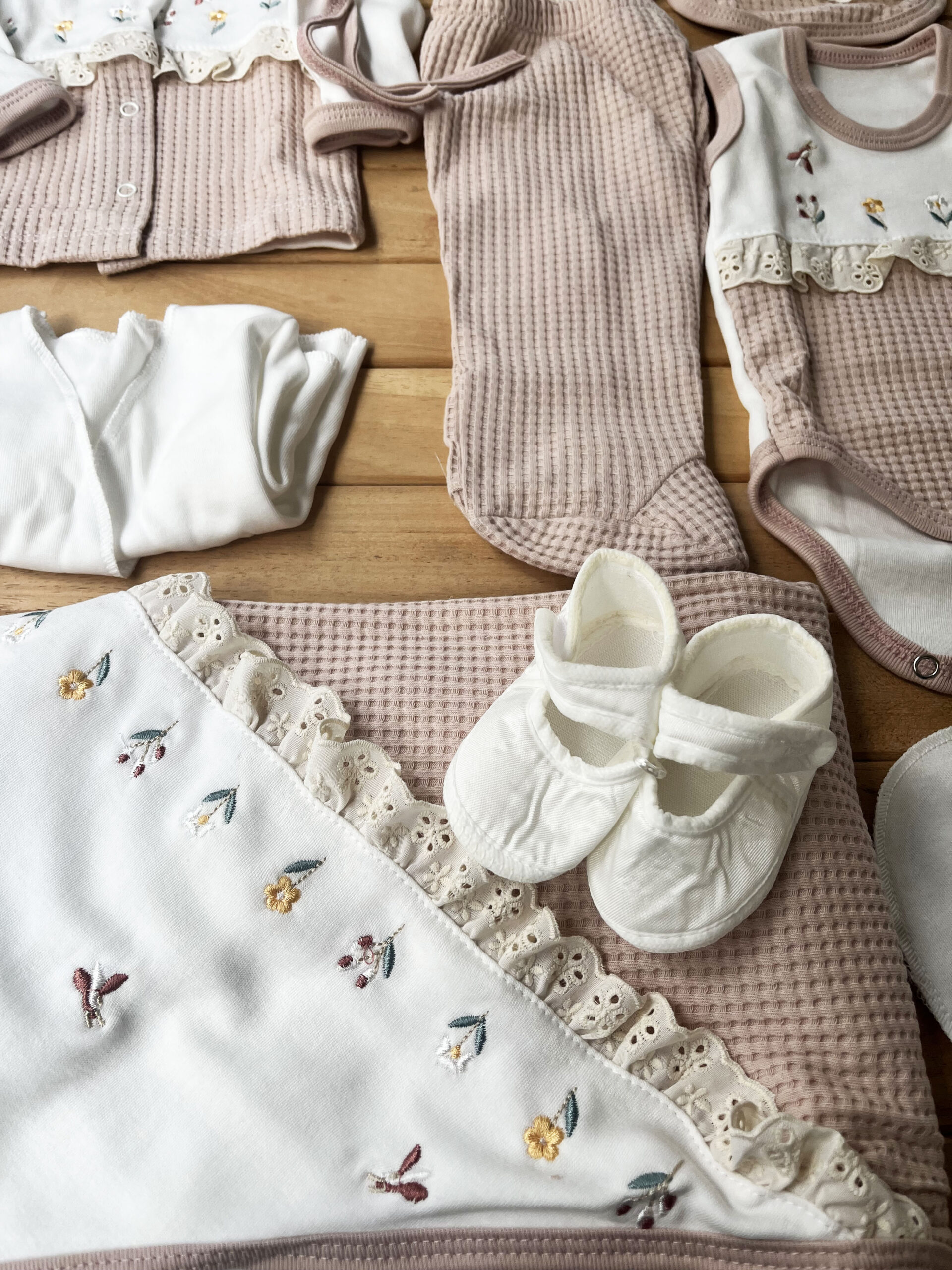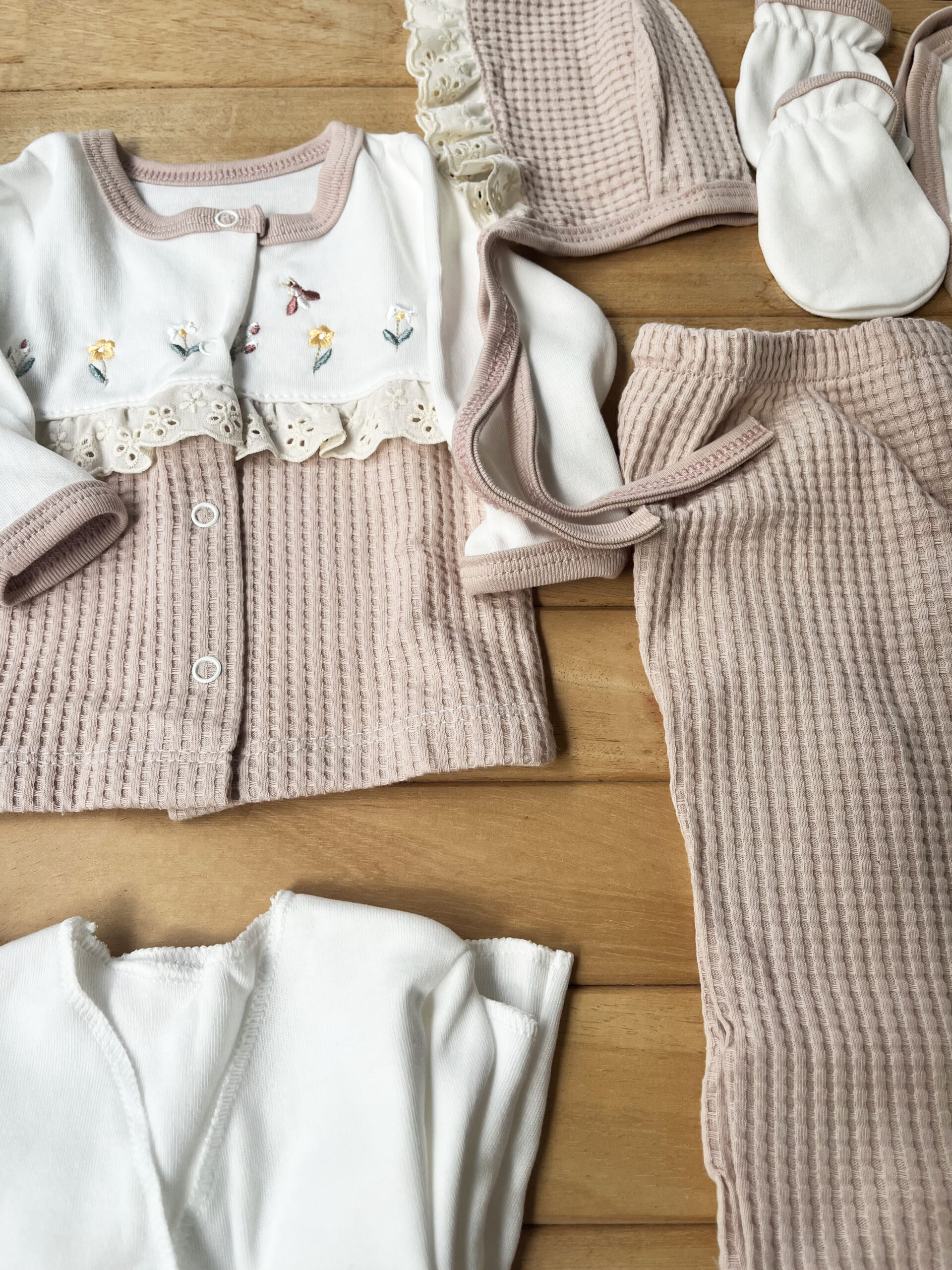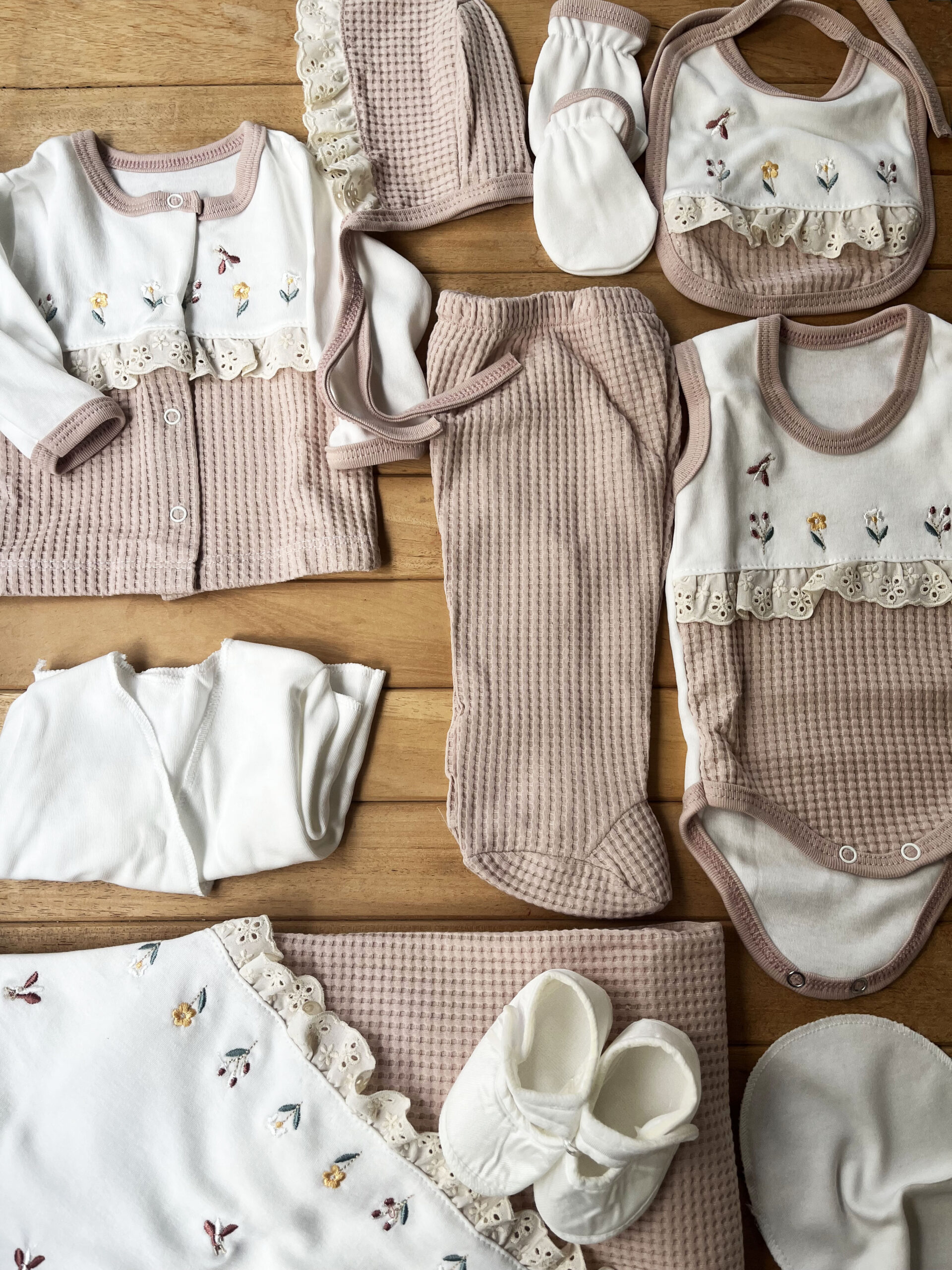 Gül Kurusu 10’lu Kız Bebek Hastane Çıkış Seti – Fistolu Çiçek Desenli & Waffle Kumaş Detaylı Minik prensesinizin ilk günlerine zarafet ve konfor katmak için tasarlanan gül kurusu 10’lu kız bebek hastane çıkış seti, çiçek desenleri ve ince işçilikli fisto detaylarıyla göz kamaştırıyor.