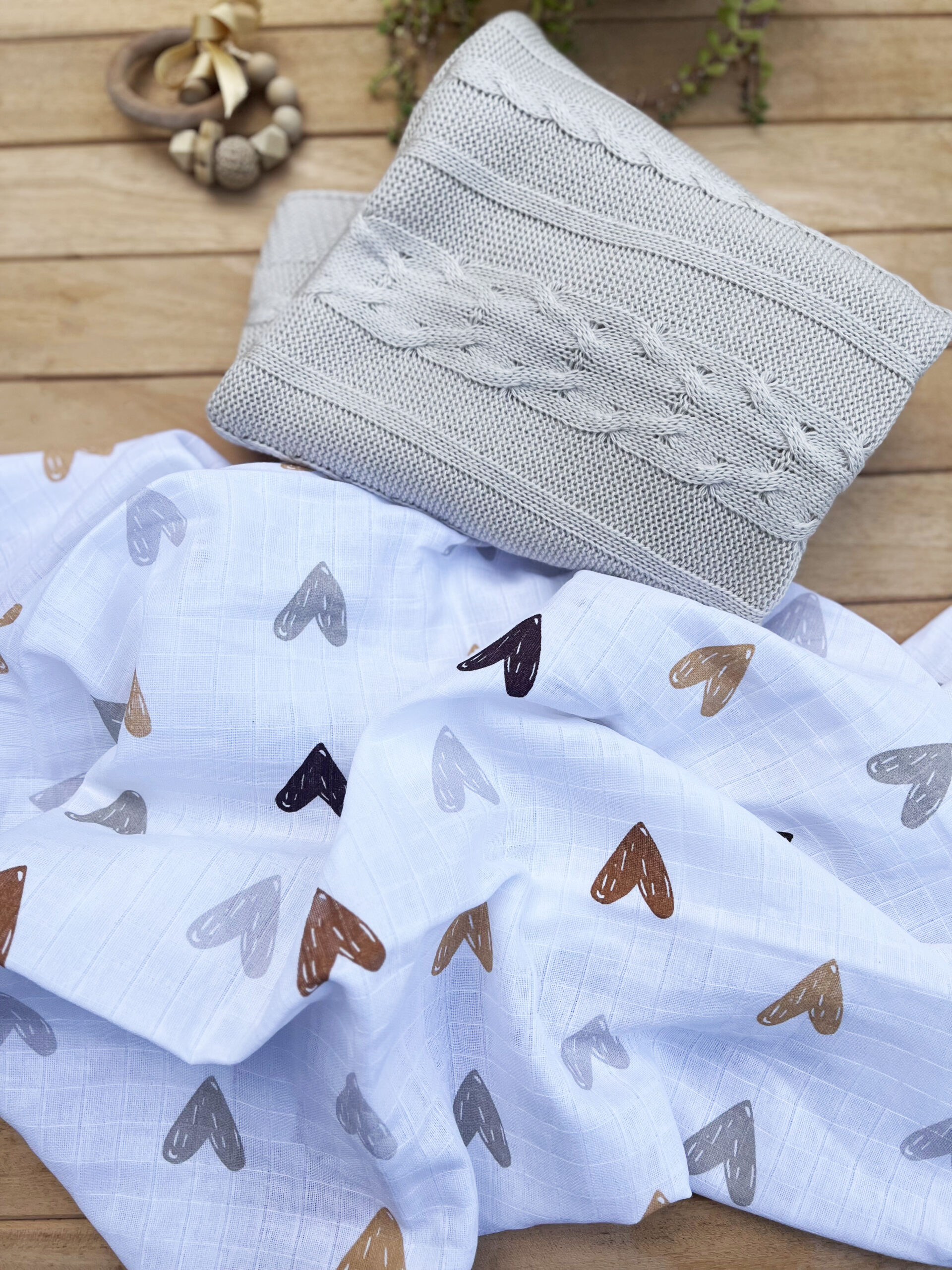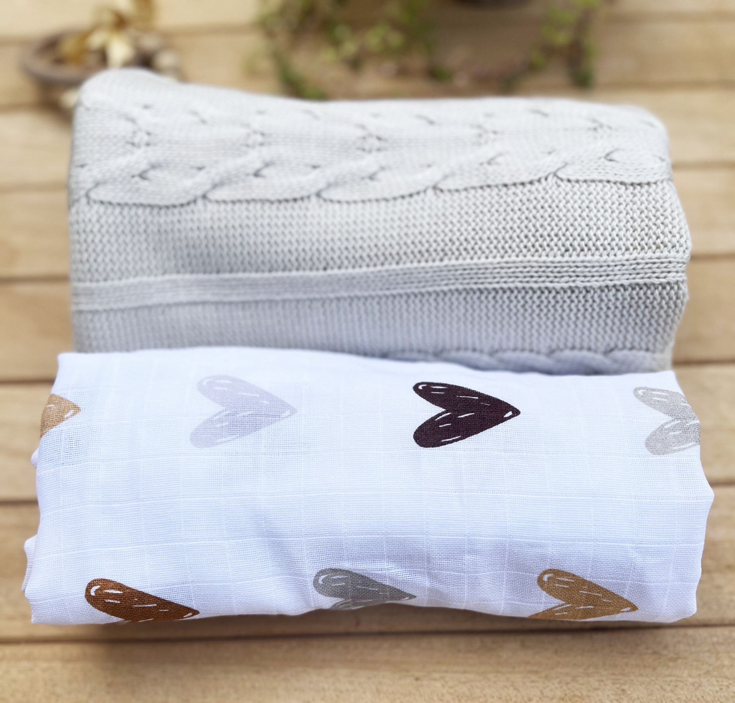 2’lü Kalpli Müslin Set(Bej Tek Kat Triko Zincir Battaniye &Tek Kat Kalp Müslin)
