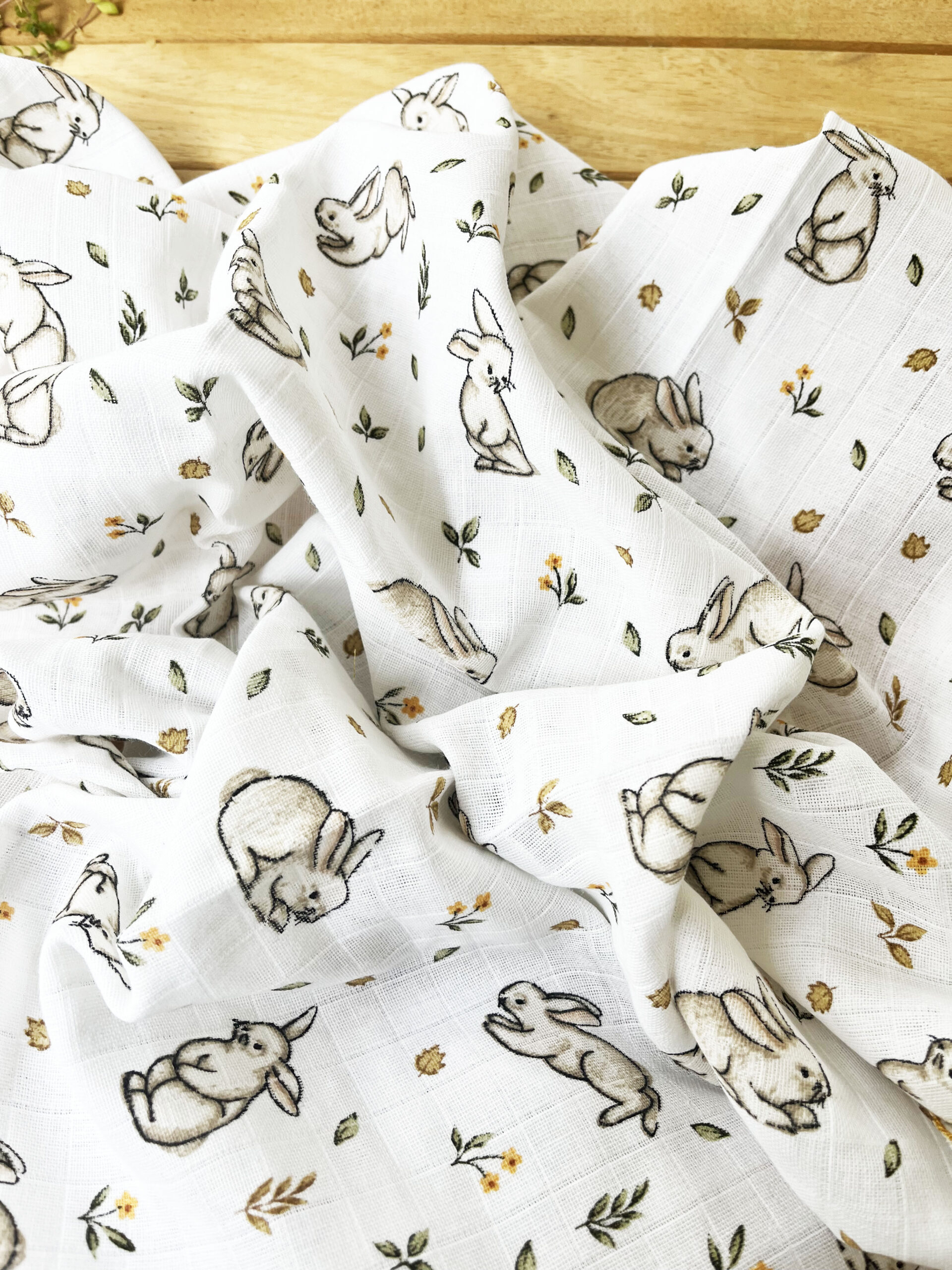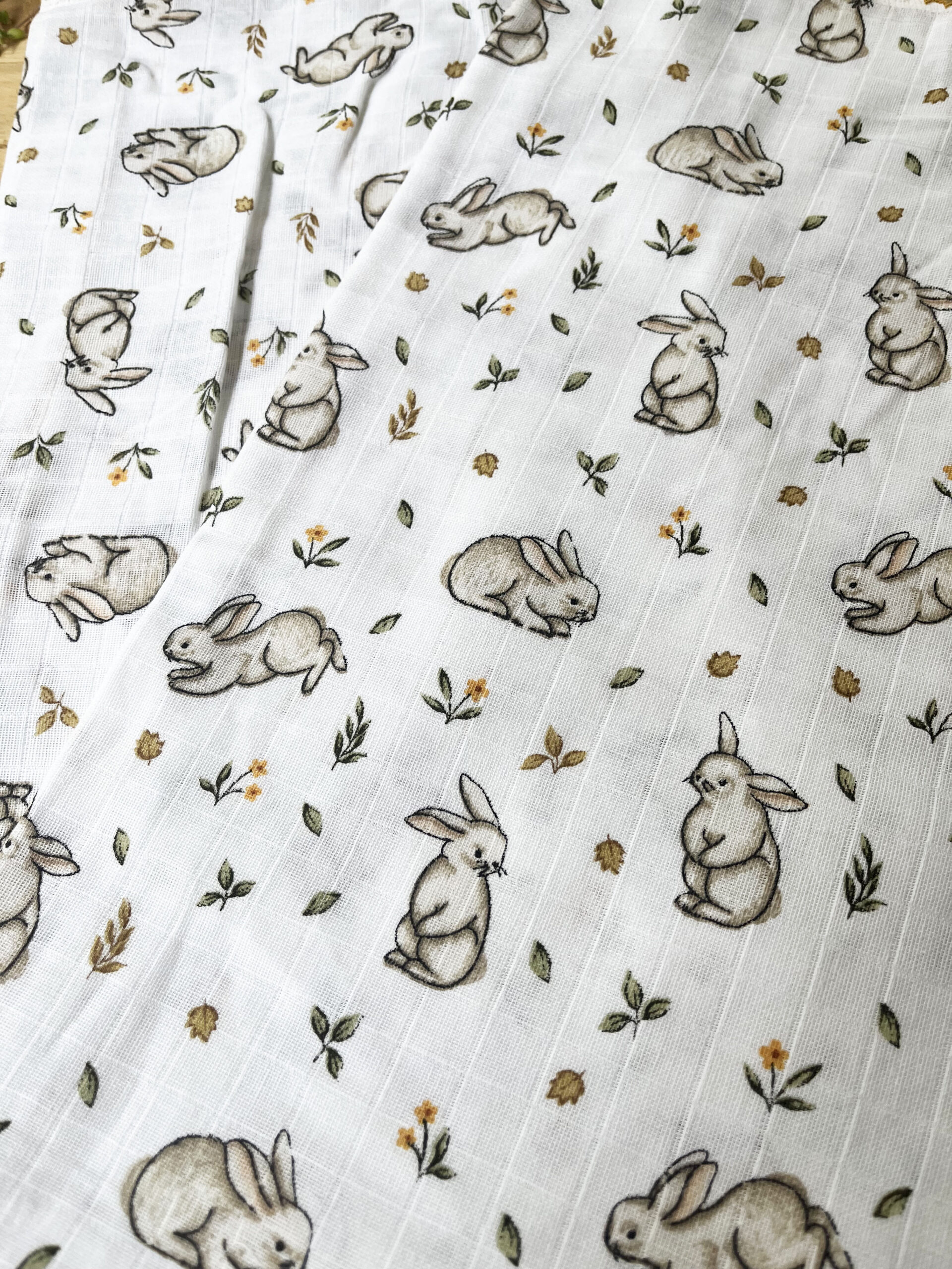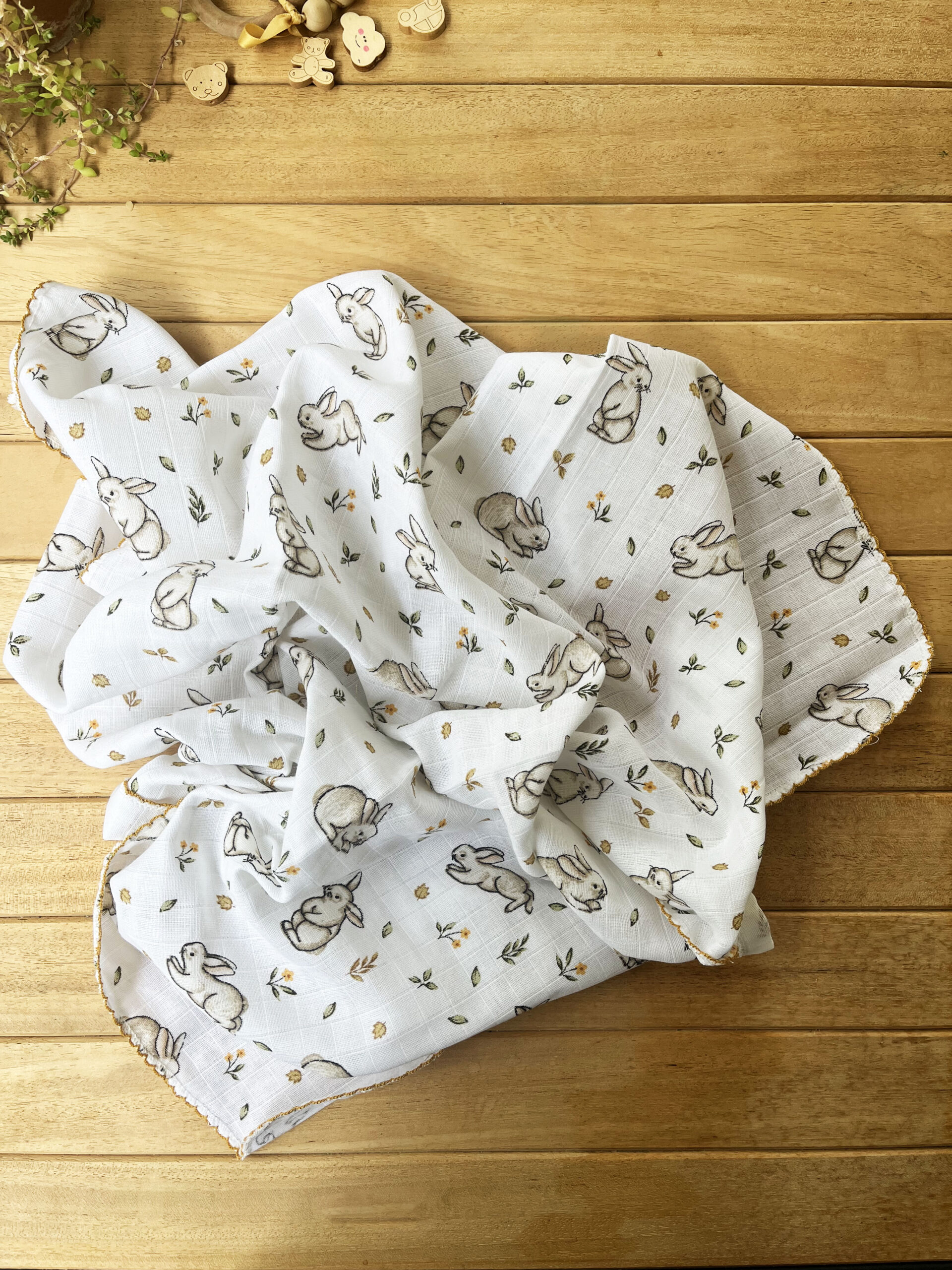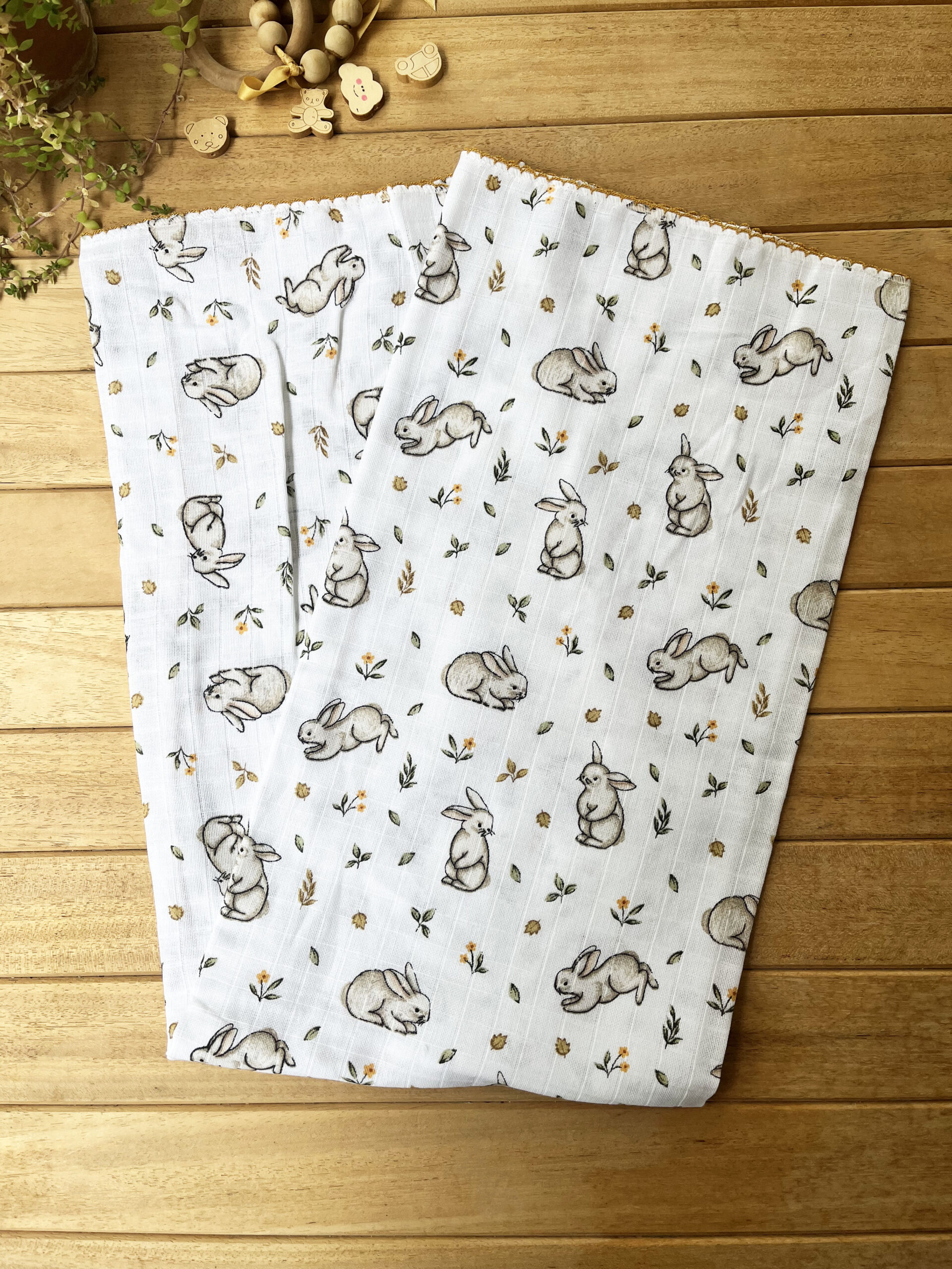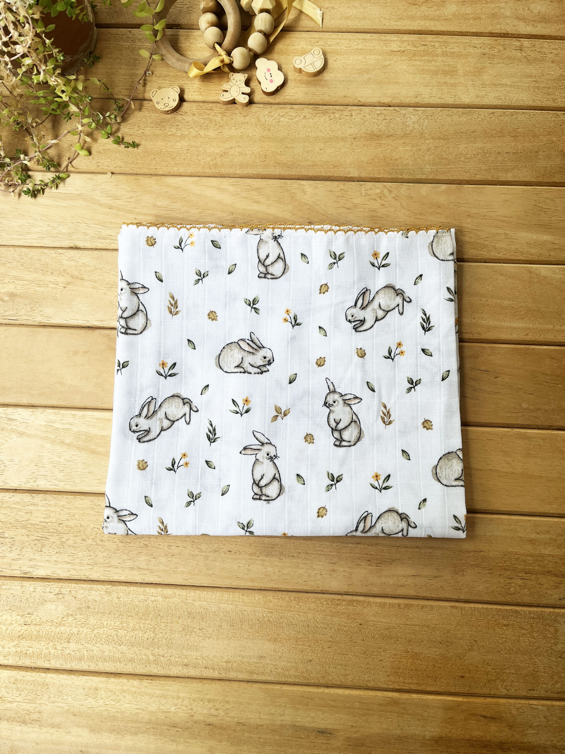 85x75cm Kenarı Oyalı Tavşan Desenli Tek Katlı %100 Pamuk Müslin Battaniye