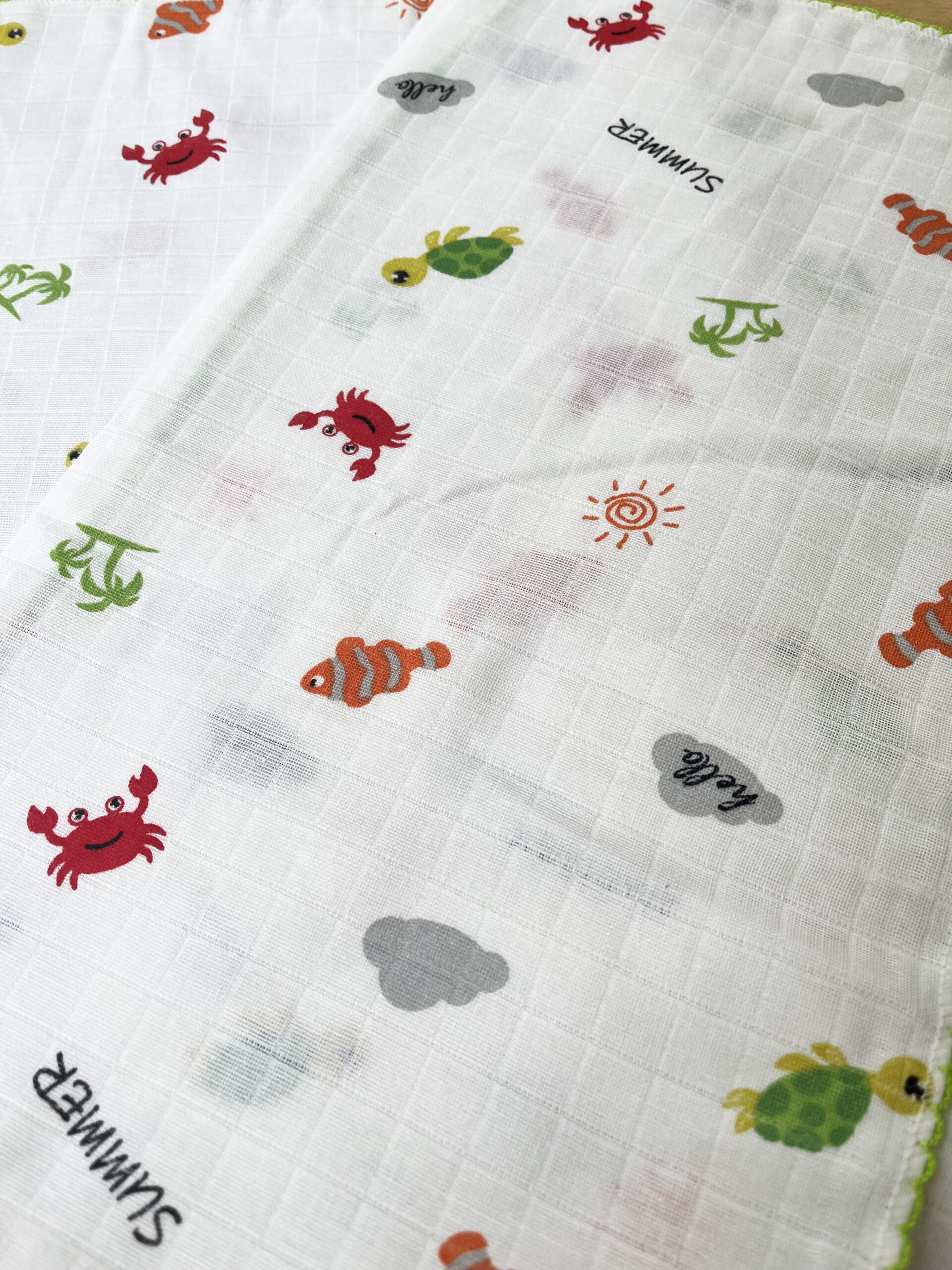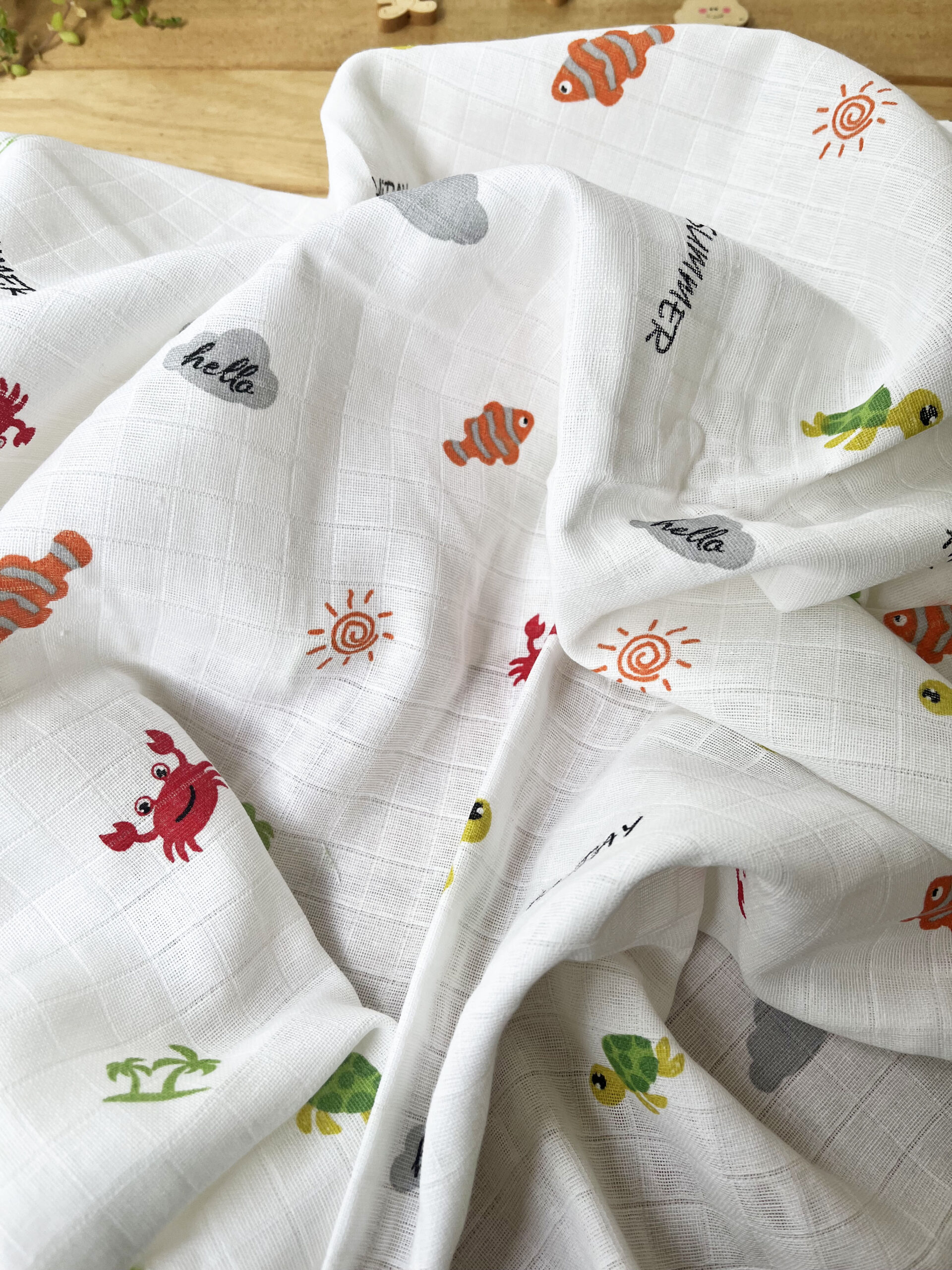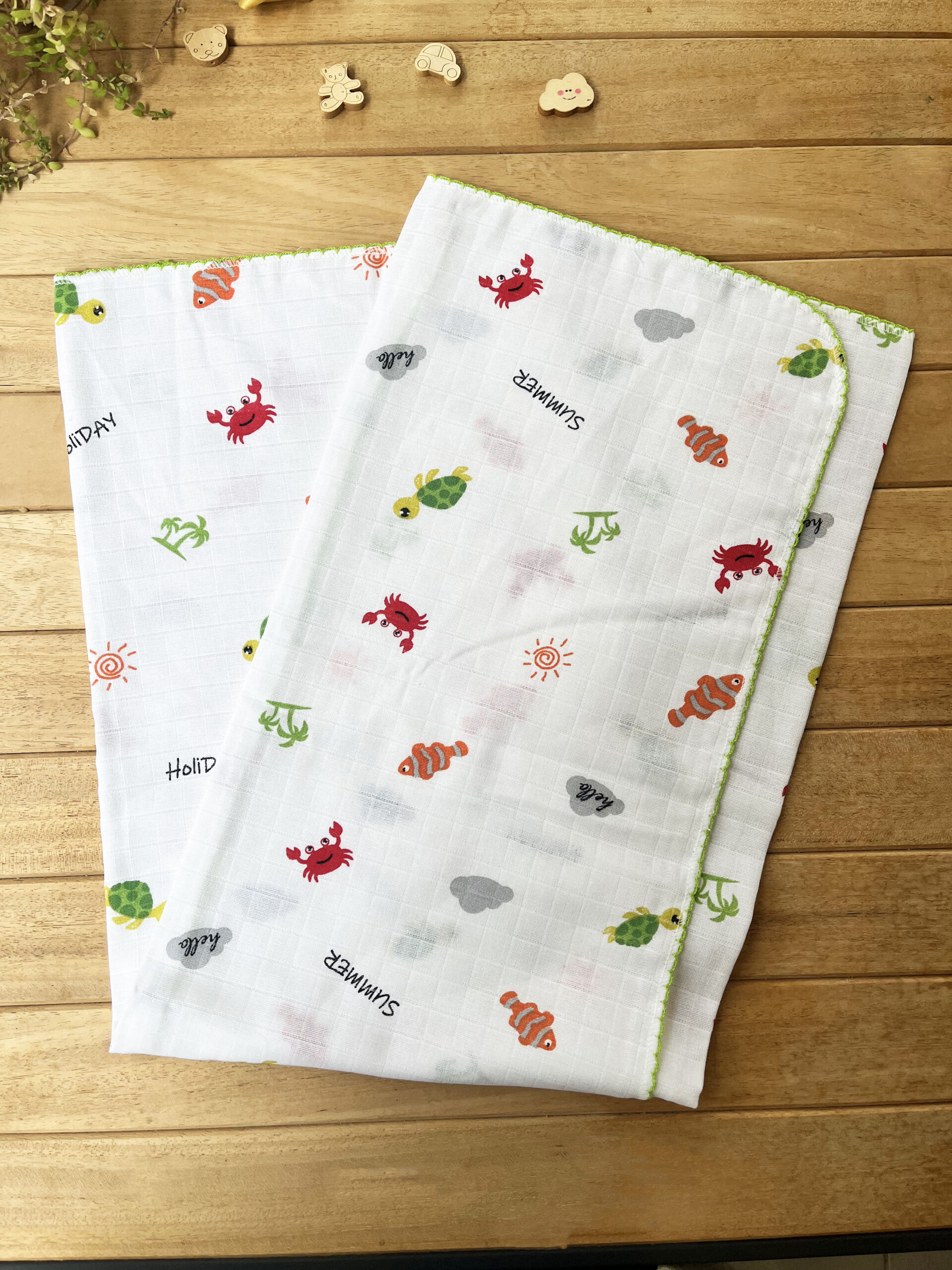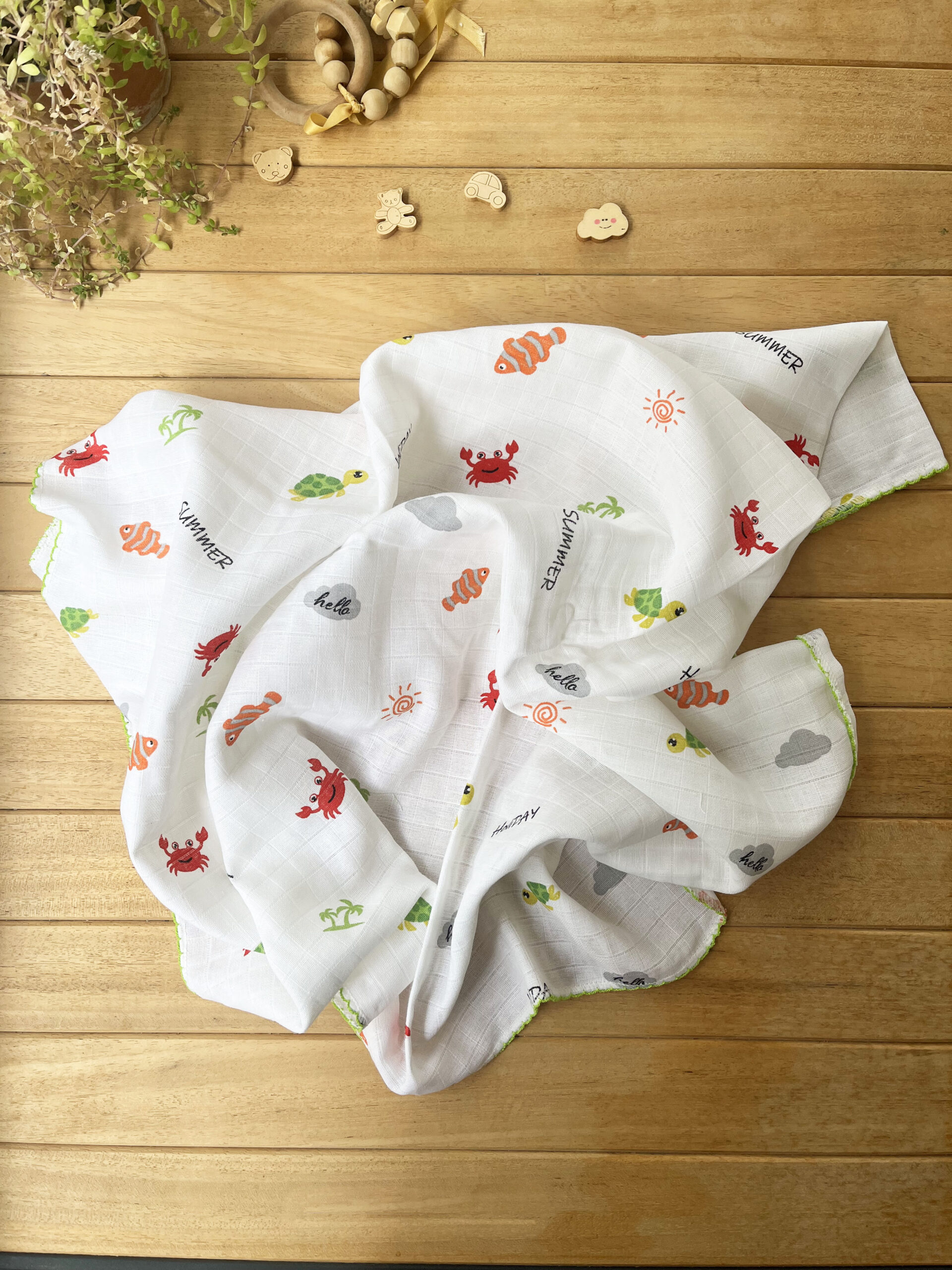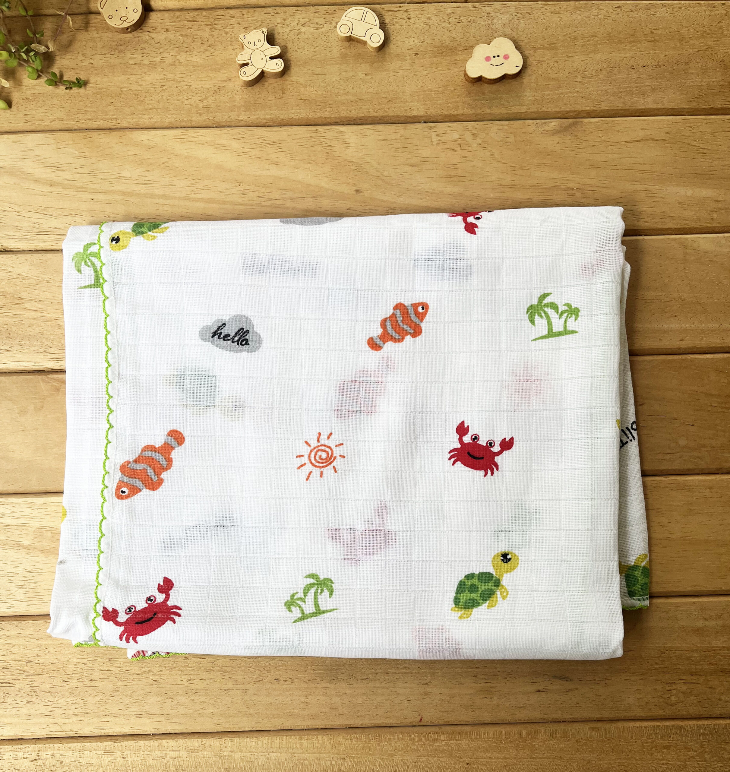 75x85cm Kenarı Oyalı Denizaltı Desenli Tek Katlı %100 Pamuk Müslin Battaniye