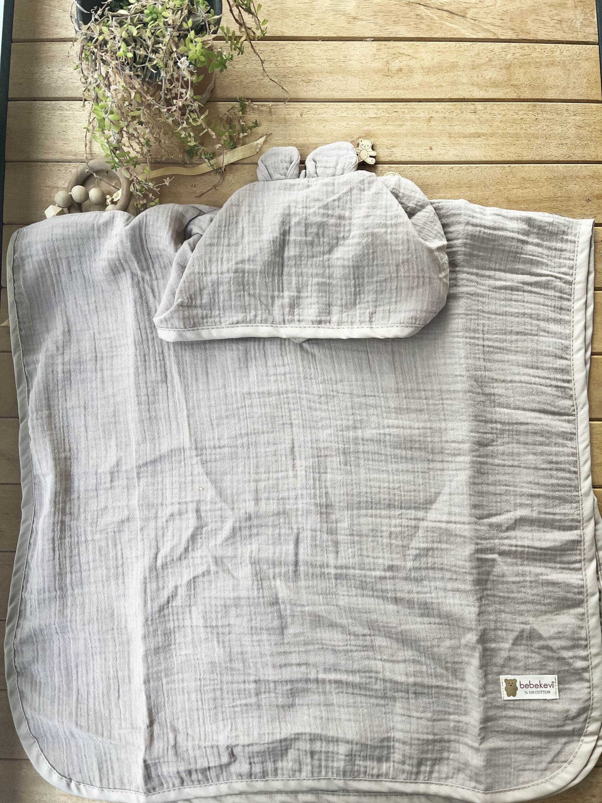 Bebekevi Kapişonlu Çift Katlı Müslin Pelerin(Panço) – Bej | %100 Pamuk, Nefes Alan, Yumuşacık Bebek Pelerini(Panço)