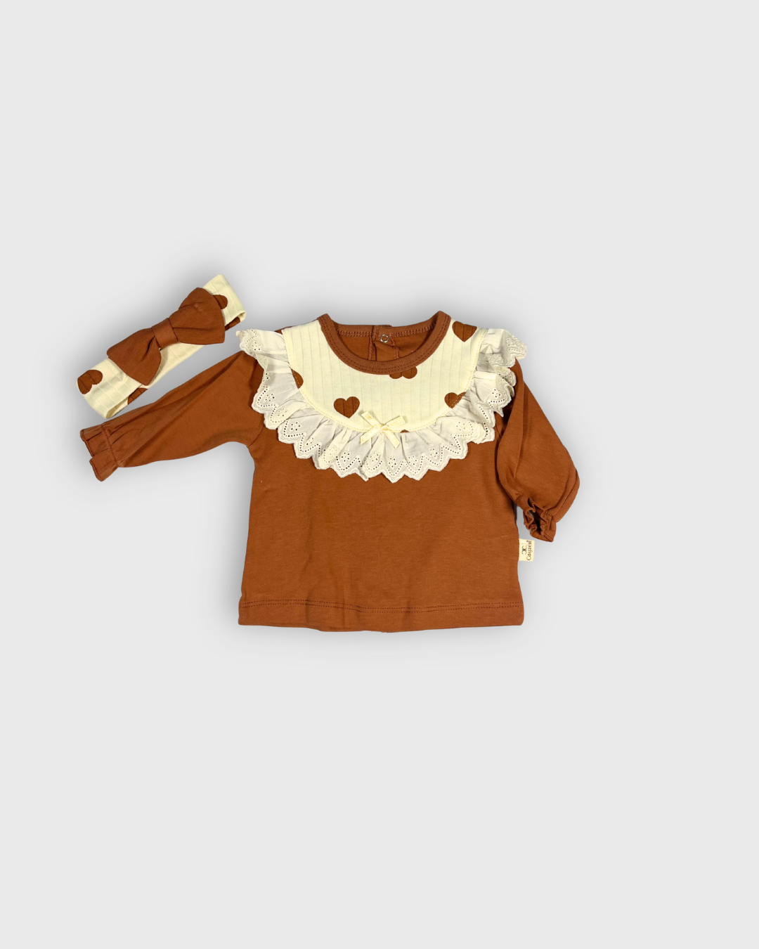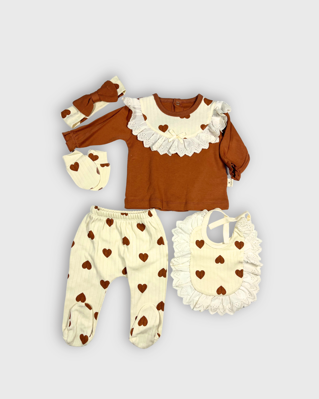 Cayzen Kahve Kalpli Kız Bebek Pamuklu Oeko-Tex Sertifikalı 5’li Takım