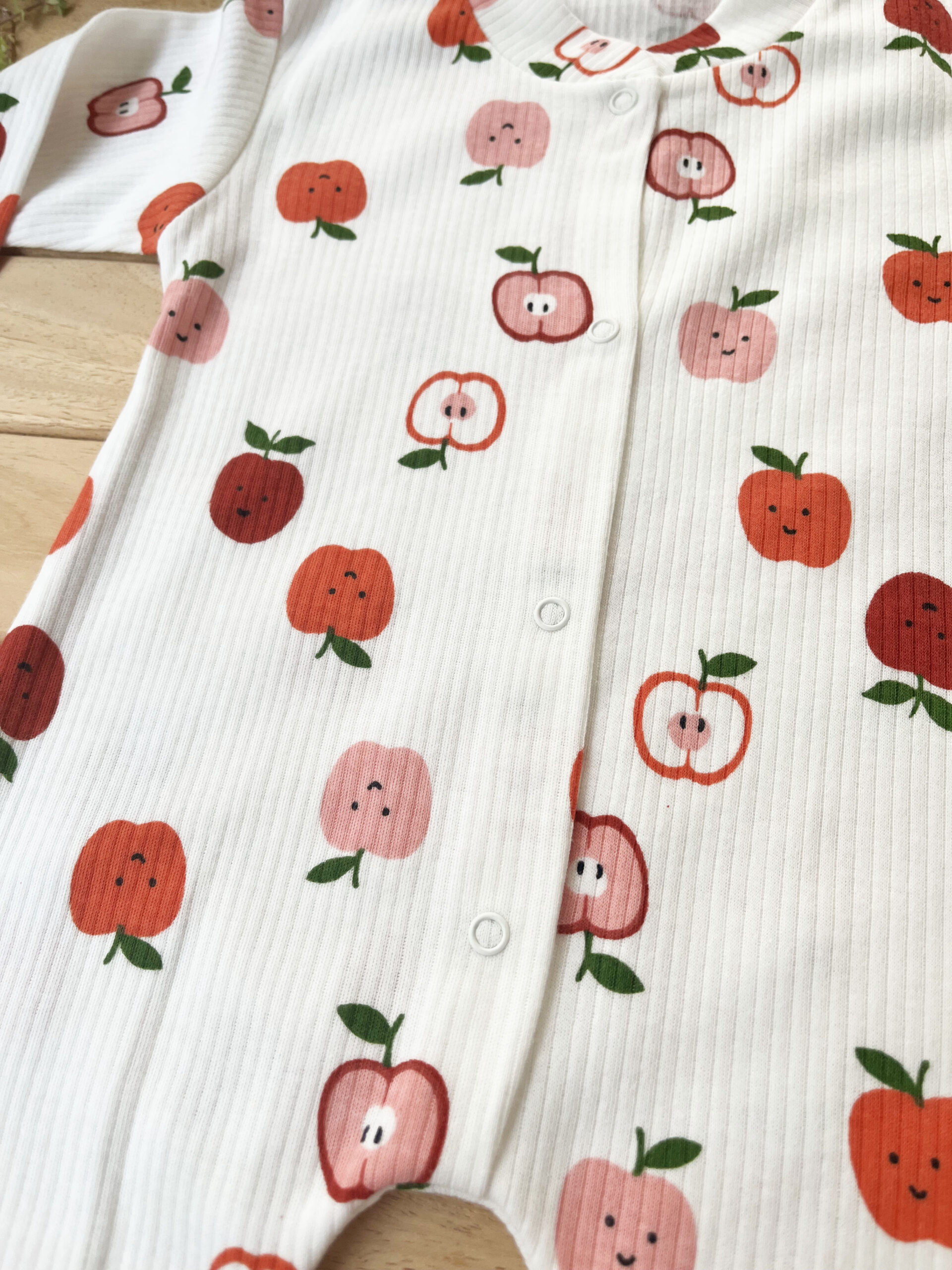 Elma Desenli %100 Pamuk Ribana Dokulu Çıtçıtlı Uzun Kollu Fitilli Bebek Tulum