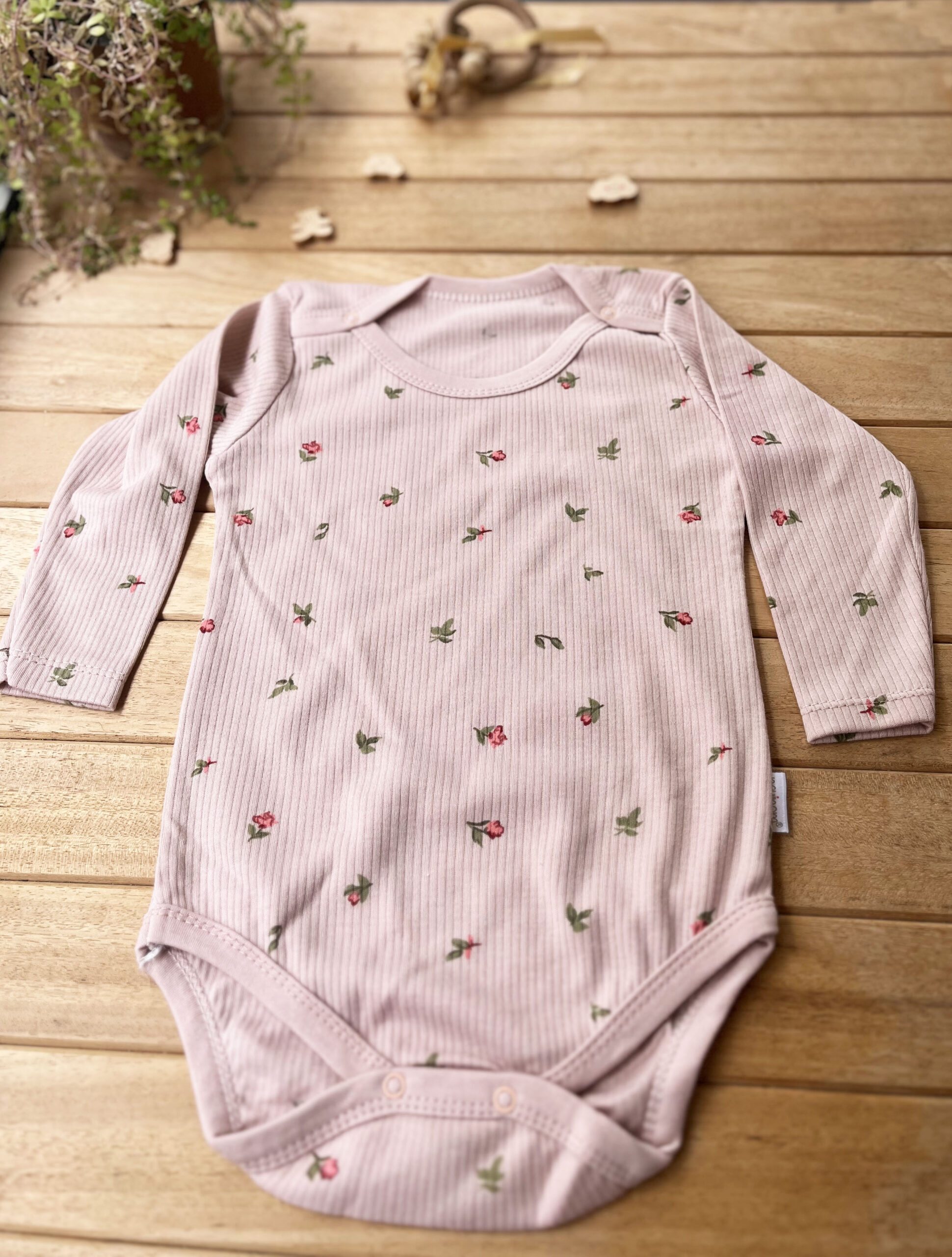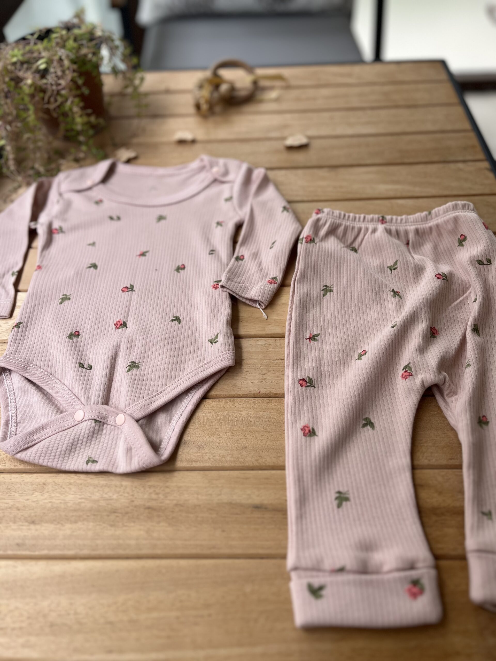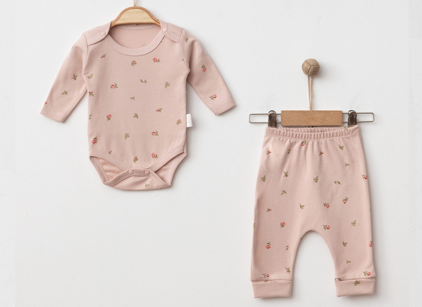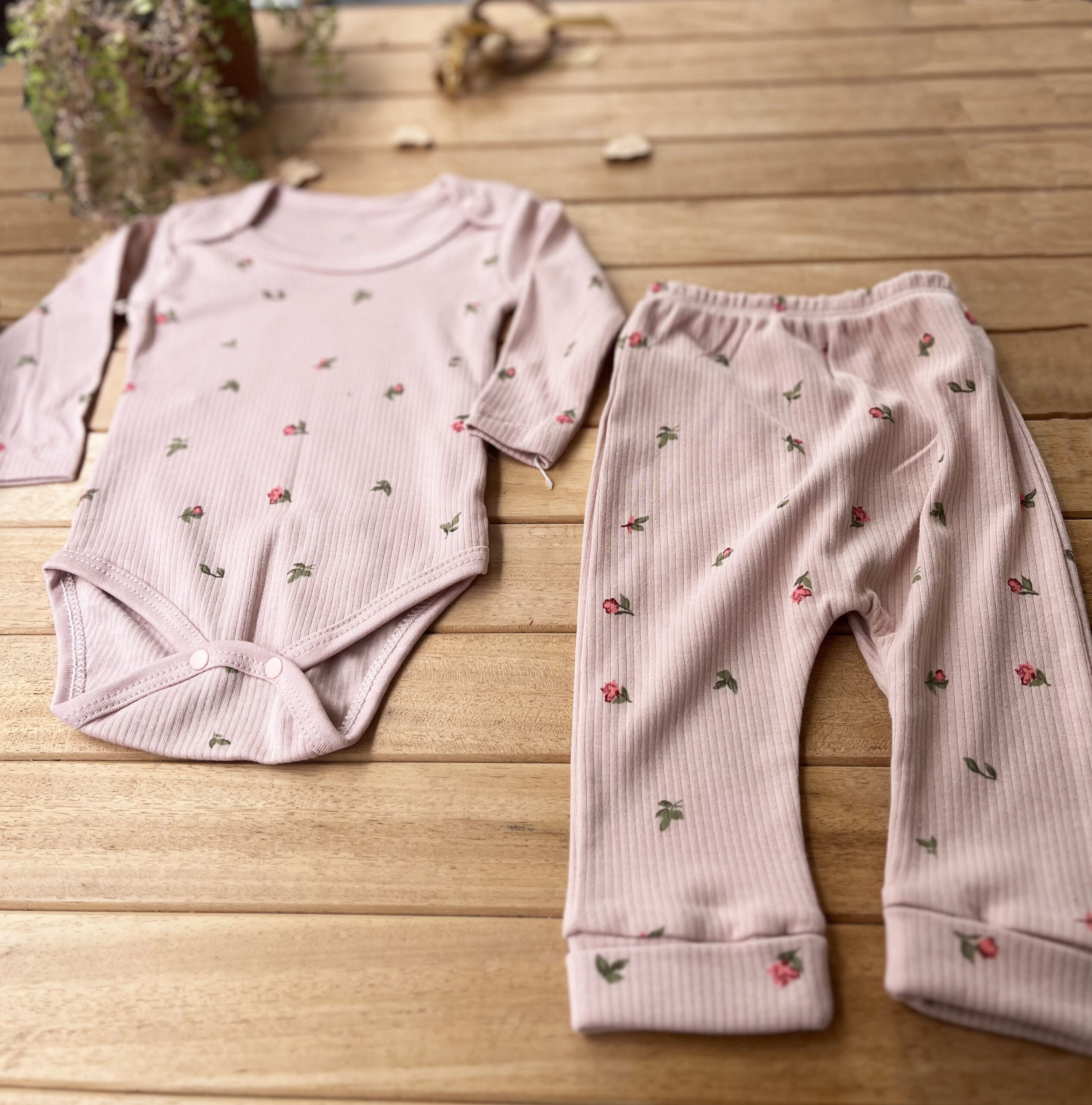 Kız Bebek 2’li Takım Lale Baskılı Uzun Kollu Fitilli Kaşkorse Çıtçıtlı Body