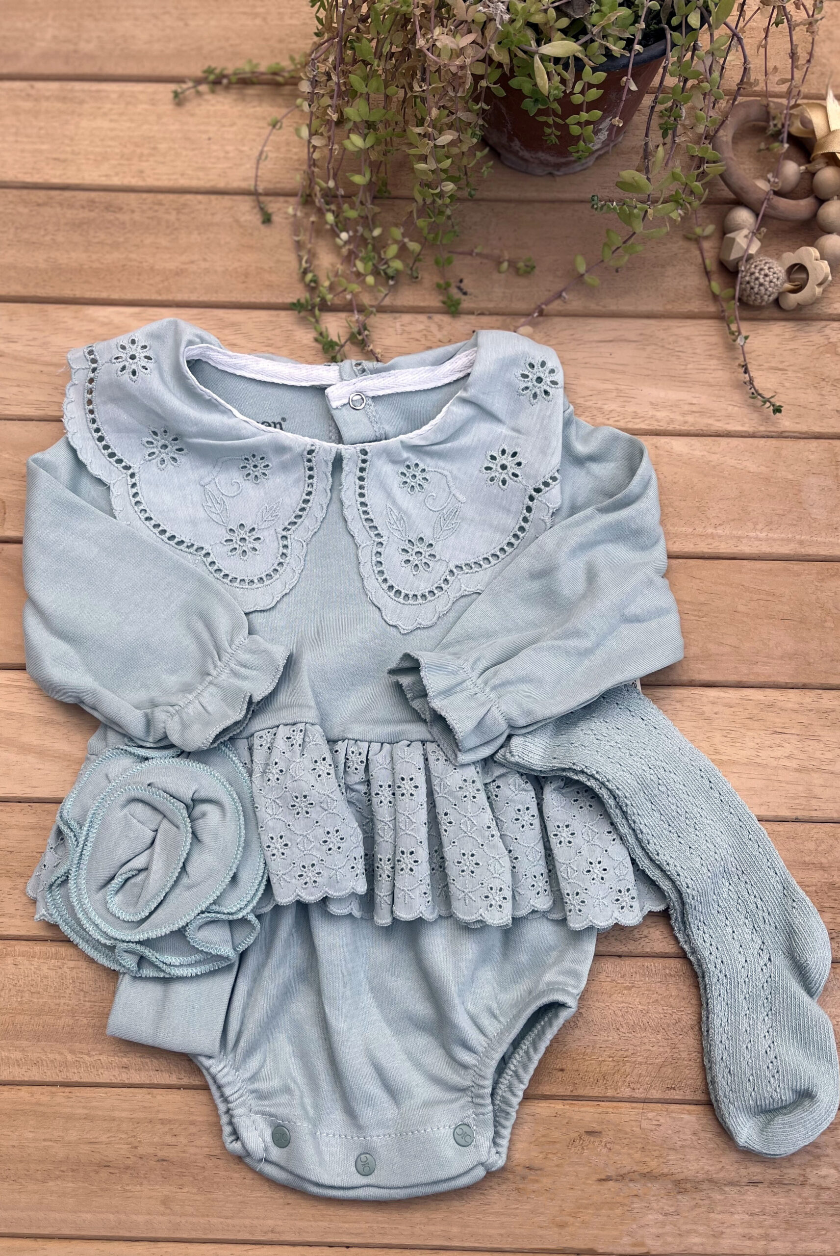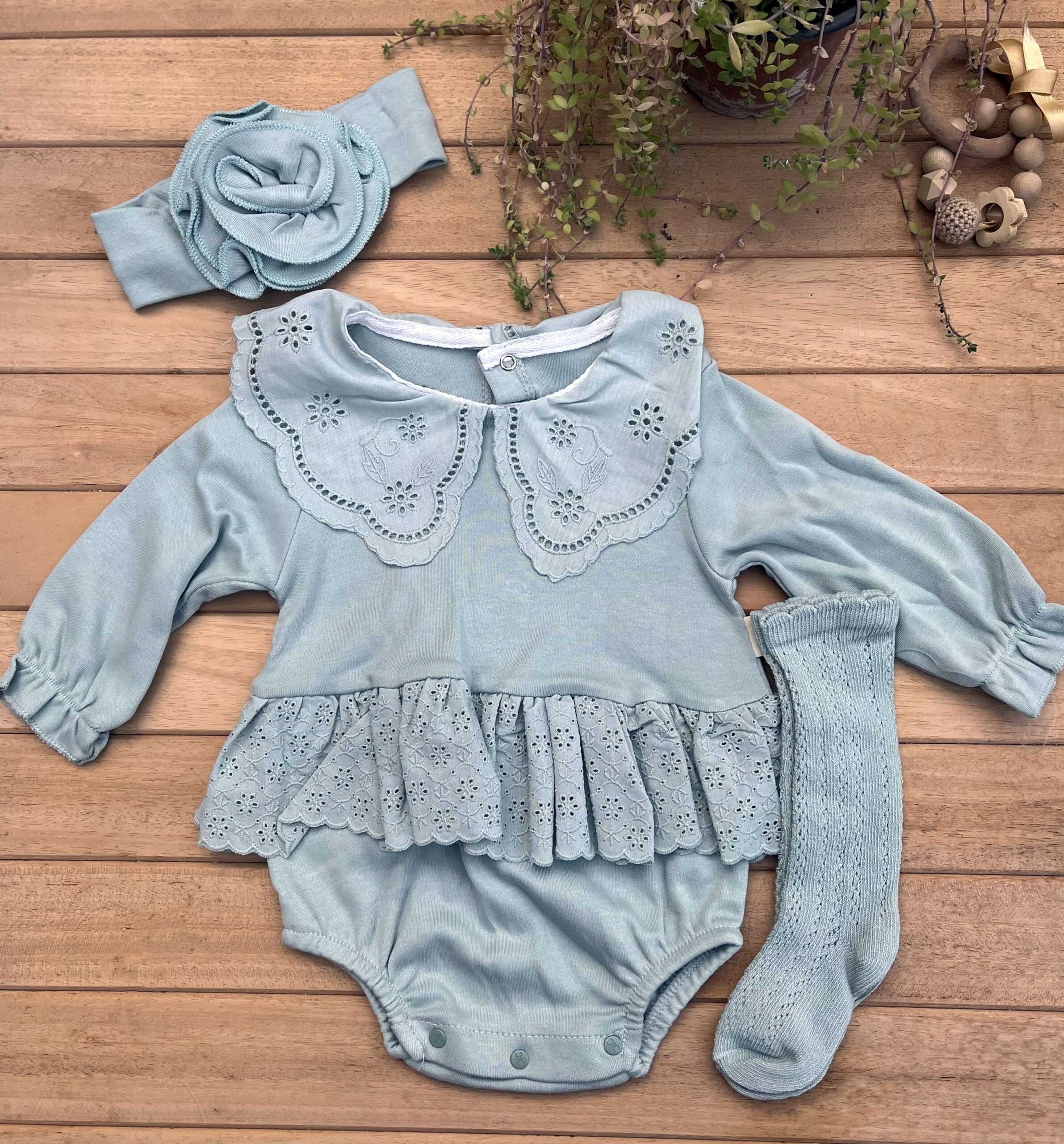 Kız Bebek Fistolu 3 Parça Romper Çoraplı Bandanalı Yenidoğan Tulum Body – Mint