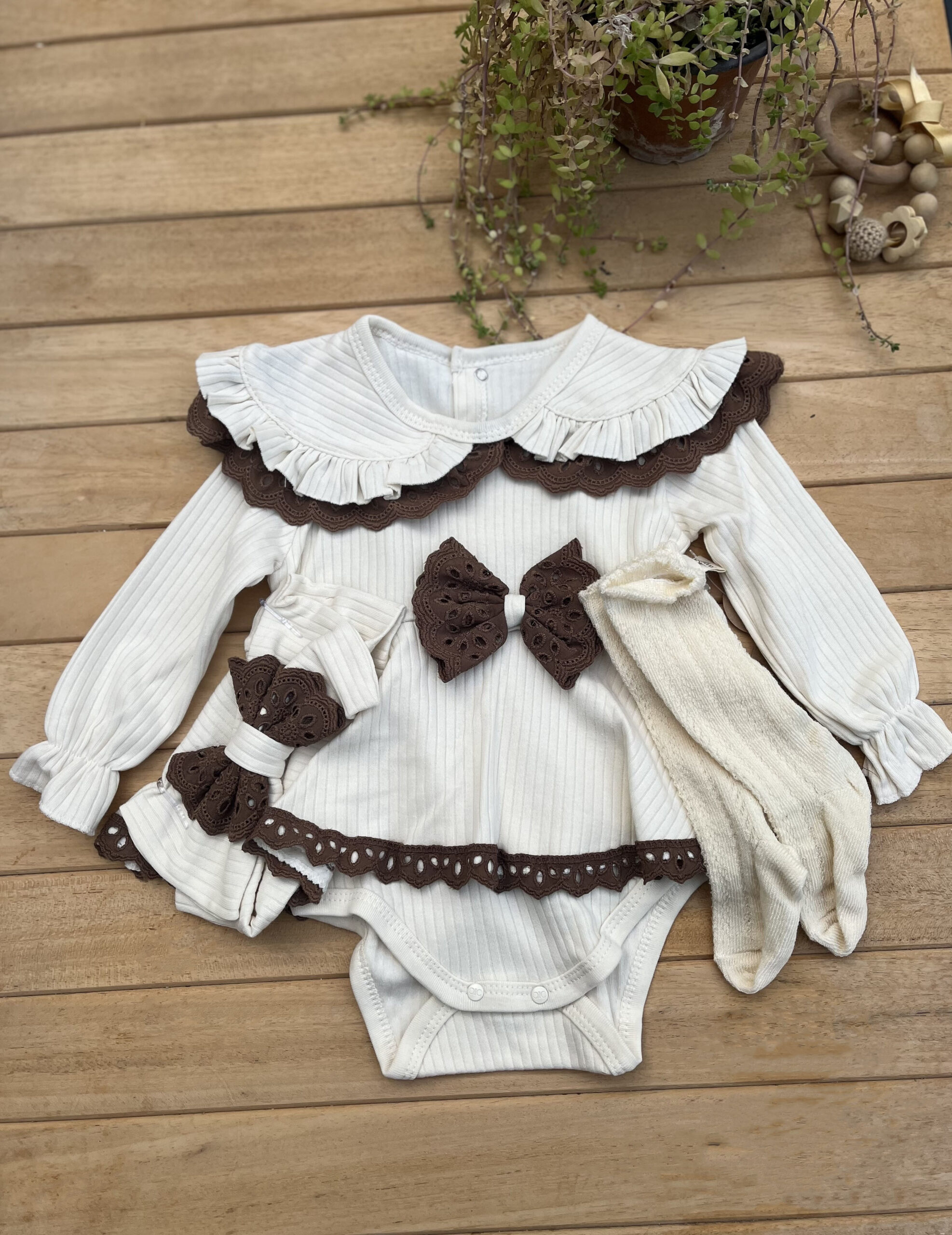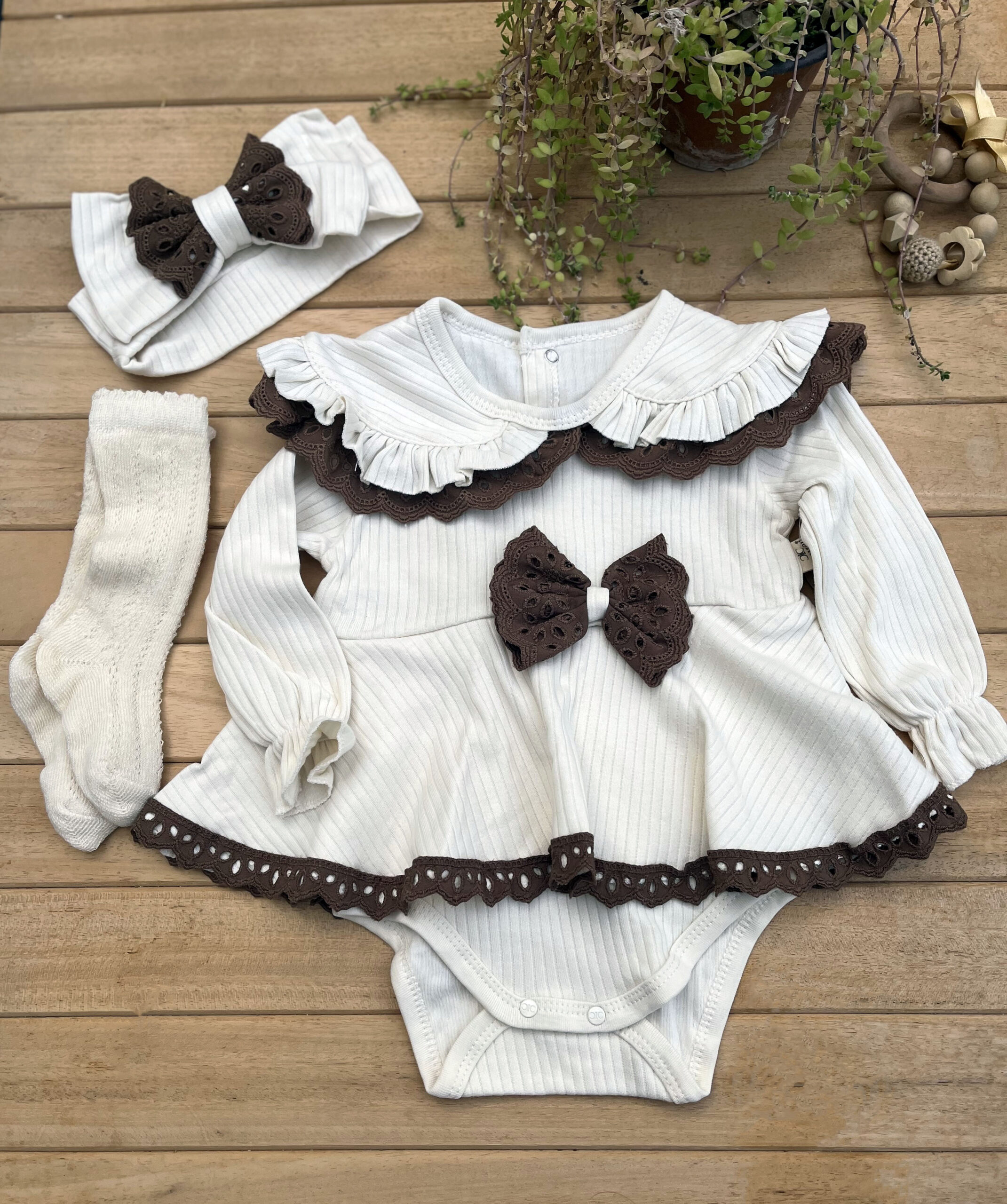Kız Bebek Fiyonklu 3 Parça Romper Çoraplı Bandanalı Yenidoğan Tulum Body – Krem Kahve