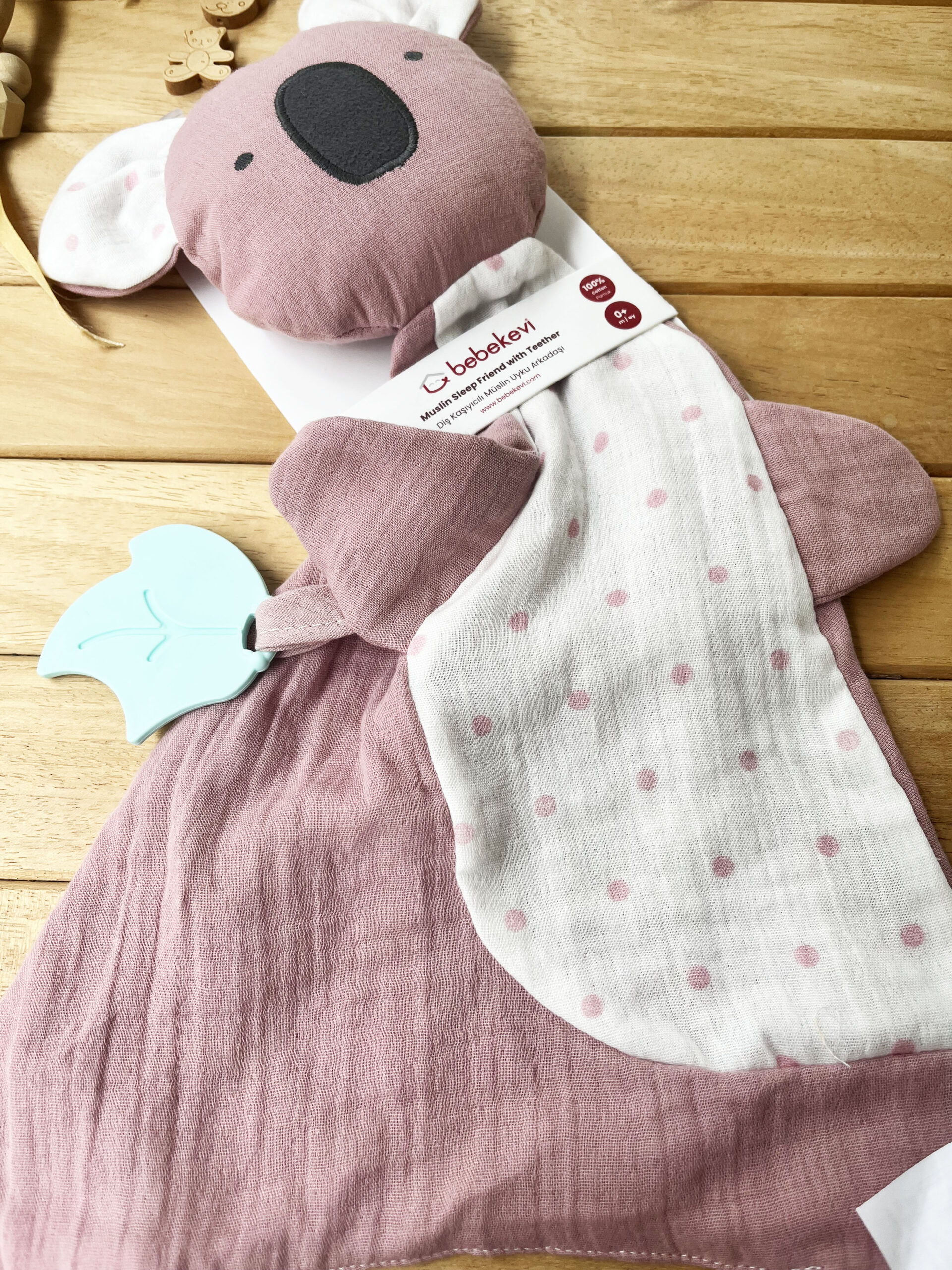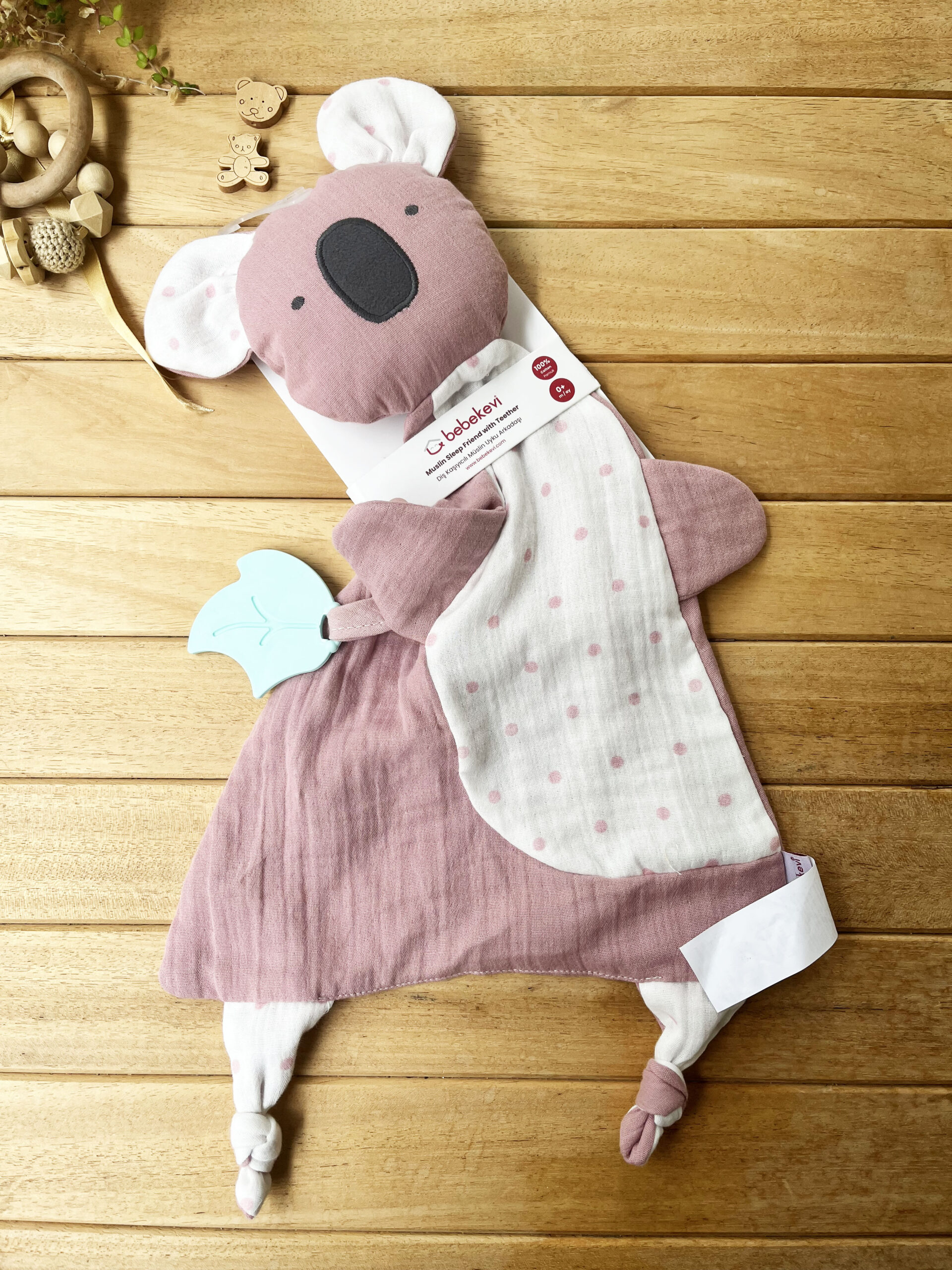 Sevimli Yaprak Diş Kaşıyıcılı Koala %100 Pamuklu Müslin Uyku Arkadaşı – Gül Kurusu