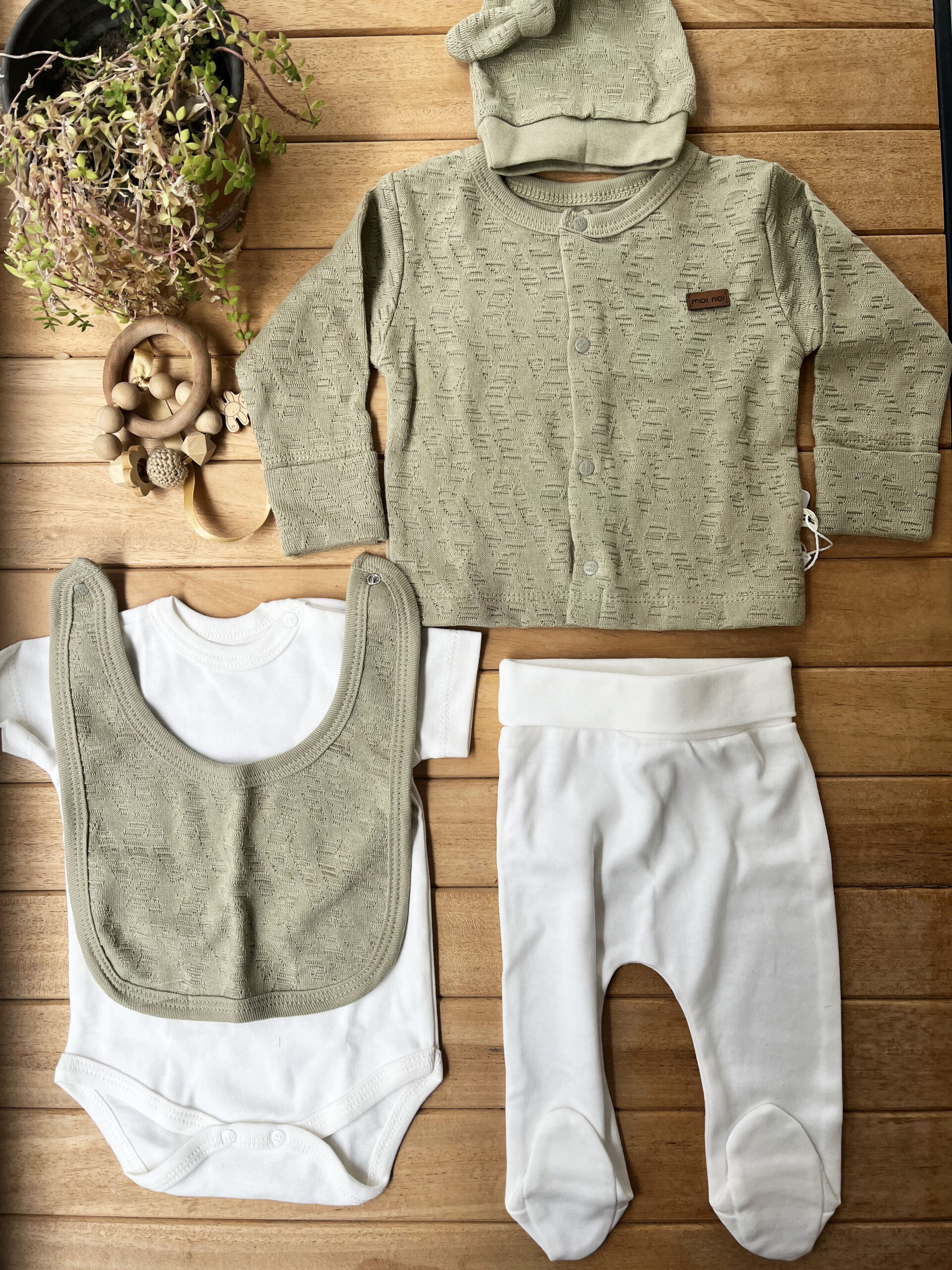 MoiNoi %100 Pamuk 5’li Hastane Çıkış Seti – Haki | Doğal, Konforlu ve Modern Yenidoğan Seti