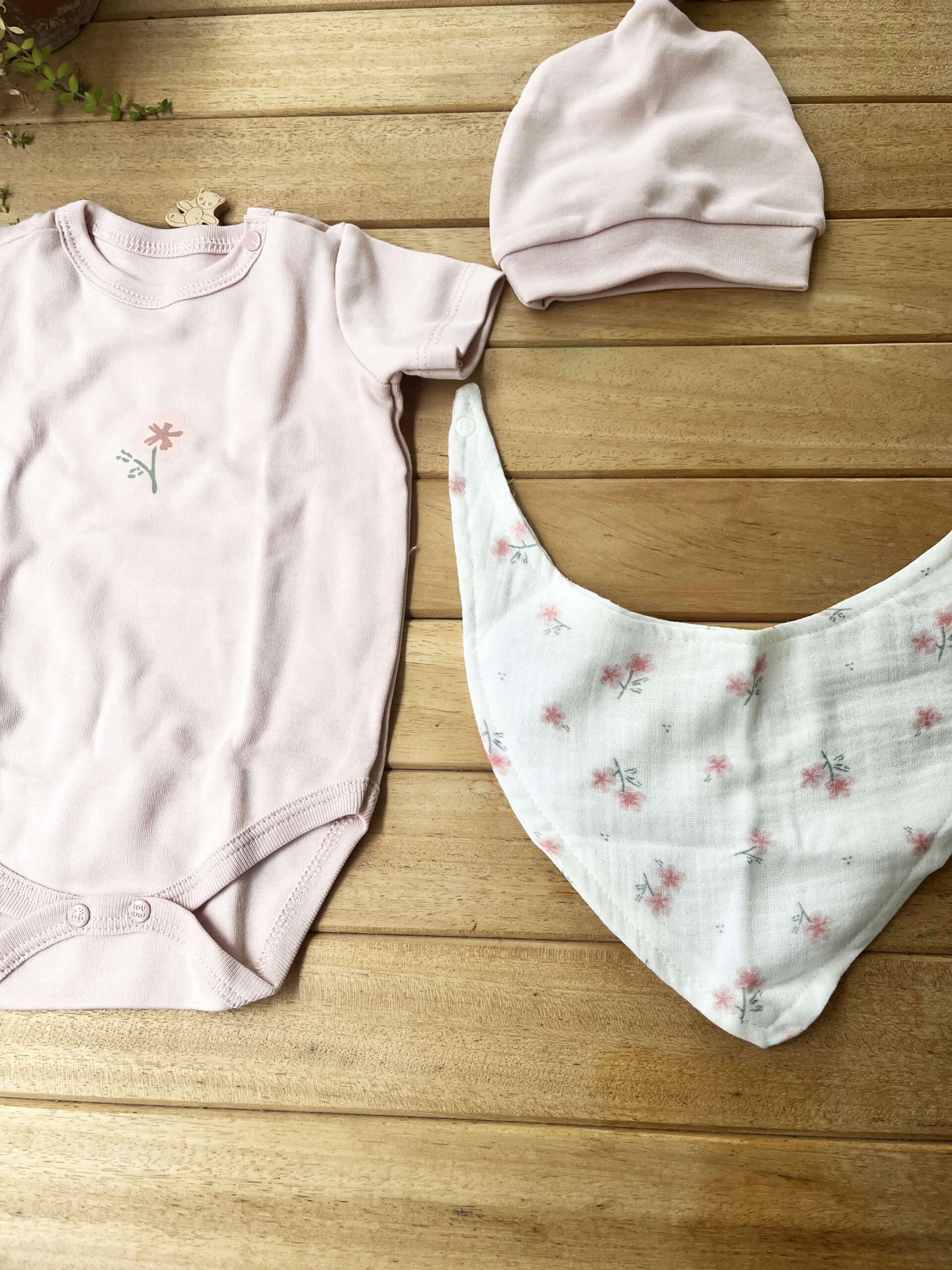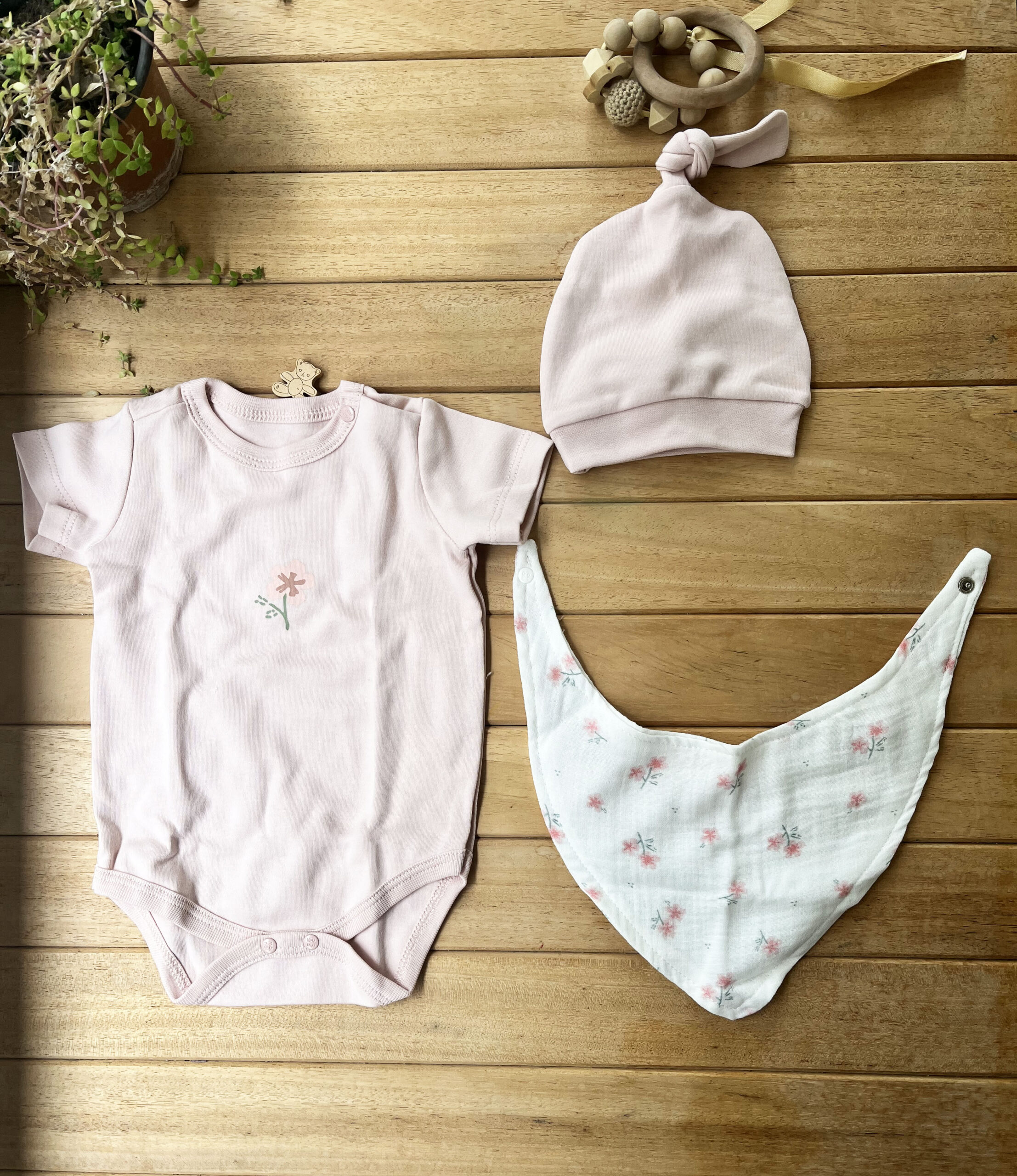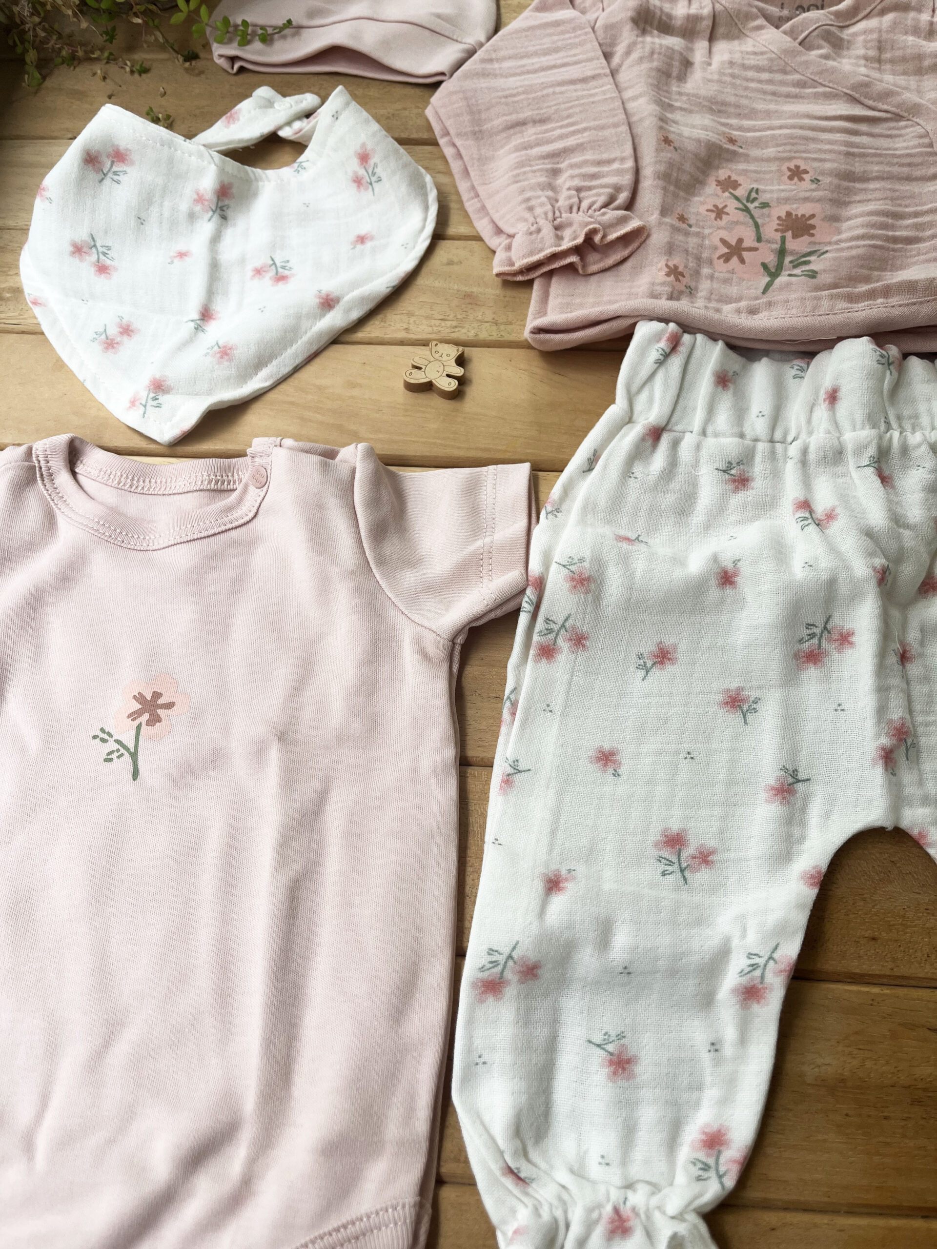 Soft pembe tonları ve minimal tasarımıyla hem sade hem de zarif bir görünüm sunan bu set, doğum çantası hazırlığı için ideal olup günlük kullanım ve hediye seçeneklerinde de öne çıkar.