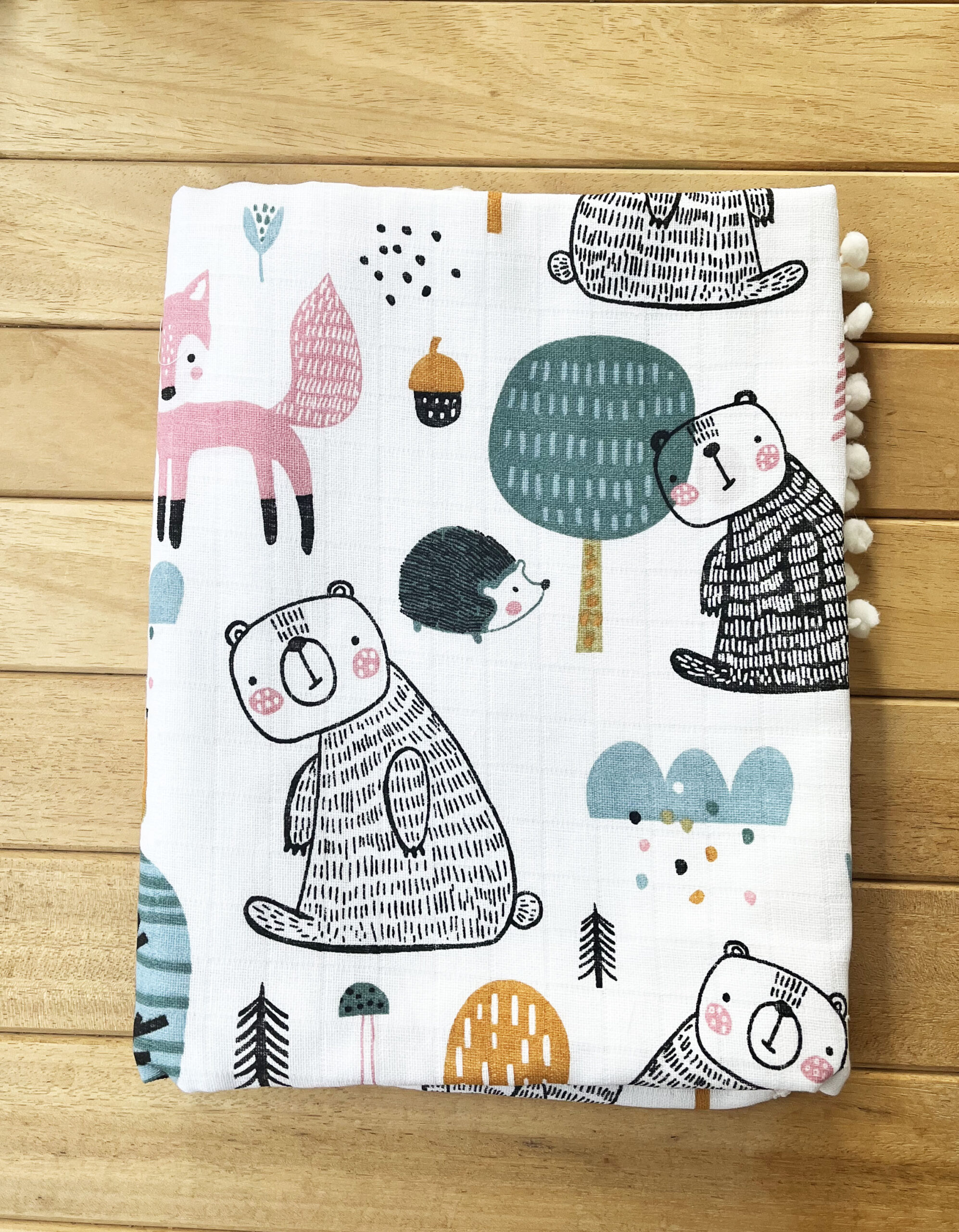 Ön Tarafı Müslin Arka Tarafı Vafıl Kumaş Kenarları Ponponlu Ayıcık Desenli Çift Katlı Battaniye