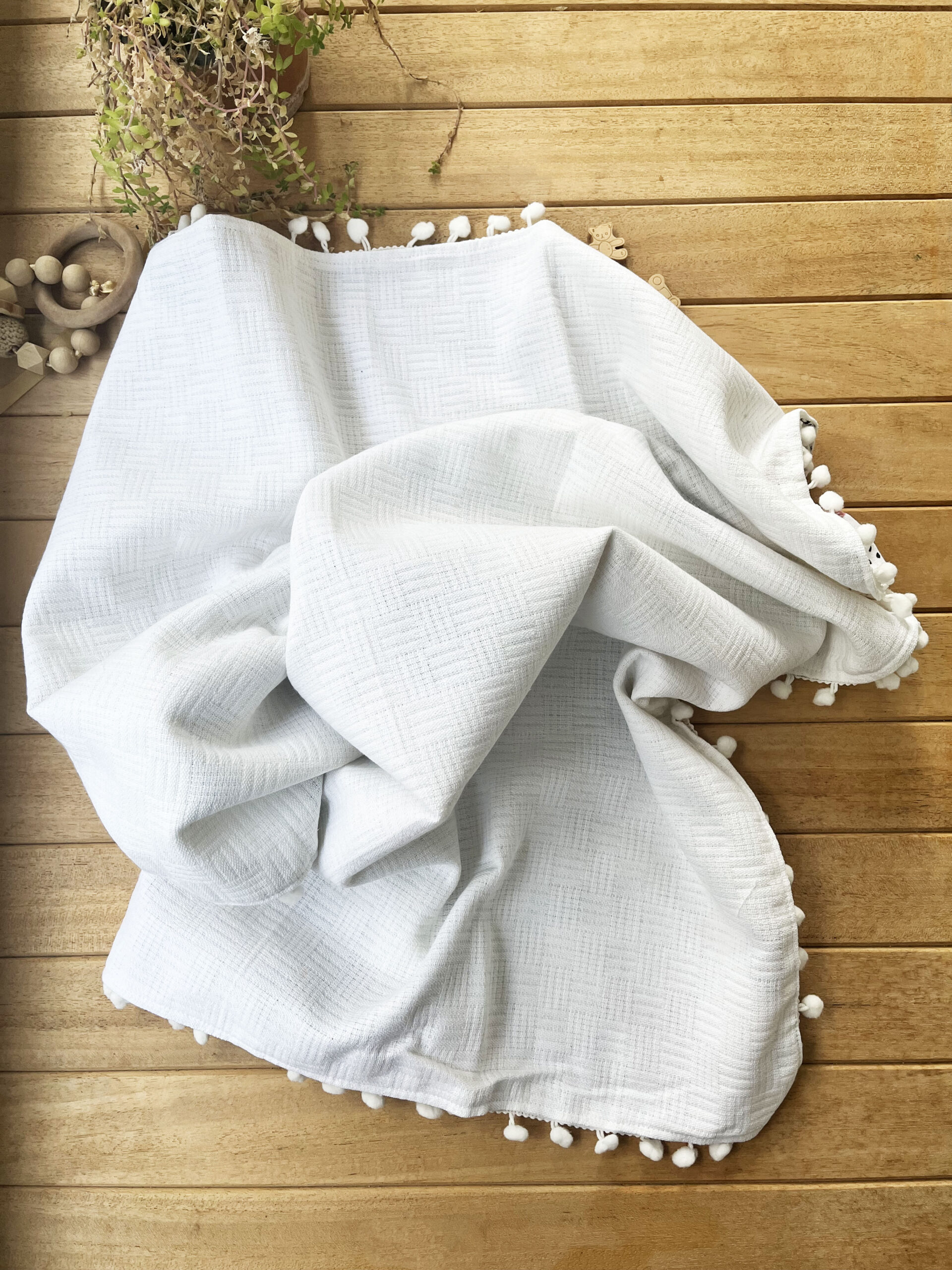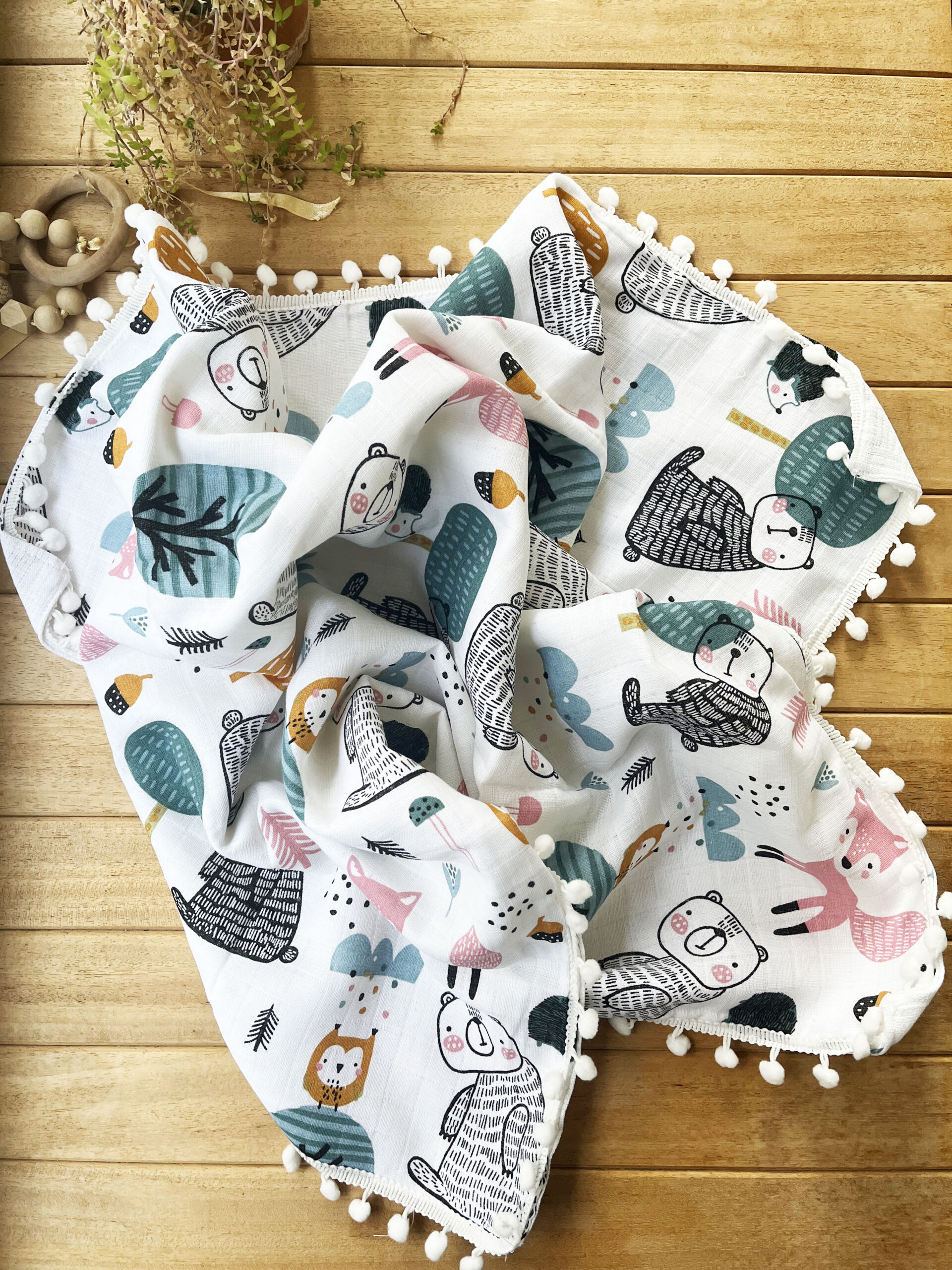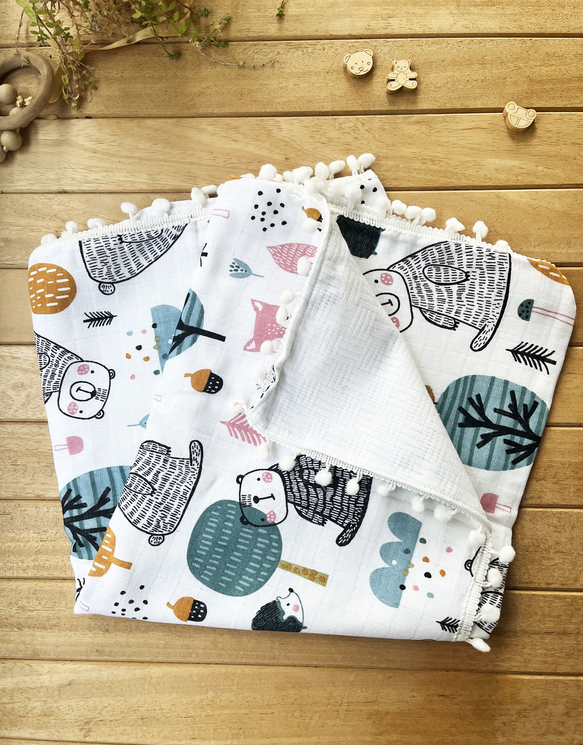 Ayıcık desenli ponponlu müslin–vafıl battaniye, bebeğinizin ilk günden itibaren en sevdiği eşyalardan biri olacak. 💛