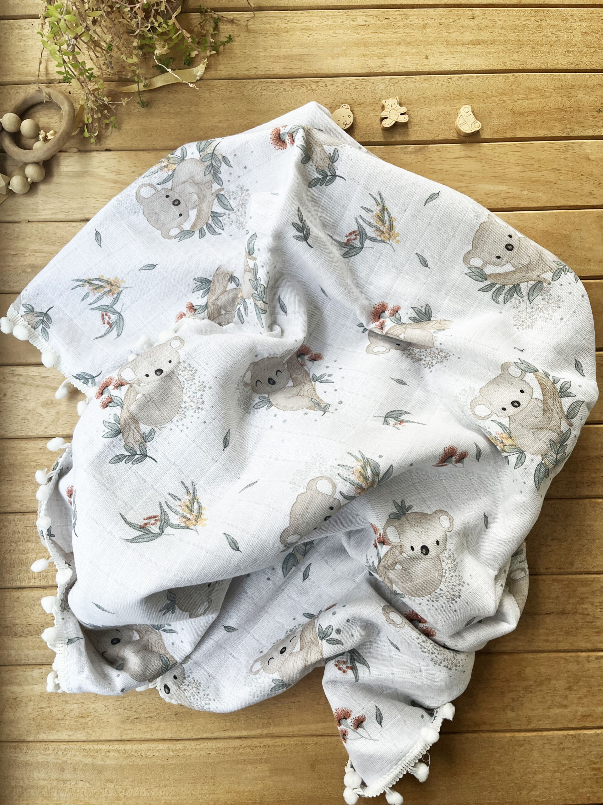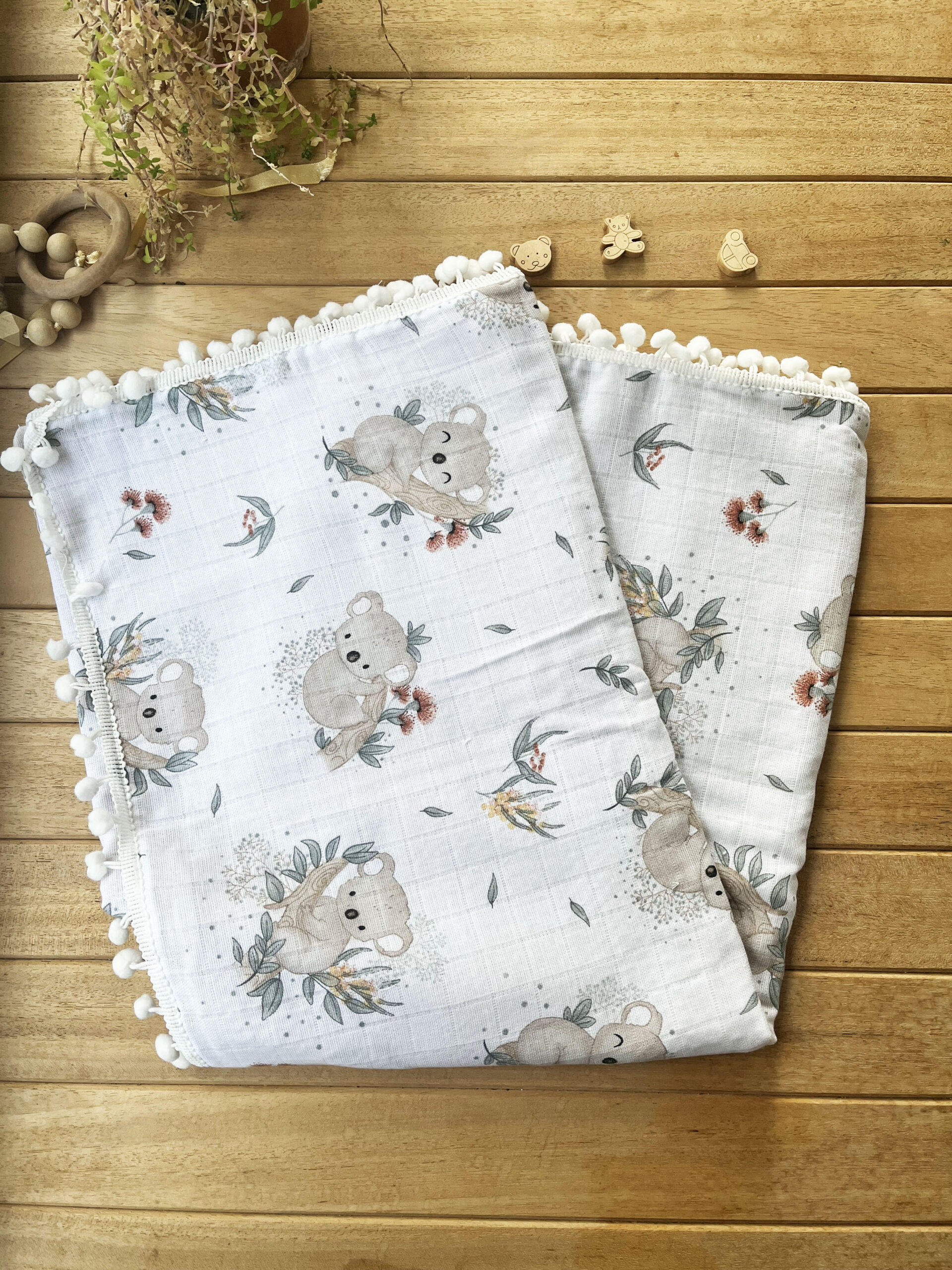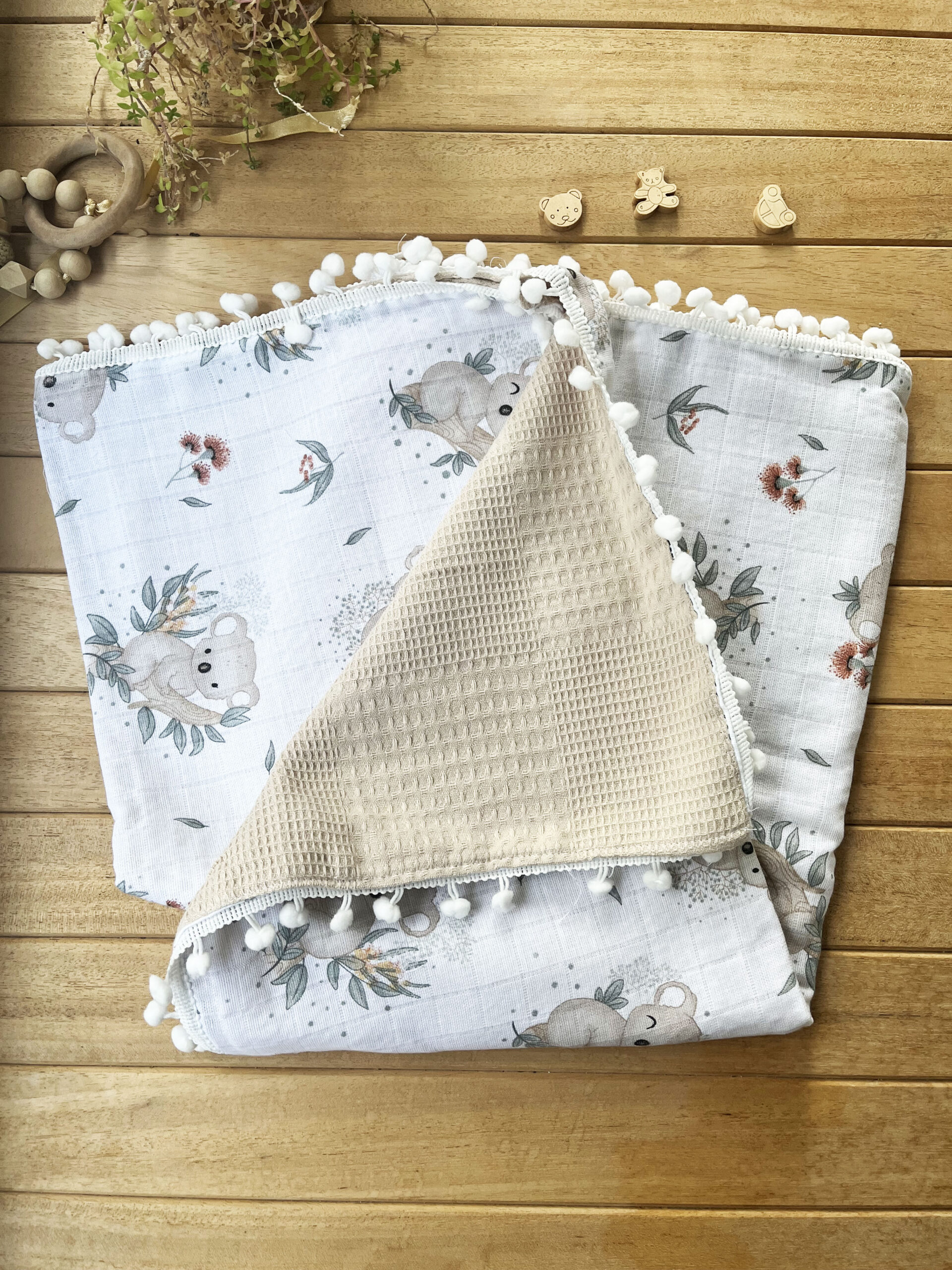 Ön Tarafı Müslin Arka Tarafı Vafıl Kumaş Kenarları Ponponlu Koala Desenli Çift Katlı Battaniye