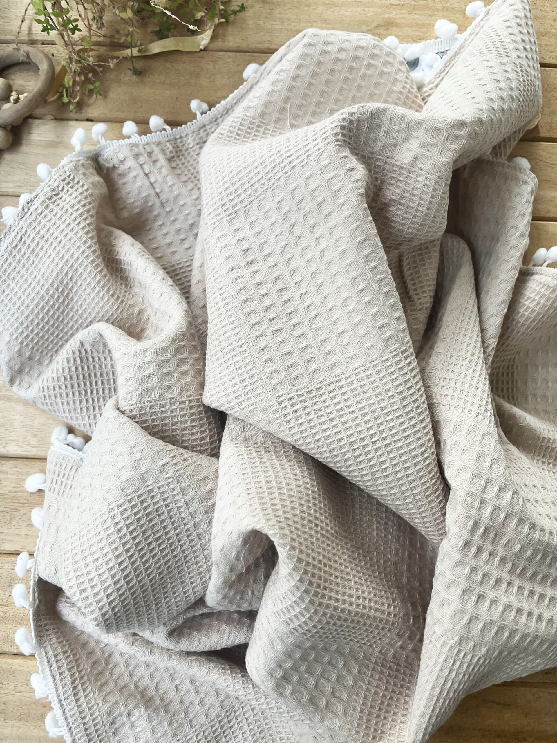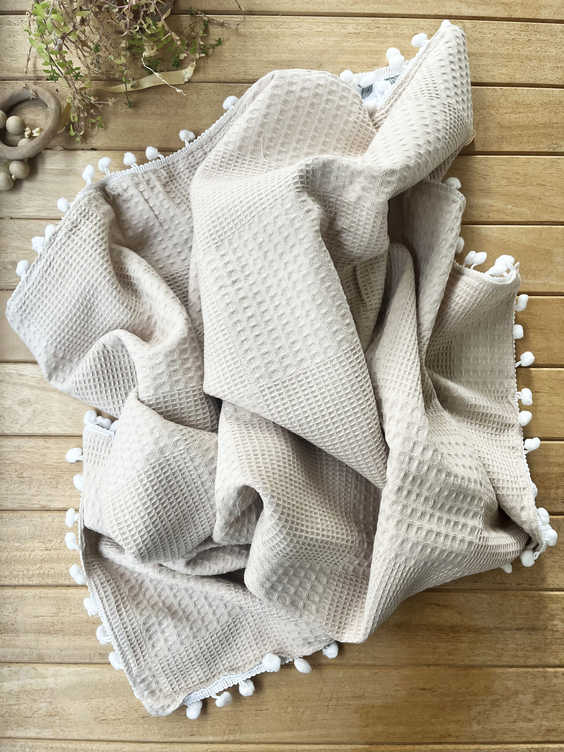 Ayıcık desenli ponponlu müslin–vafıl battaniye, bebeğinizin ilk günden itibaren en sevdiği eşyalardan biri olacak. 💛