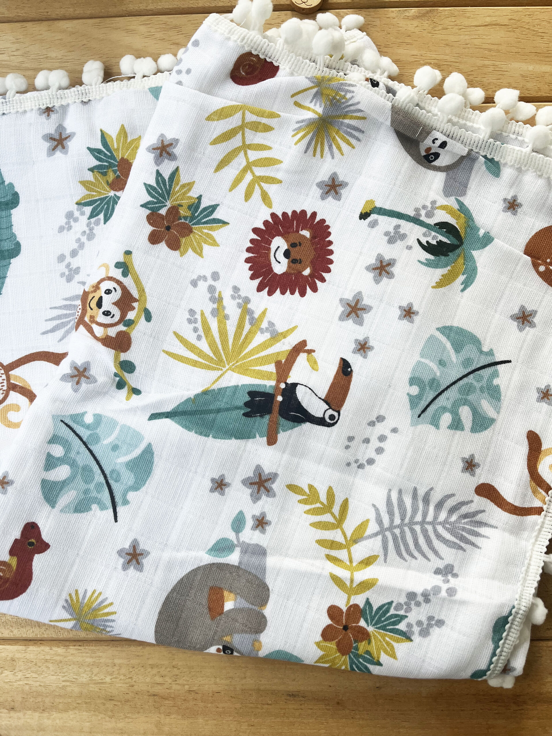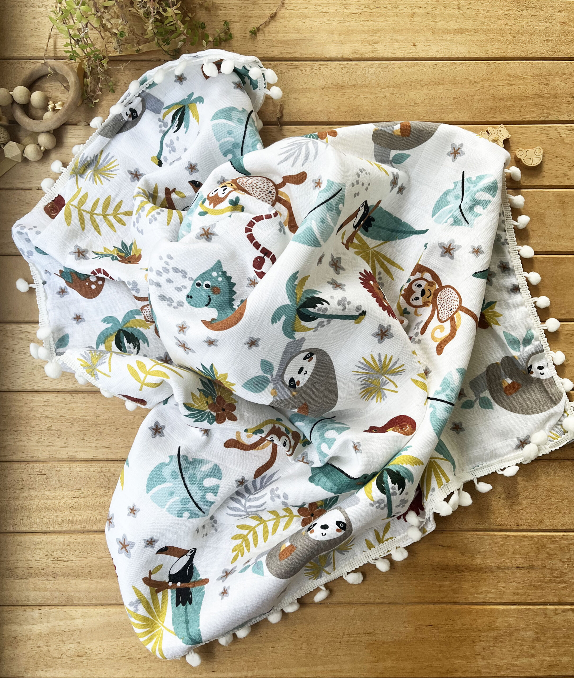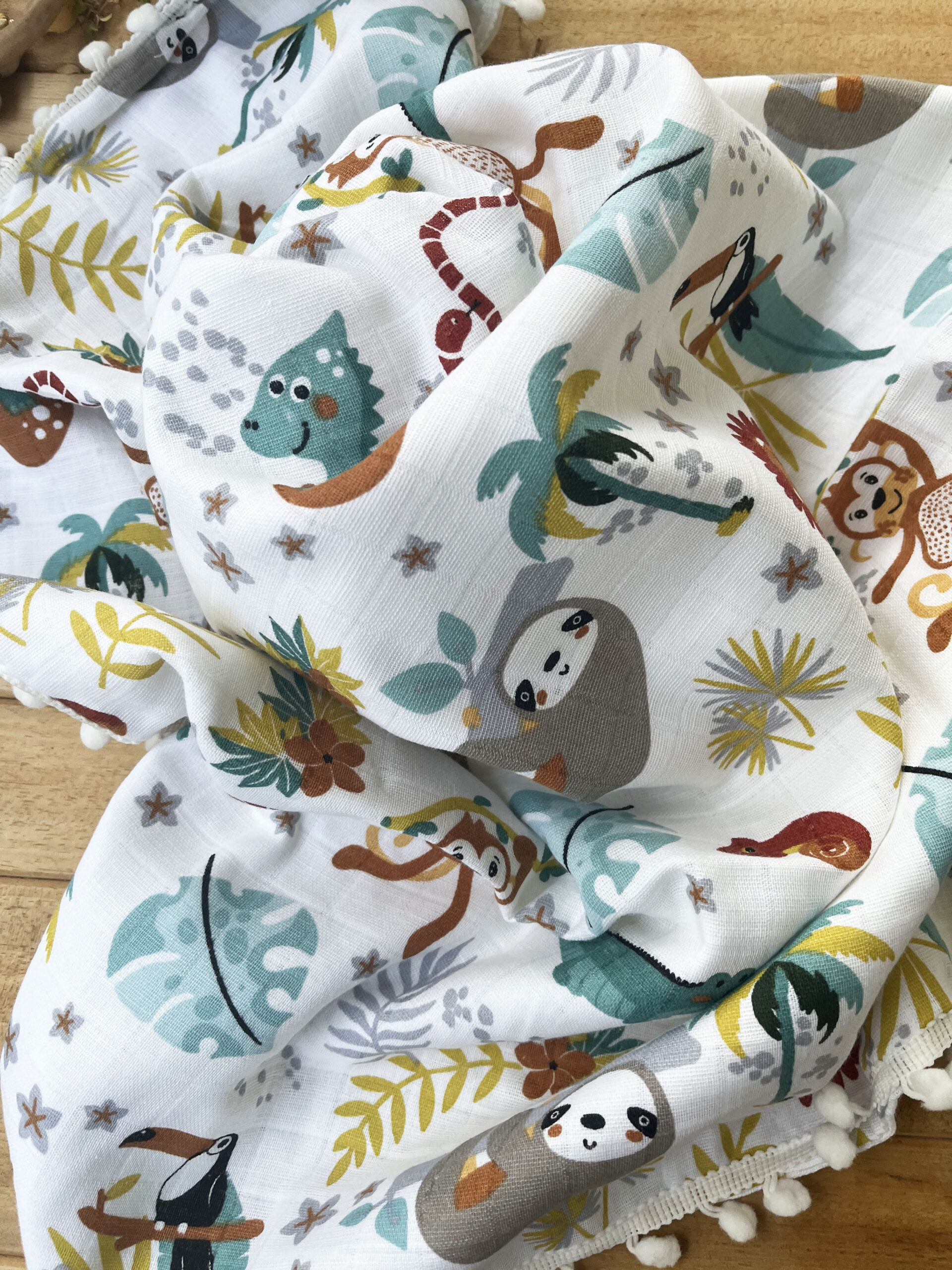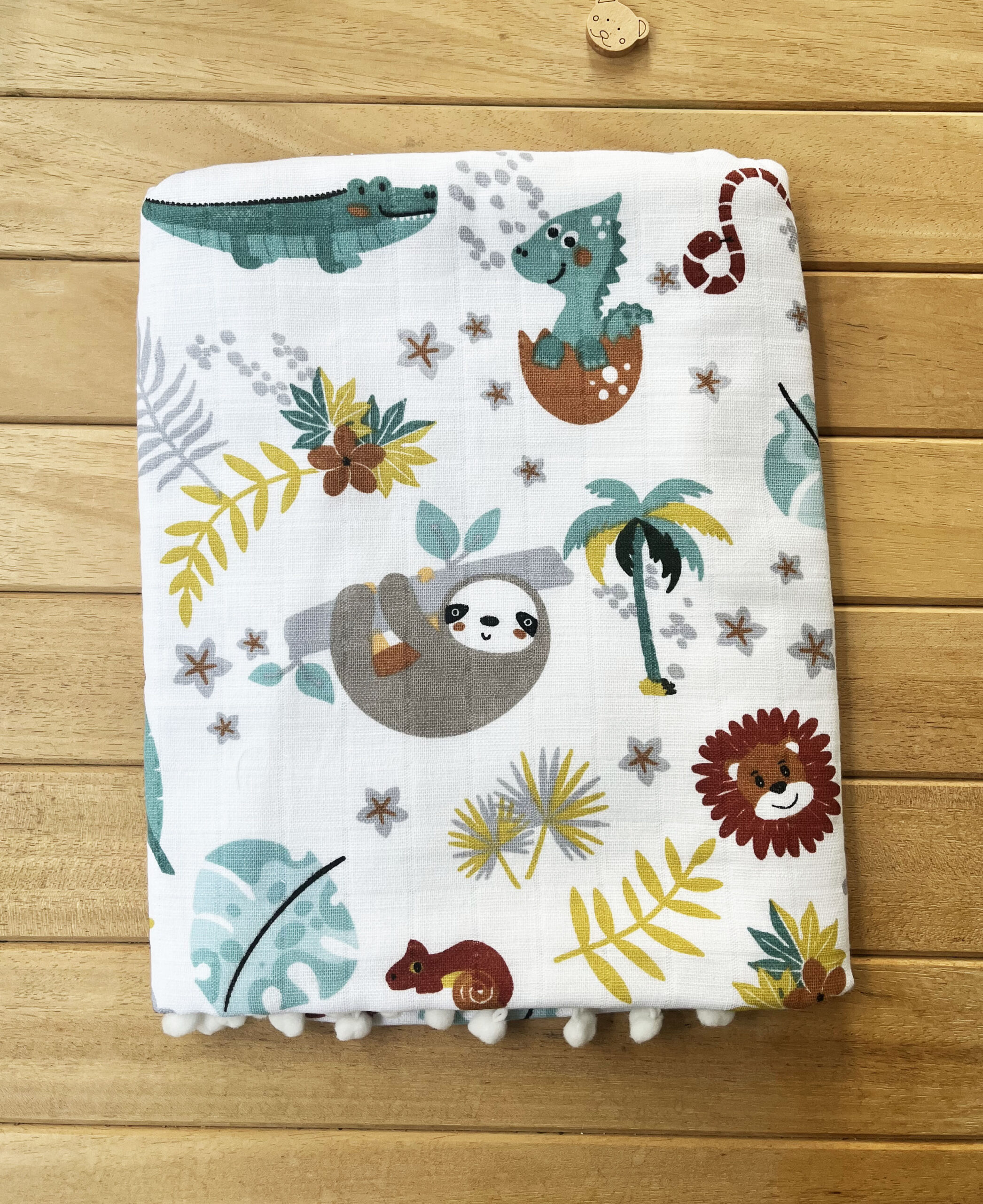 Önü nefes alan %100 pamuk müslin, arkası ekstra yumuşak vafıl kumaş ile hazırlanan bu çift katlı orman desenli battaniye, miniklere hem konforu hem de sıcaklığı aynı anda sunuyor. 🐻✨