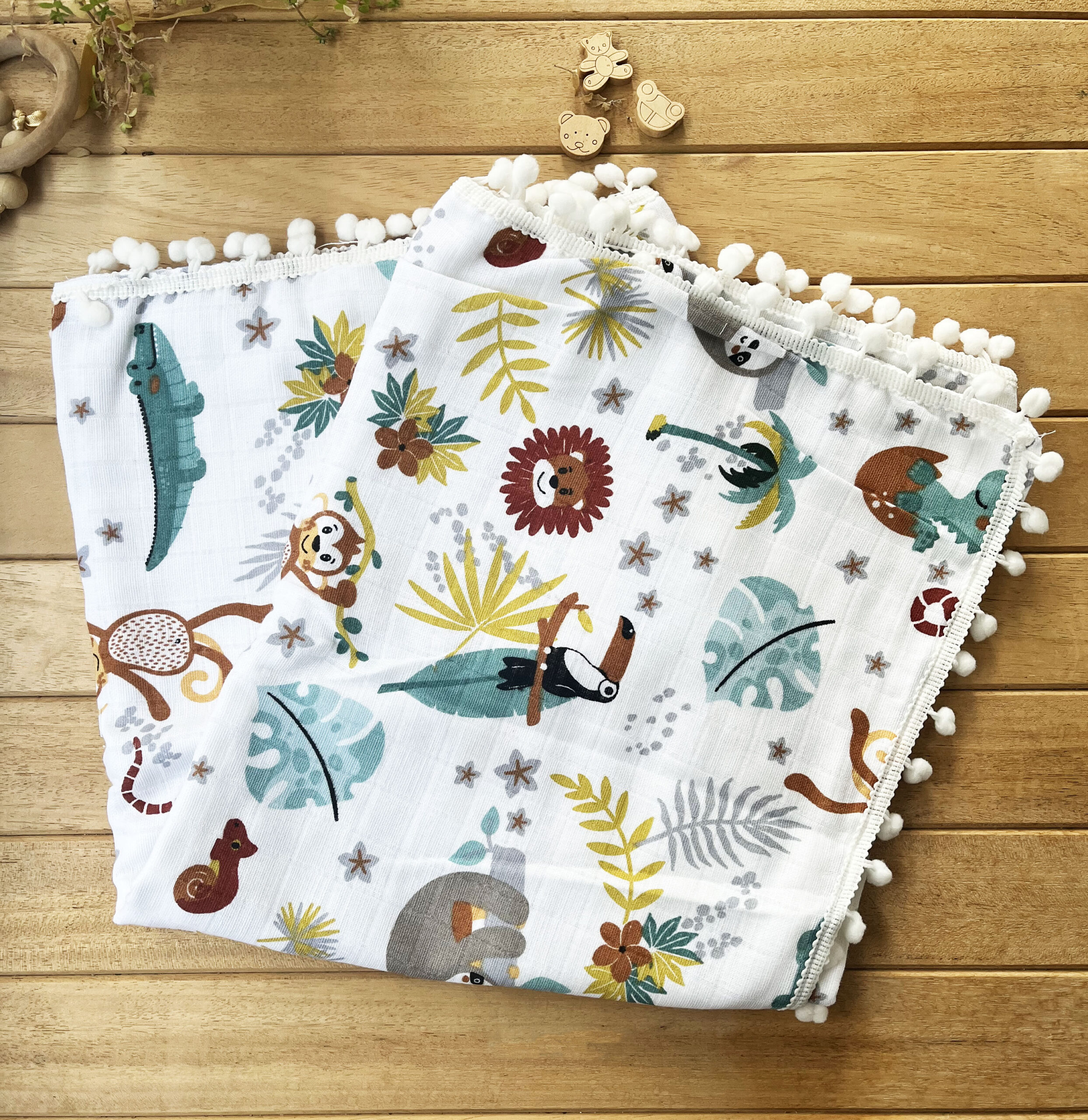 Ön Tarafı Müslin Arka Tarafı Vafıl Kumaş Kenarları Ponponlu Orman Desenli Çift Katlı Battaniye