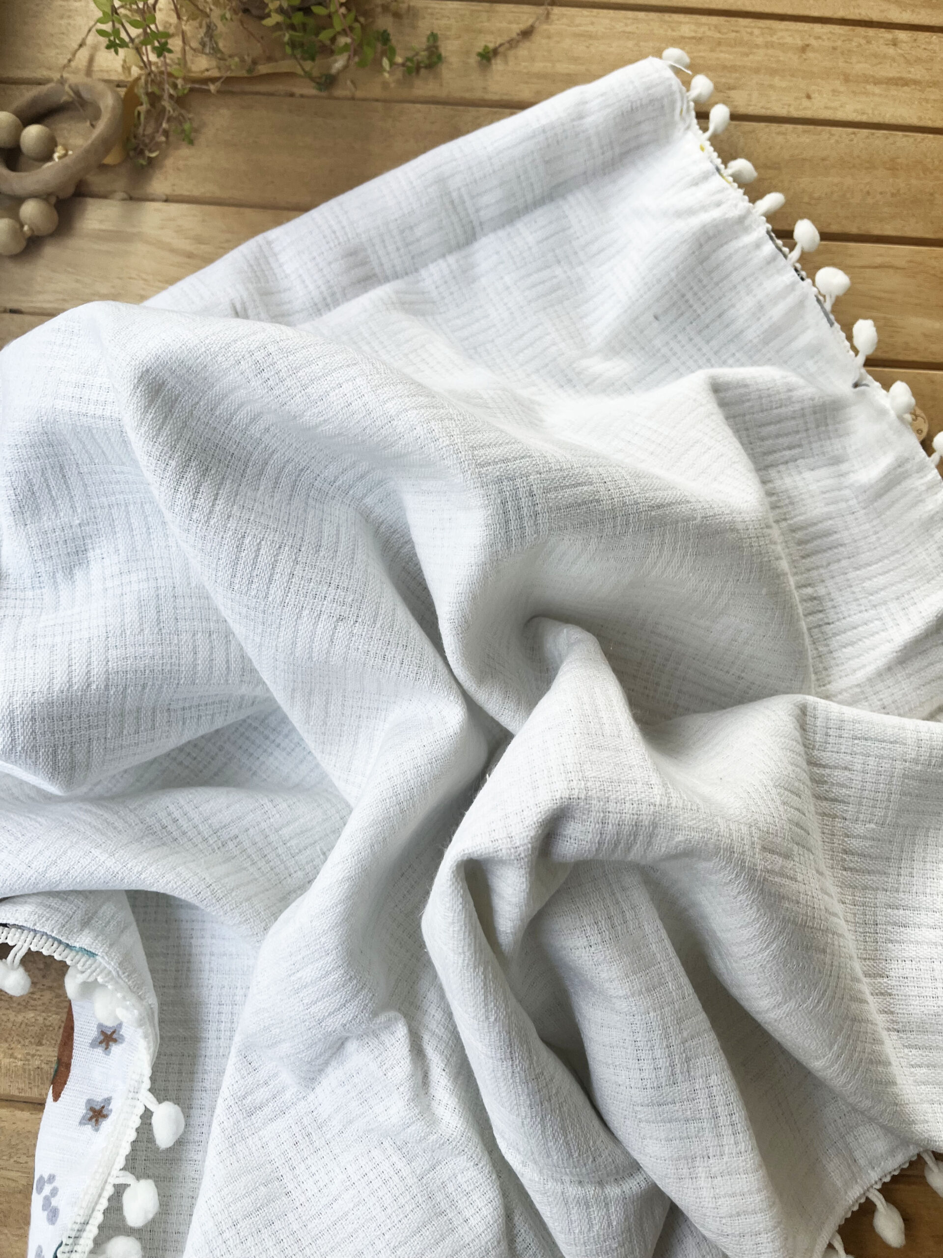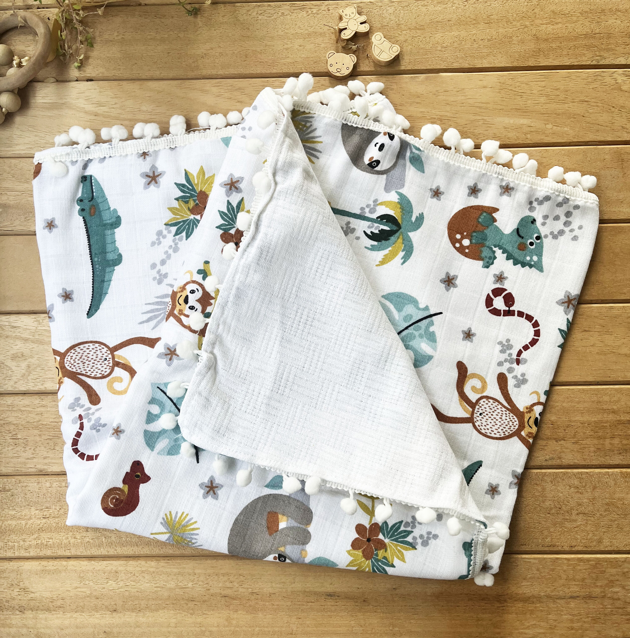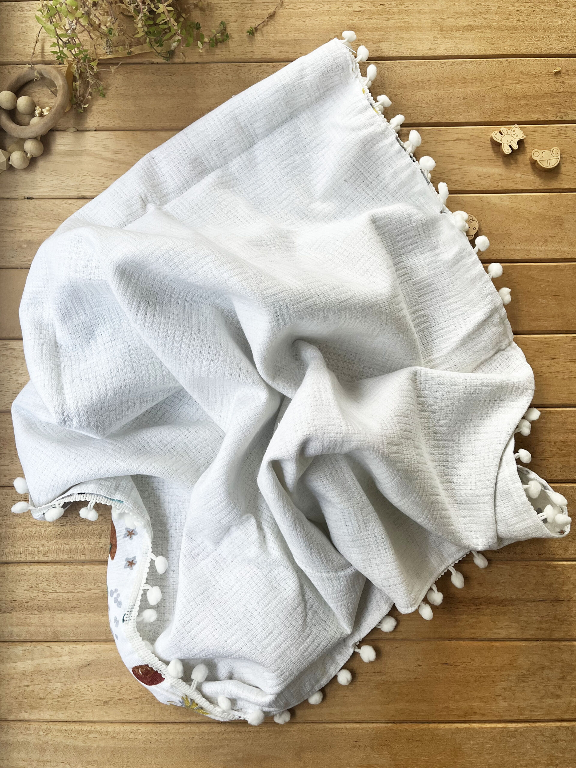 Ayıcık desenli ponponlu müslin–vafıl battaniye, bebeğinizin ilk günden itibaren en sevdiği eşyalardan biri olacak. 💛