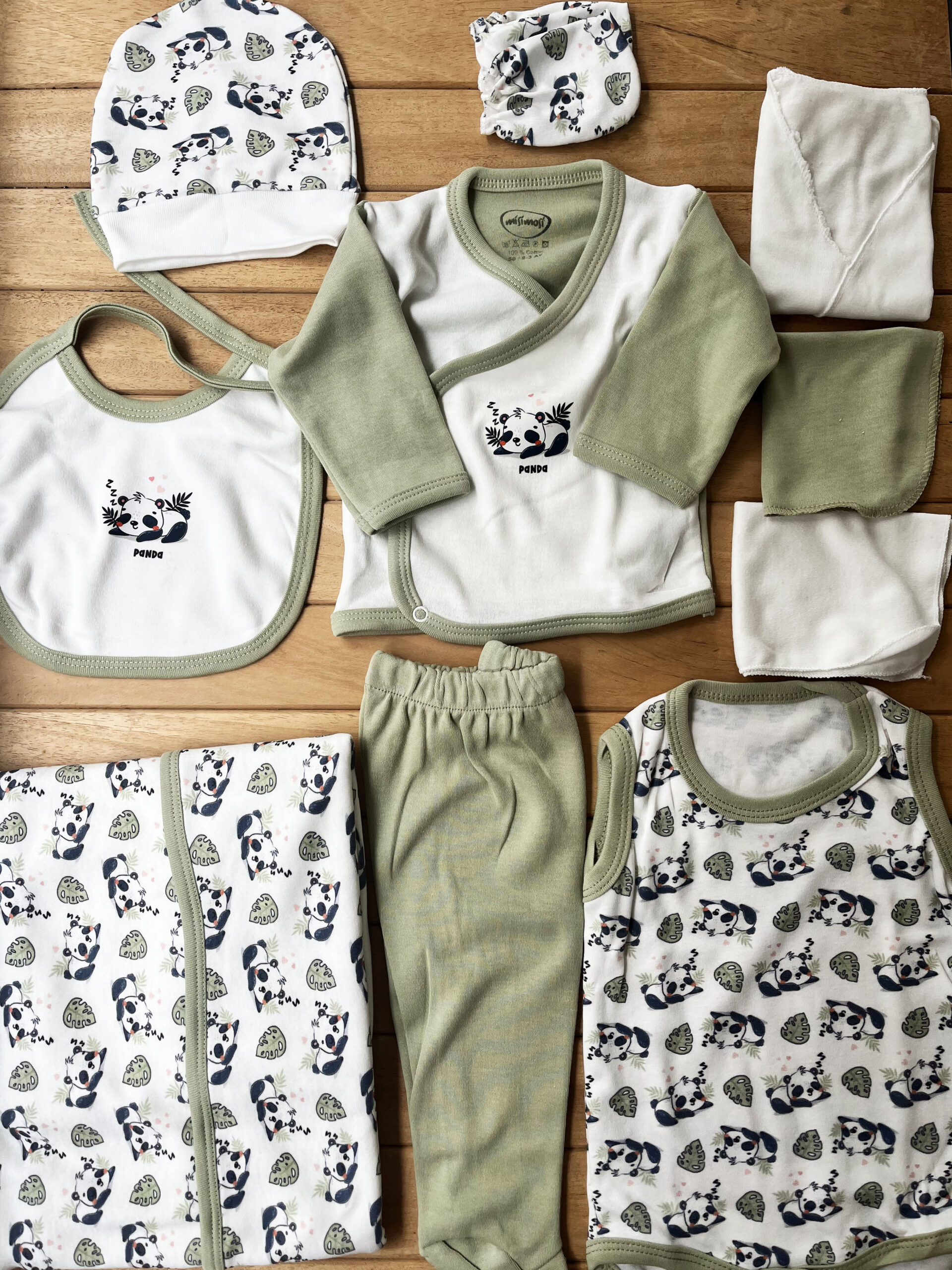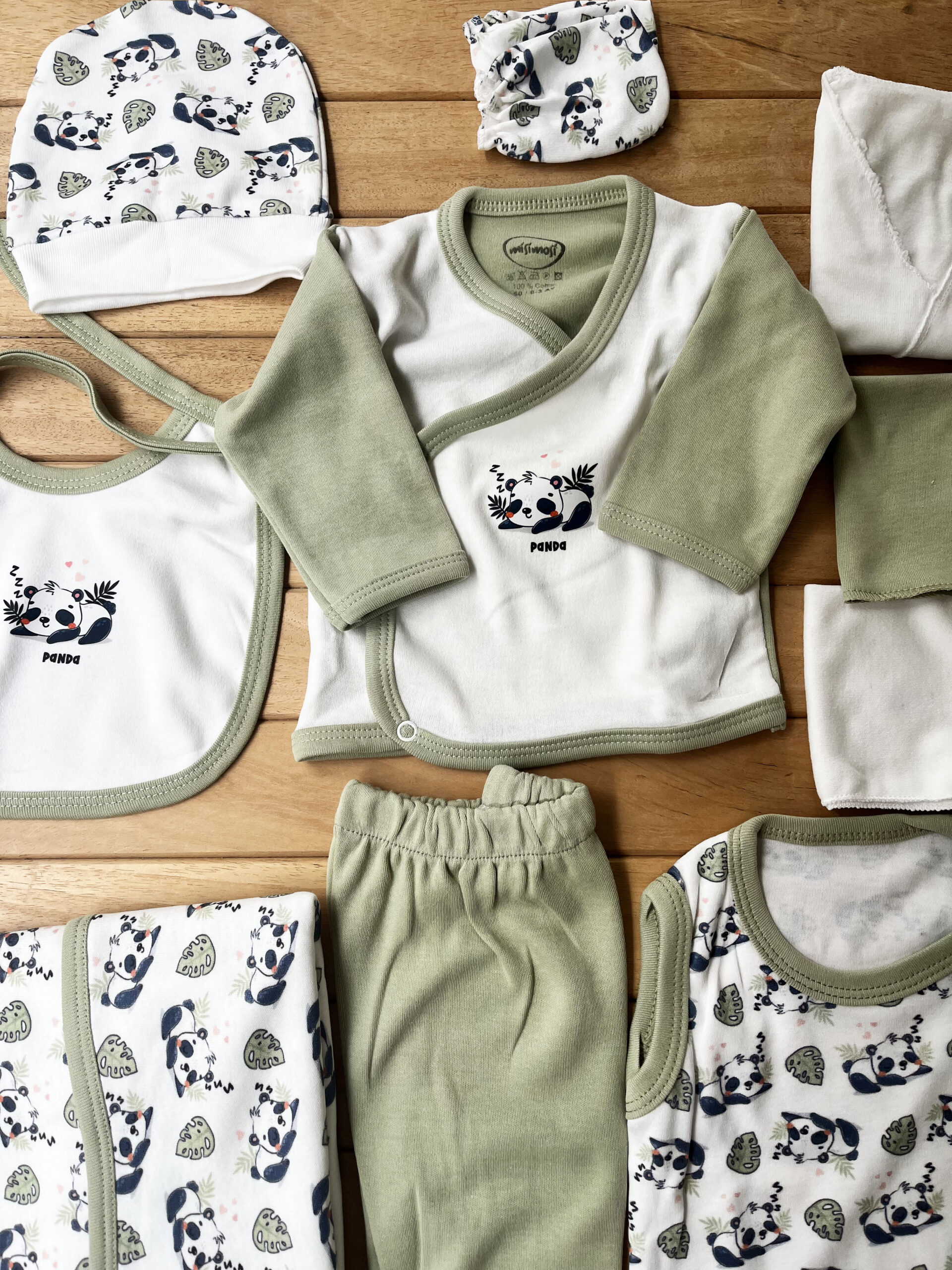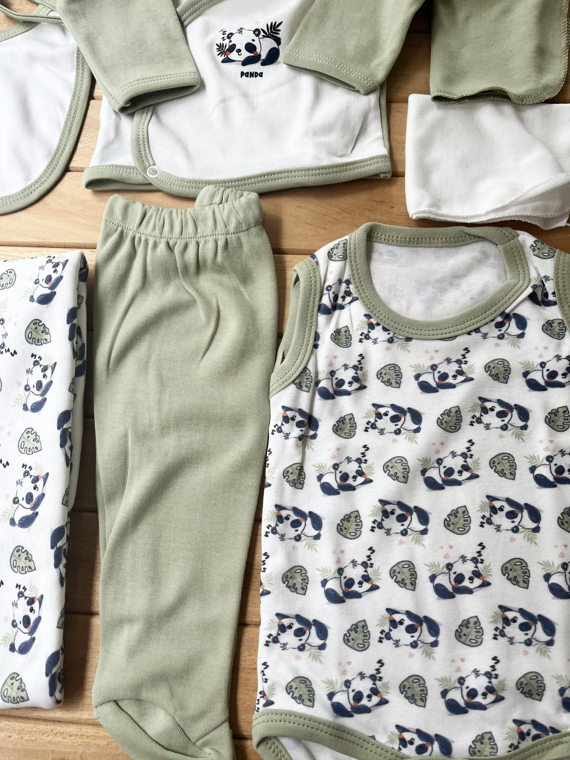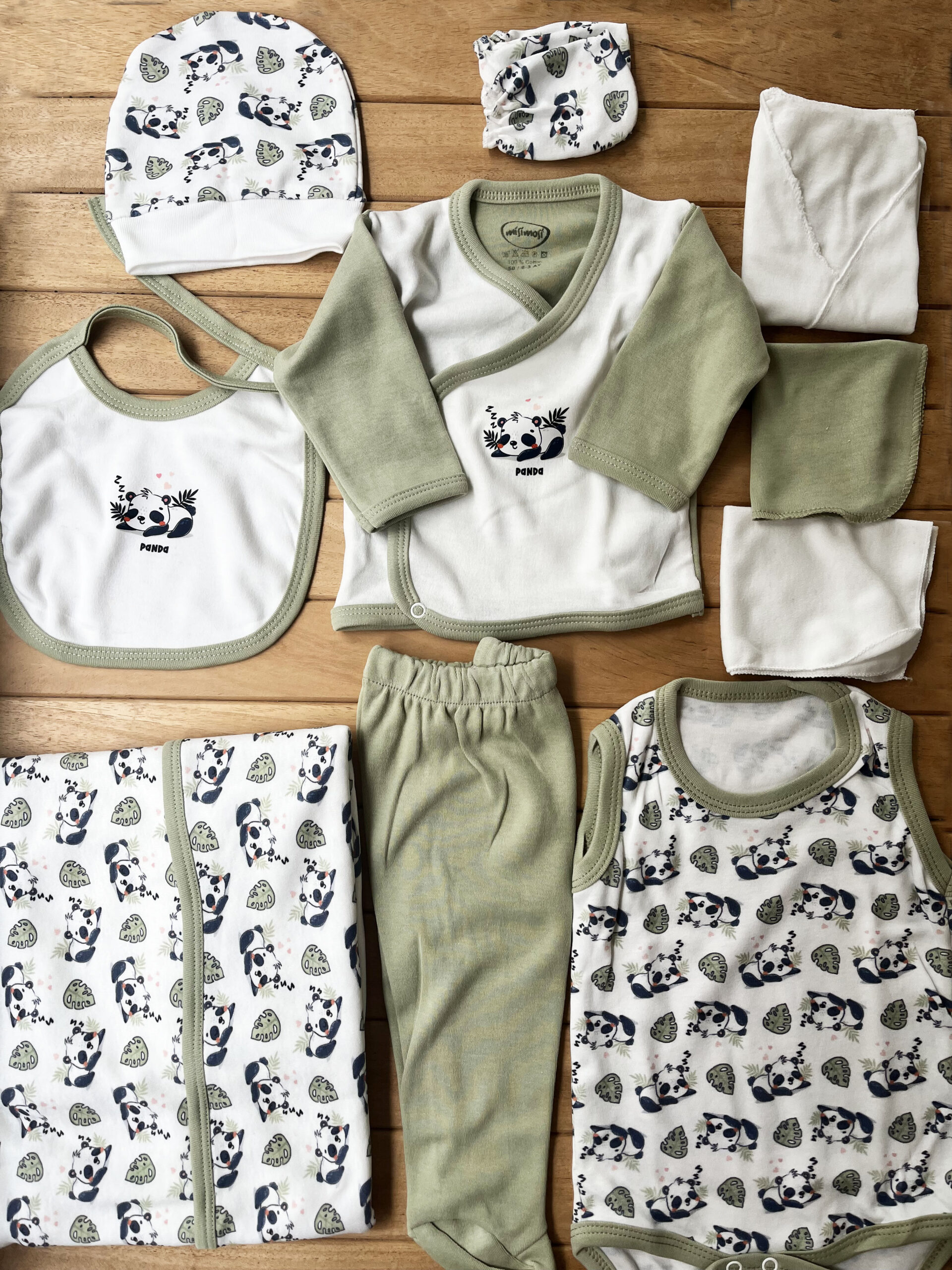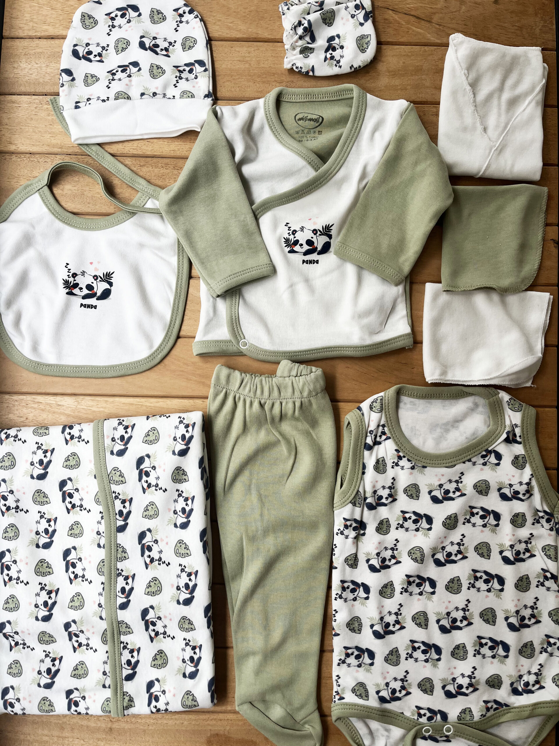 Mint renginin ferahlığı ve panda desenlerinin sevimliliğiyle hazırlanan bu 10’lu hastane çıkışı, yenidoğan hazırlıklarının en özel parçalarından biri olacak! 🐼💚