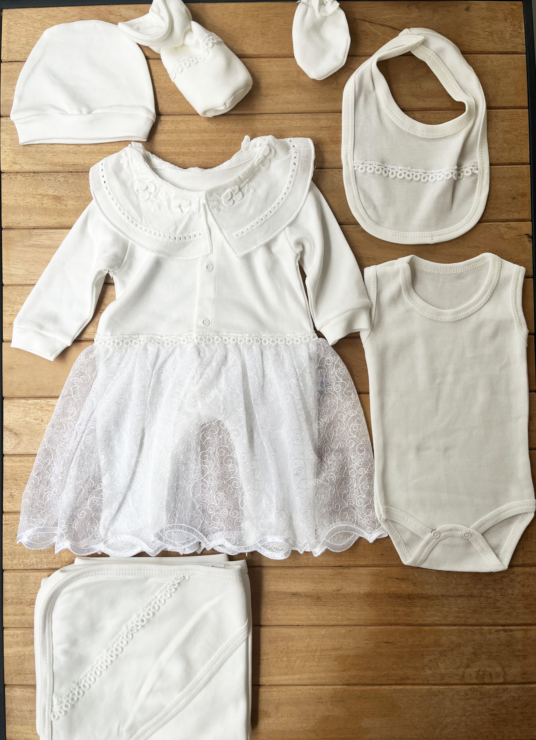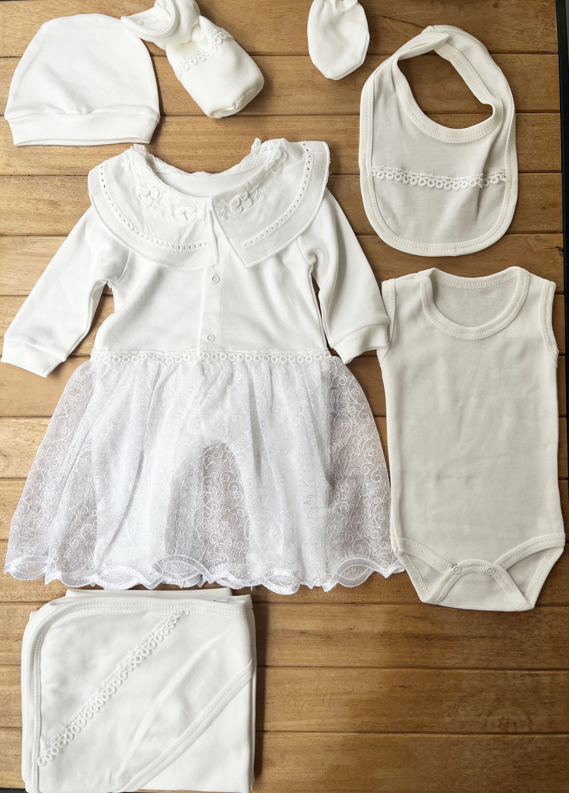 7 Parçalık %100 Pamuk Hastane Çıkışı Seti – Beyaz Elbise Görünümlü Tulum Bebeğinizin ilk günleri için özenle hazırlanan bu 7 parçalık hastane çıkışı seti, zarif beyaz elbise görünümlü tulumu ile şıklığı ve konforu bir araya getiriyor.