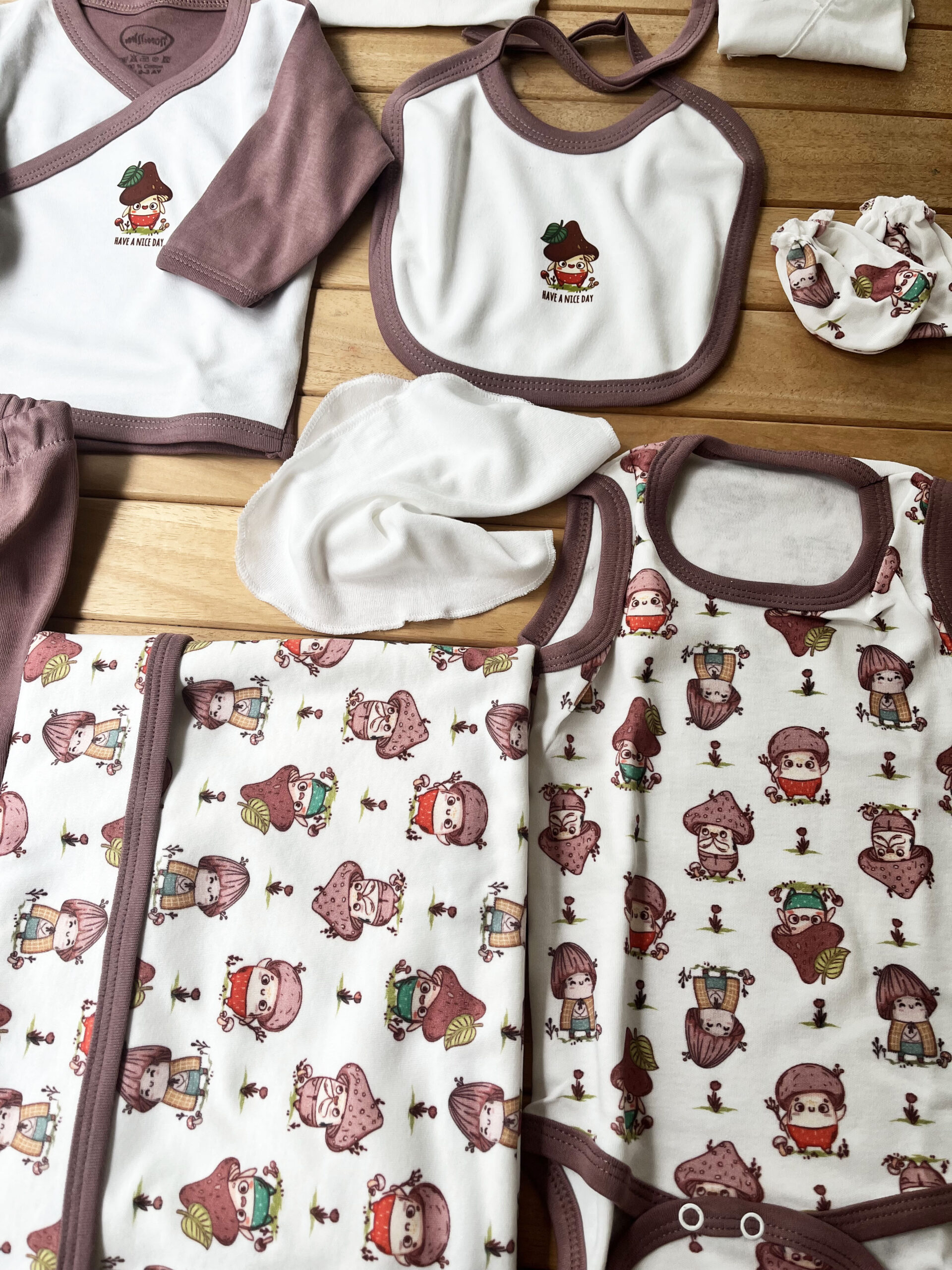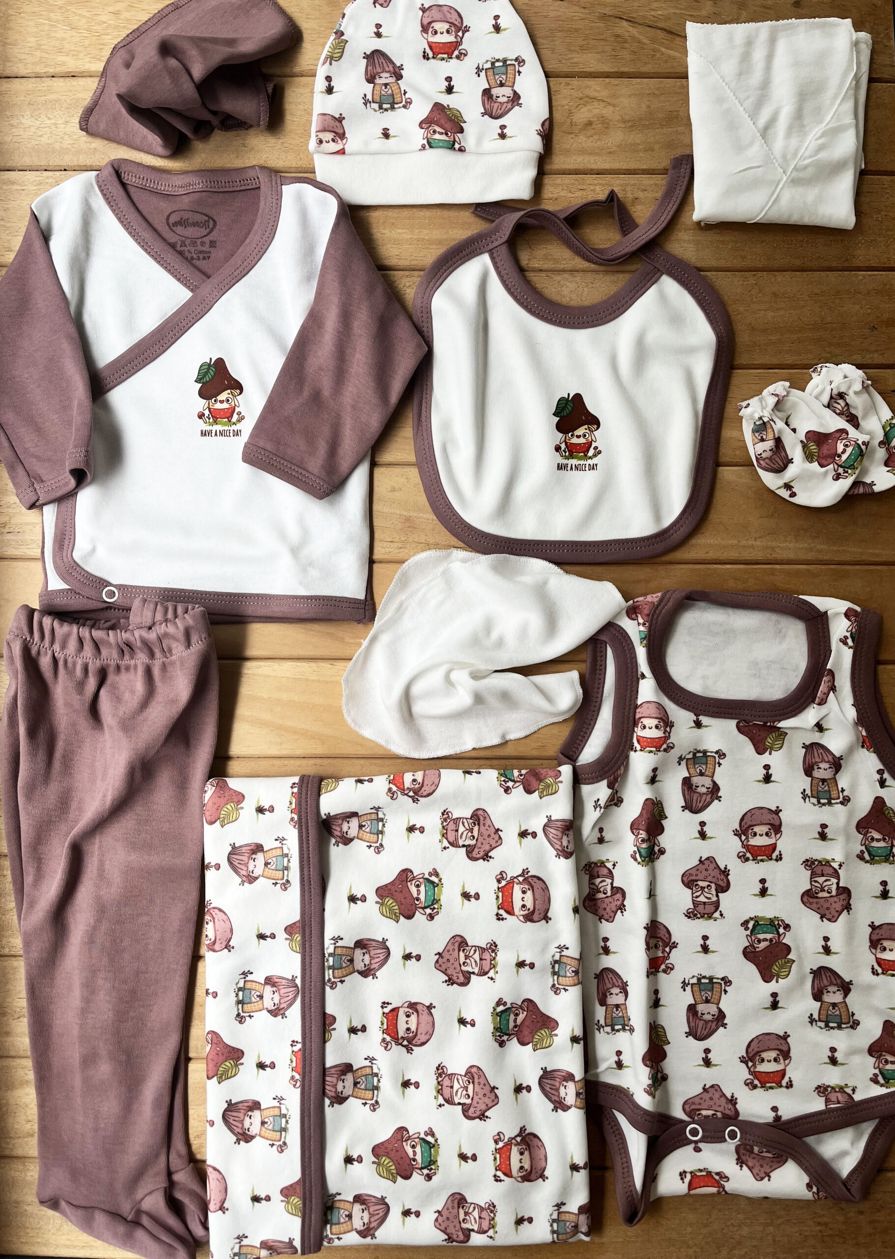 10’lu Kahverengi Mantar Desenli Erkek Hastane Çıkışı – %100 Pamuk Doğanın sıcak tonlarından ilham alınarak tasarlanan kahverengi mantar desenli bu 10’lu erkek hastane çıkışı seti, bebeğinizin ilk günlerinde ihtiyaç duyacağı tüm parçaları bir arada sunar.