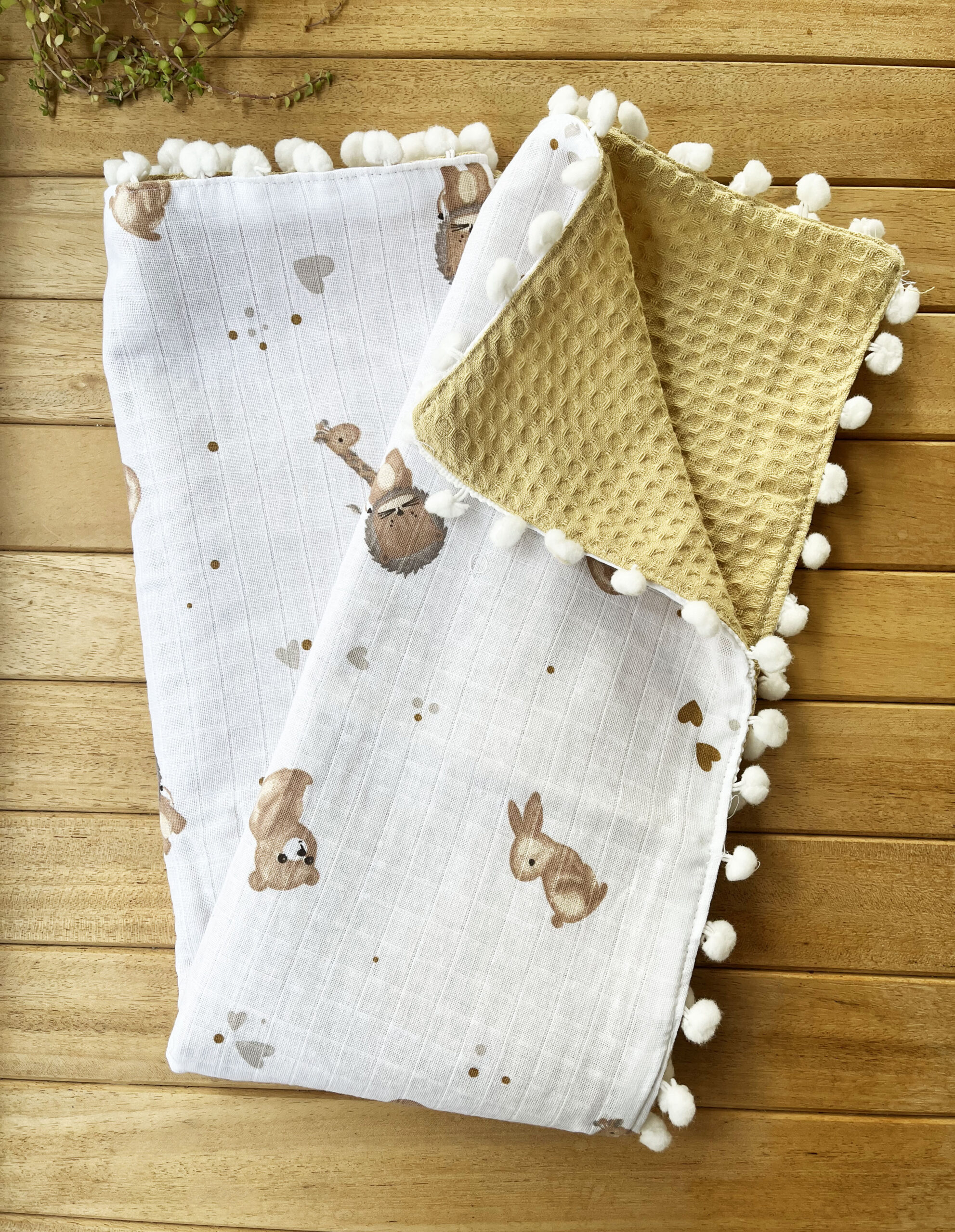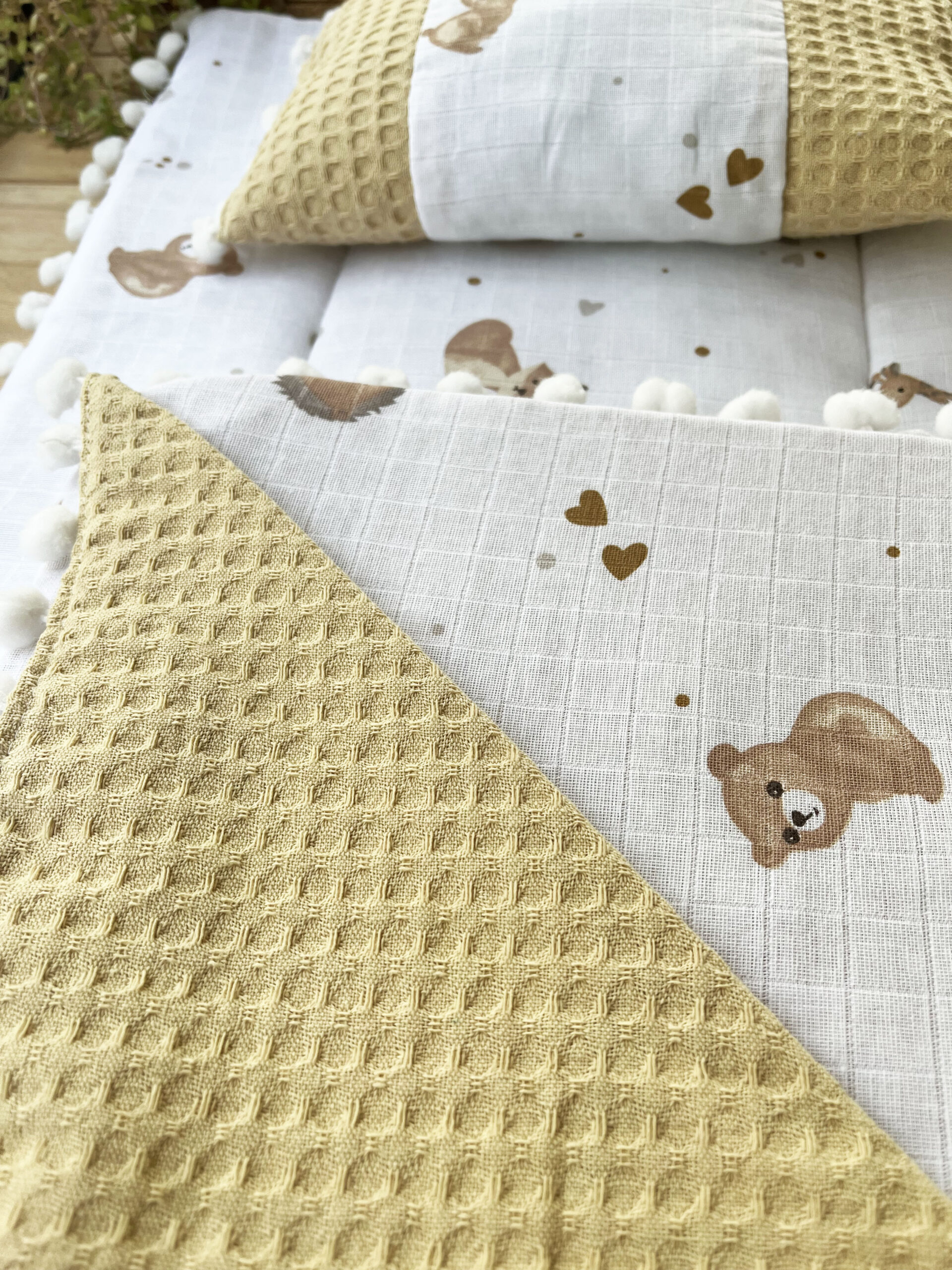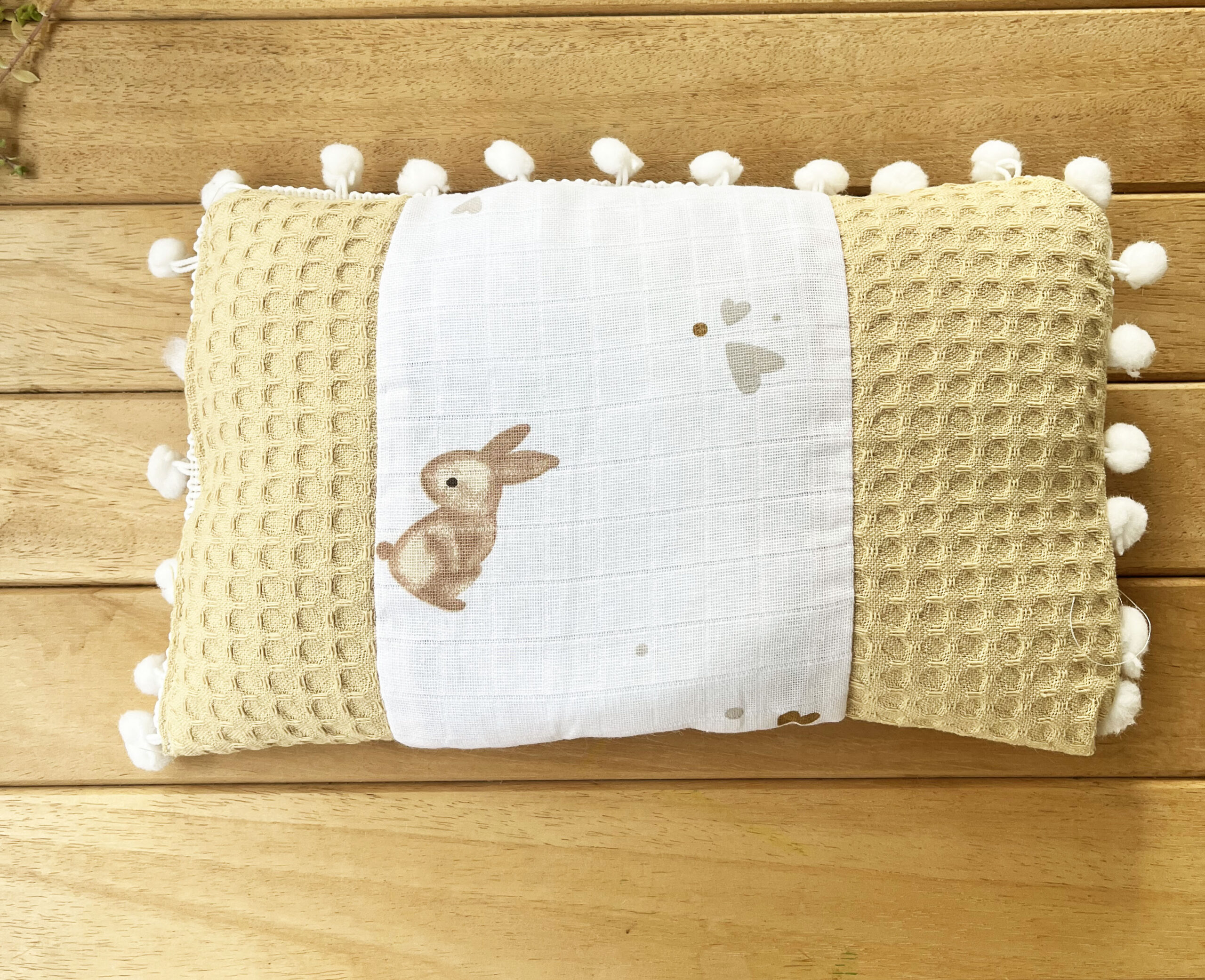 Tavşan Desenli Çift Katlı Müslin ve Waffle Kumaş Alt Açma , Yastık ve Battaniye 3’lü Set 40 x 70 Tek Ebat