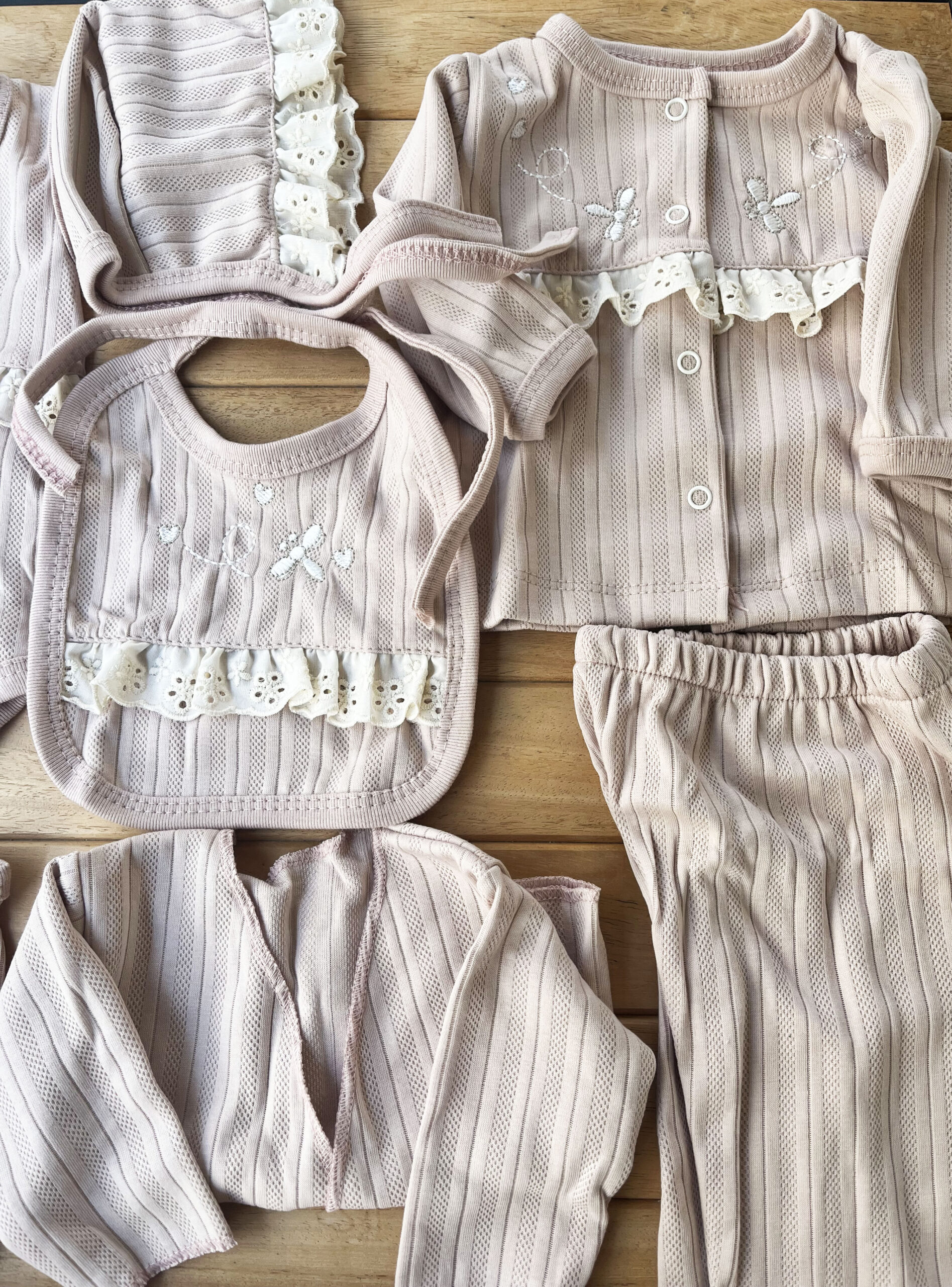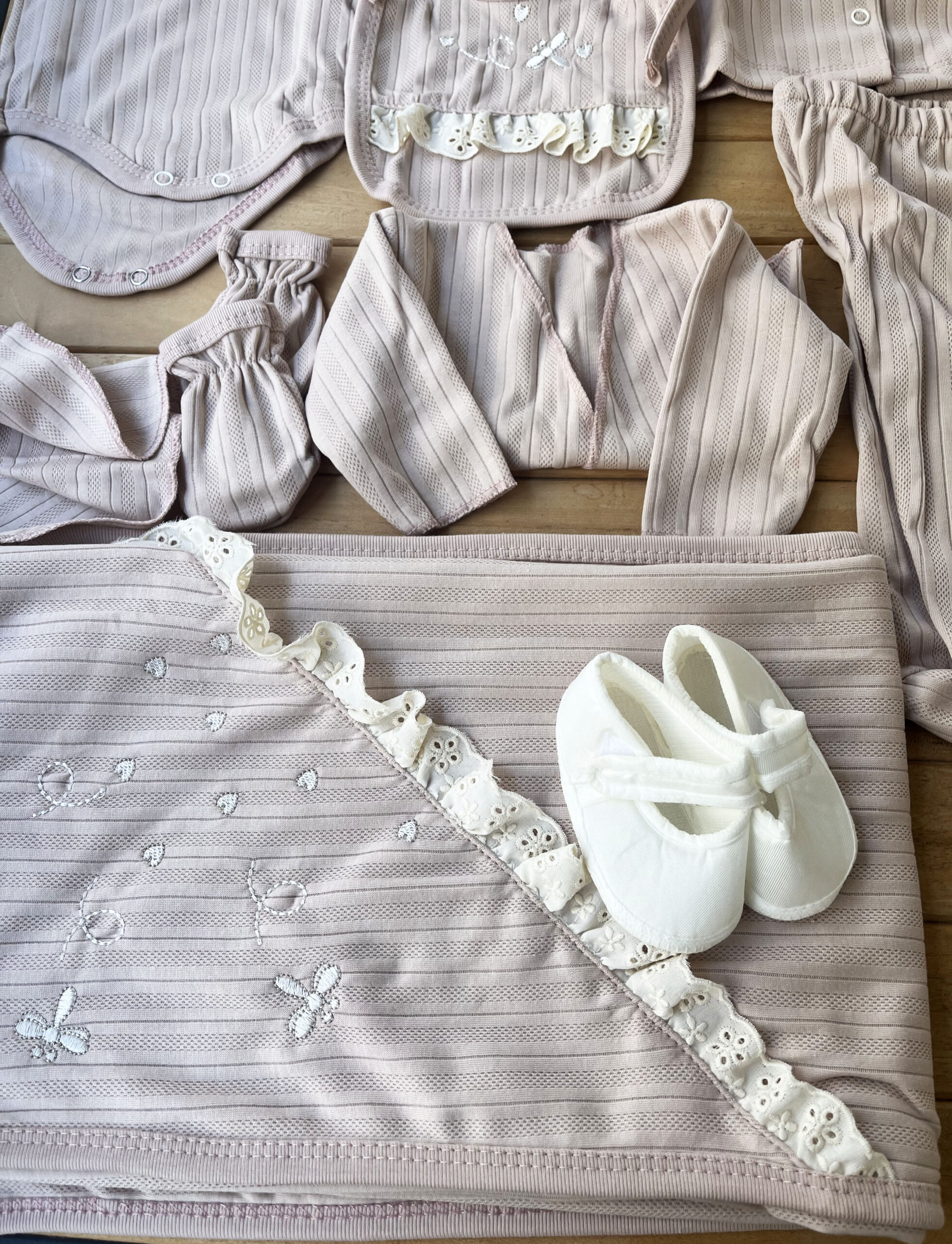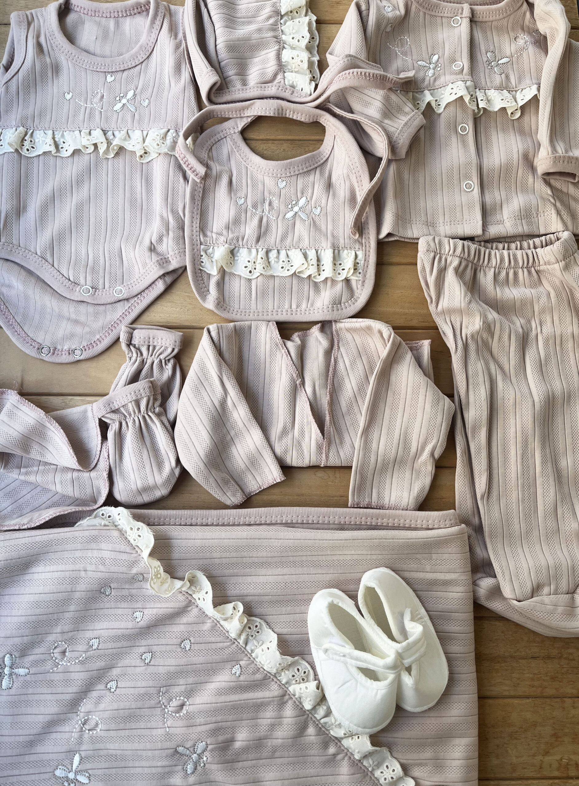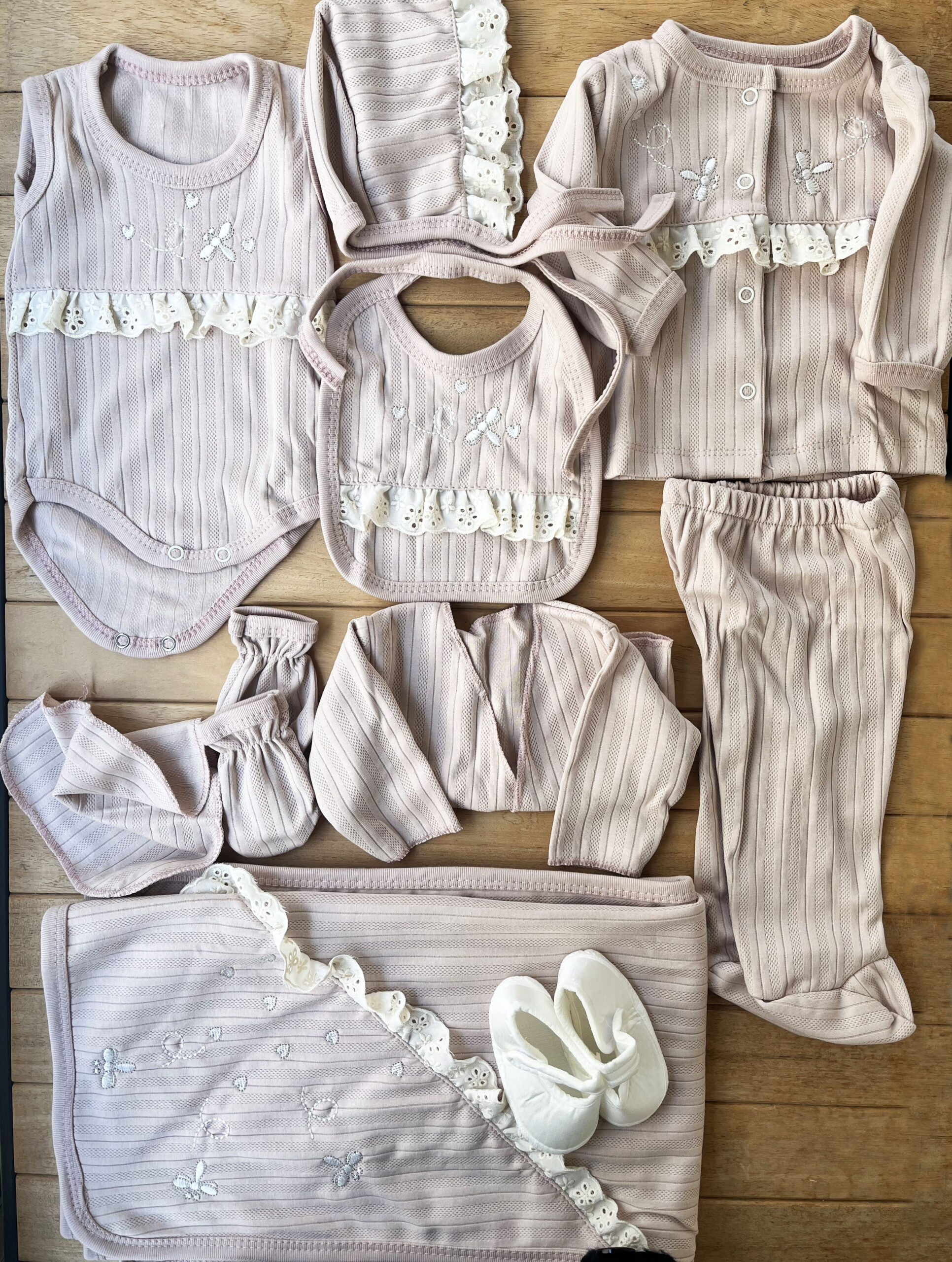 Gül kurusunun romantik tonu, fistonun zarafeti ve kelebek desenlerinin tatlılığıyla hazırlanan bu 10’lu hastane çıkışı, kız bebekler için en özel yenidoğan setlerinden biri! 🦋🌸🤍